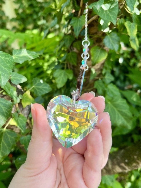 Cette suspension est ensuite assemblée à la main avec des jolies perles irisées qui reflètent joliment la lumière du soleil qui arrive dessus.