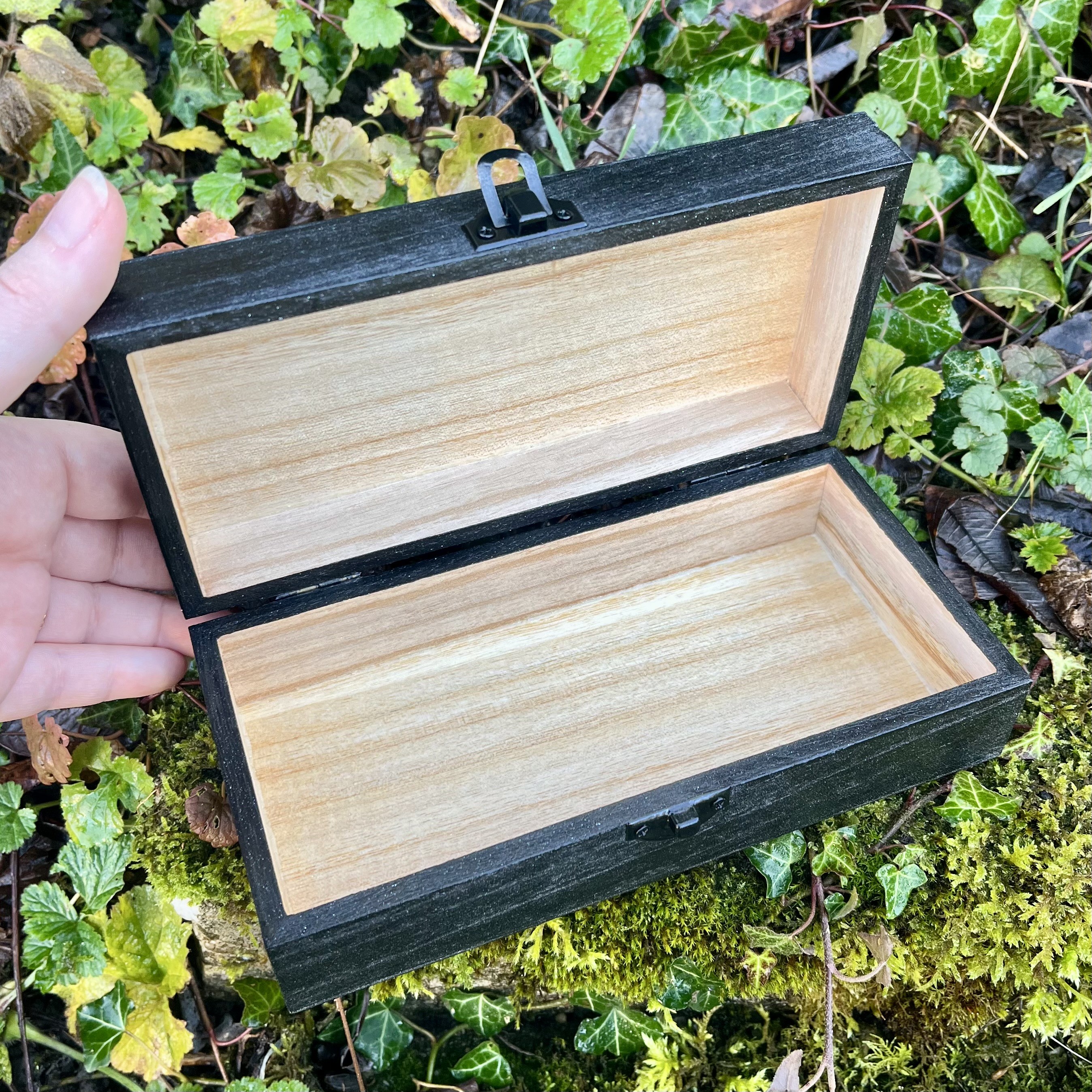 ✰ Coffret en bois, poncé, peint et verni puis décoré de lunes irisées faites main en résine epoxy ainsi que de 4 ornements en métal dans les coins.