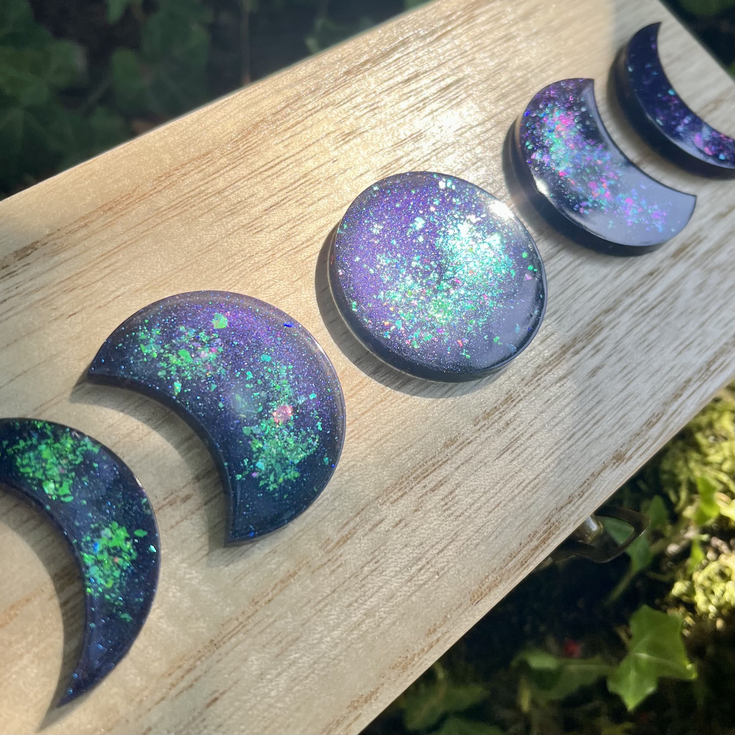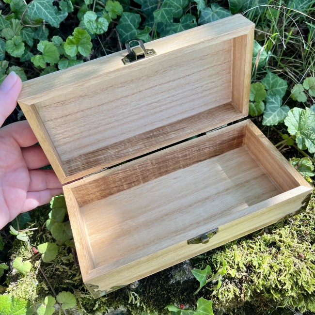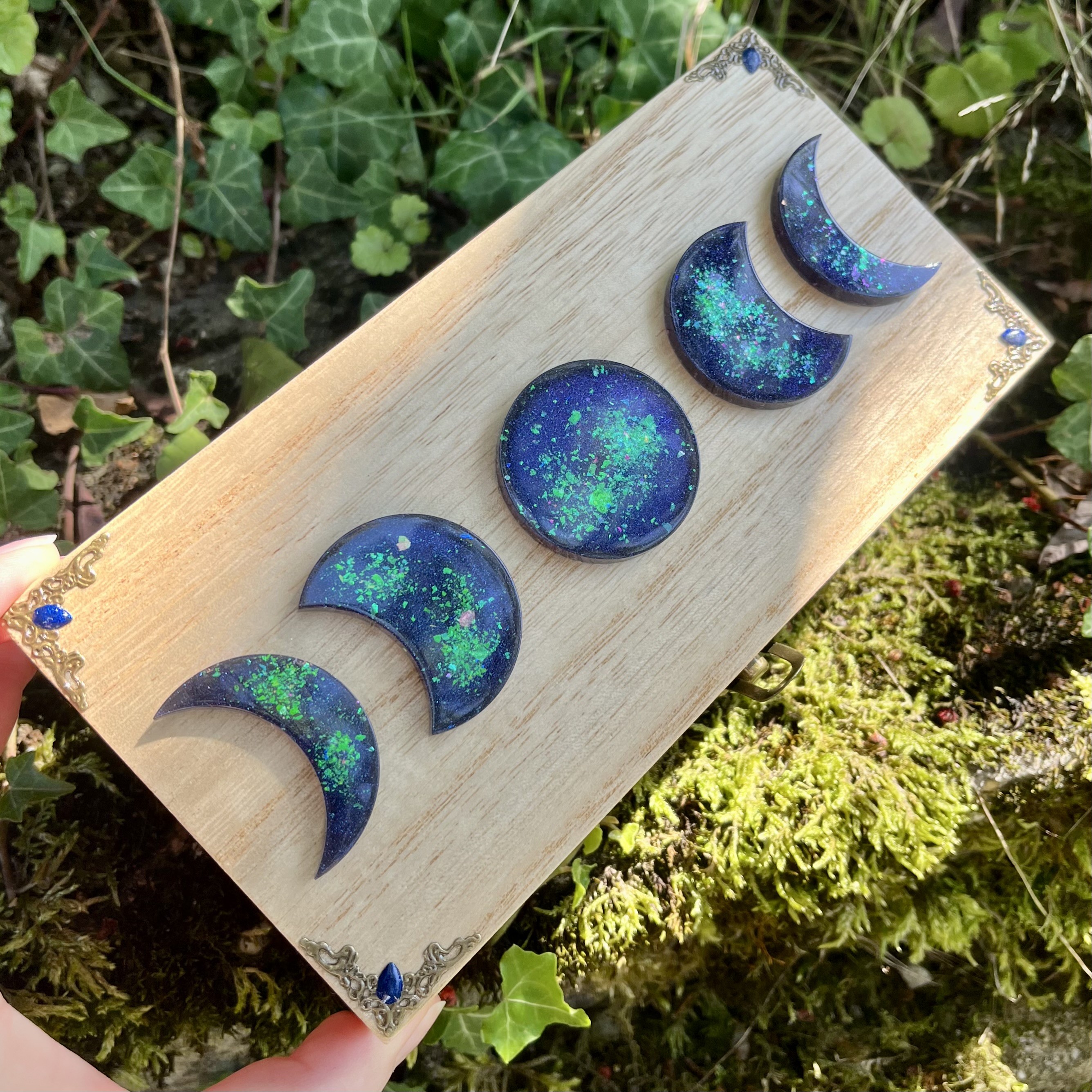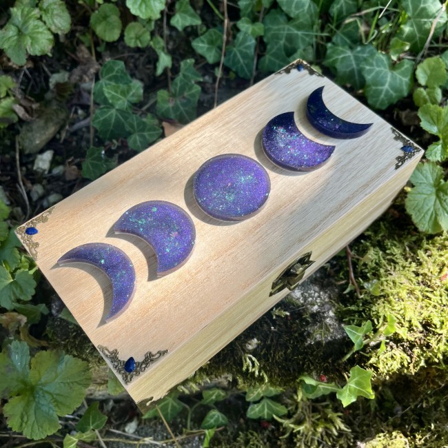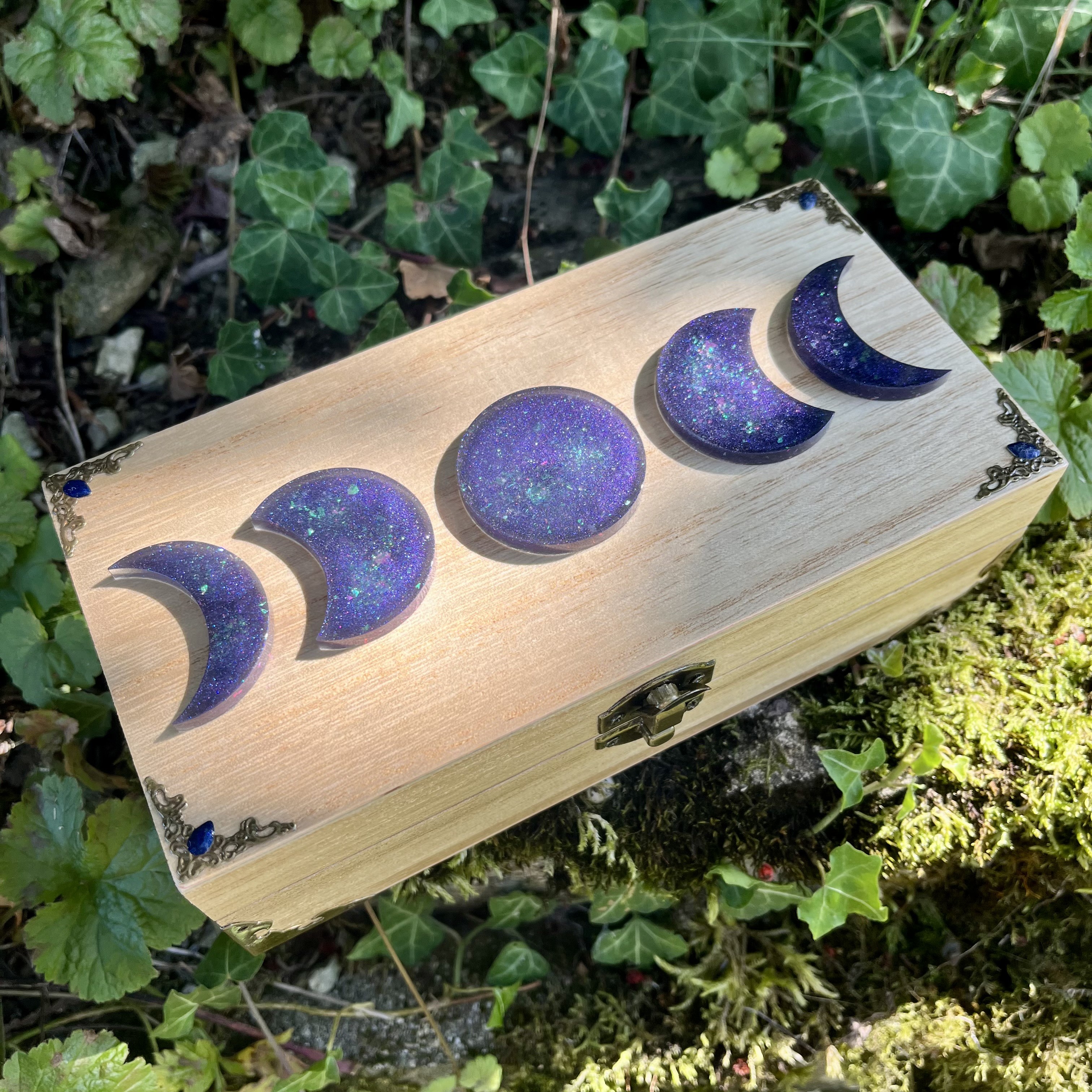 ✰ Coffret en bois, poncé, verni et décoré de lunes irisées faites main en résine epoxy ainsi que de 4 ornements en métal couleur bronze dans les coins.
