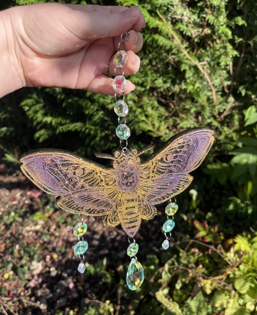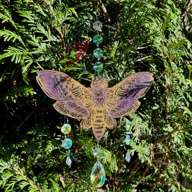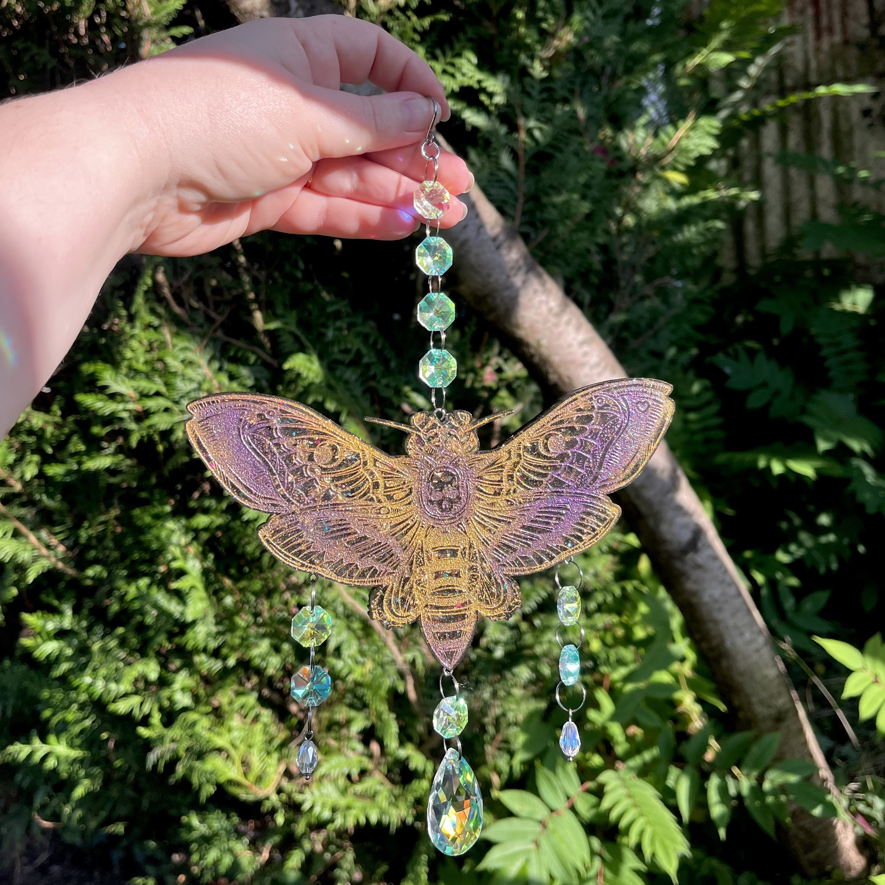 Cette suspension est assemblée à la main avec des jolies perles irisées qui reflètent joliment la lumière du soleil qui arrive dessus.