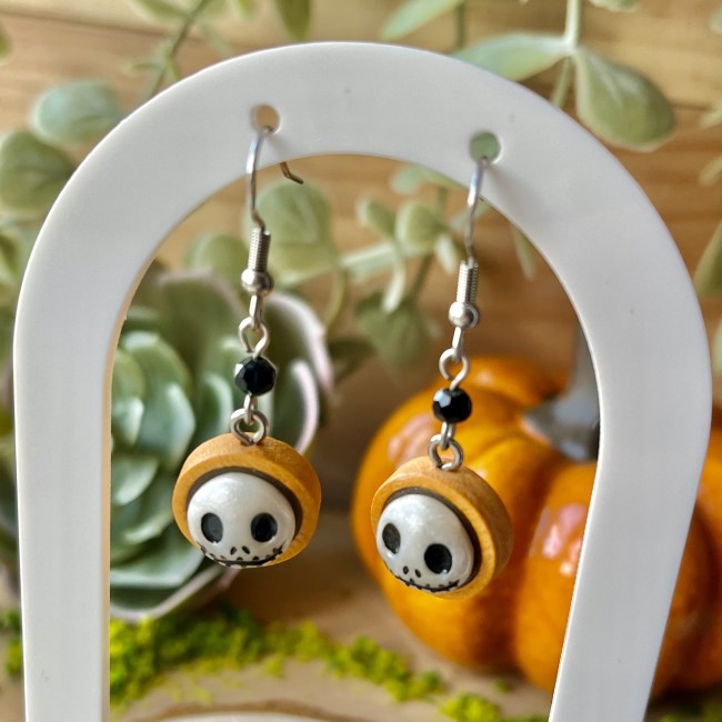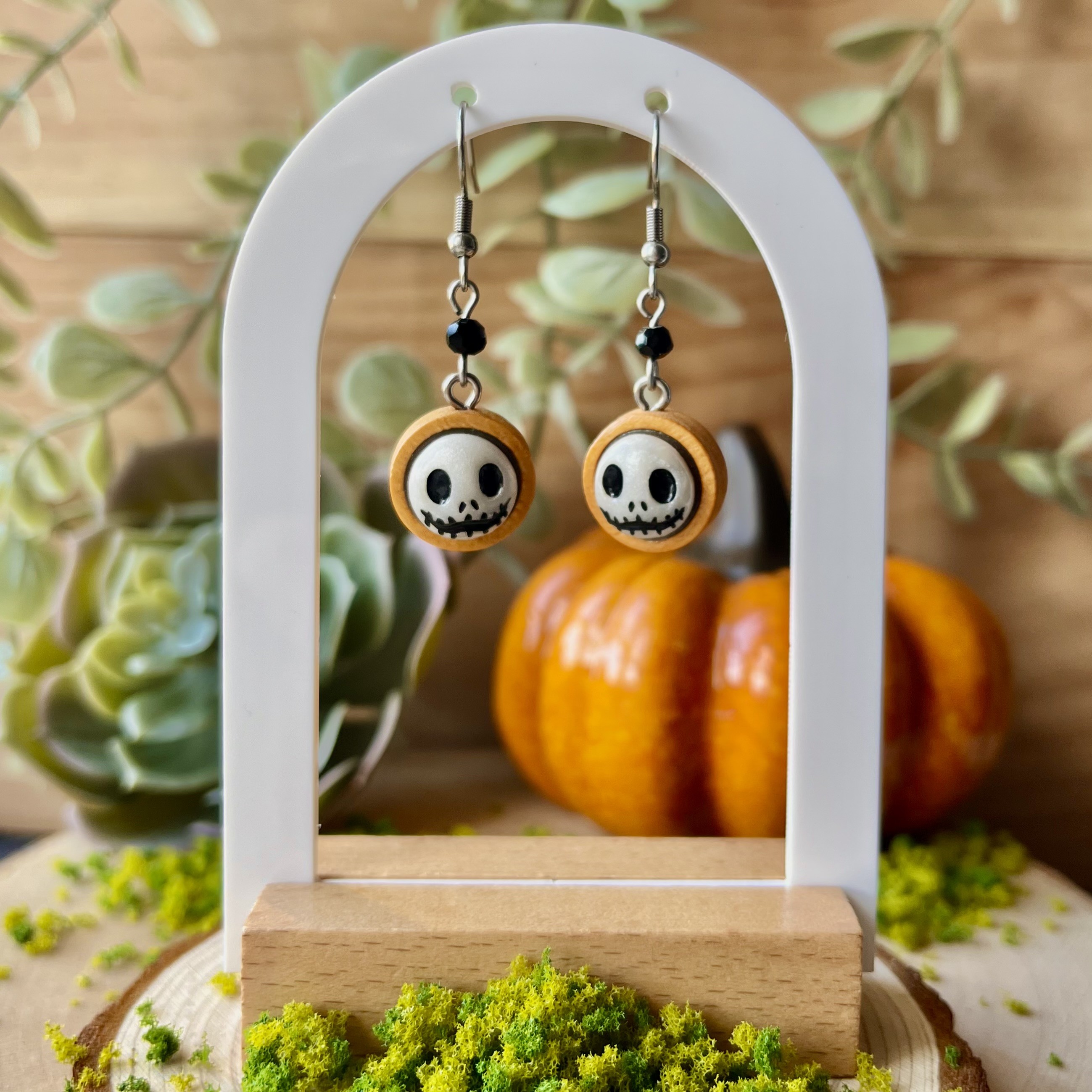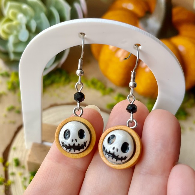 ✰ Paire de boucles d'oreilles têtes de Jack faite main en pâte polymère nacrée, sur des petits supports en bois