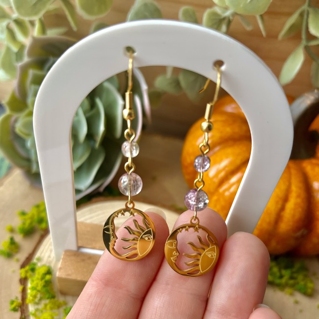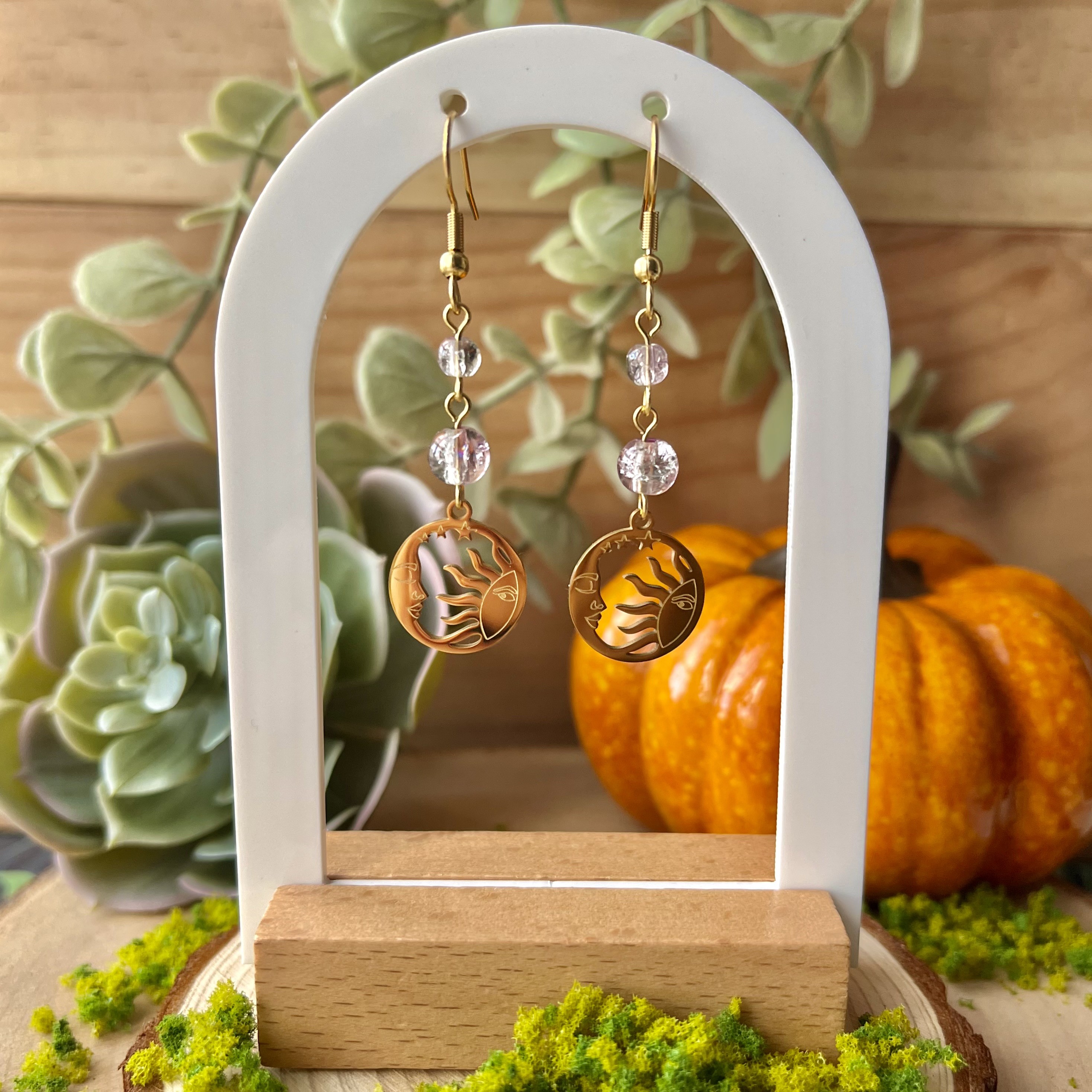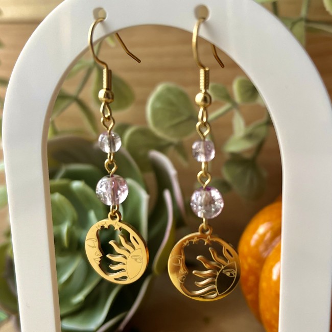 ✰ Paire de boucles d'oreilles lunes montée main, avec breloques en acier inoxydable et perles en verre.
