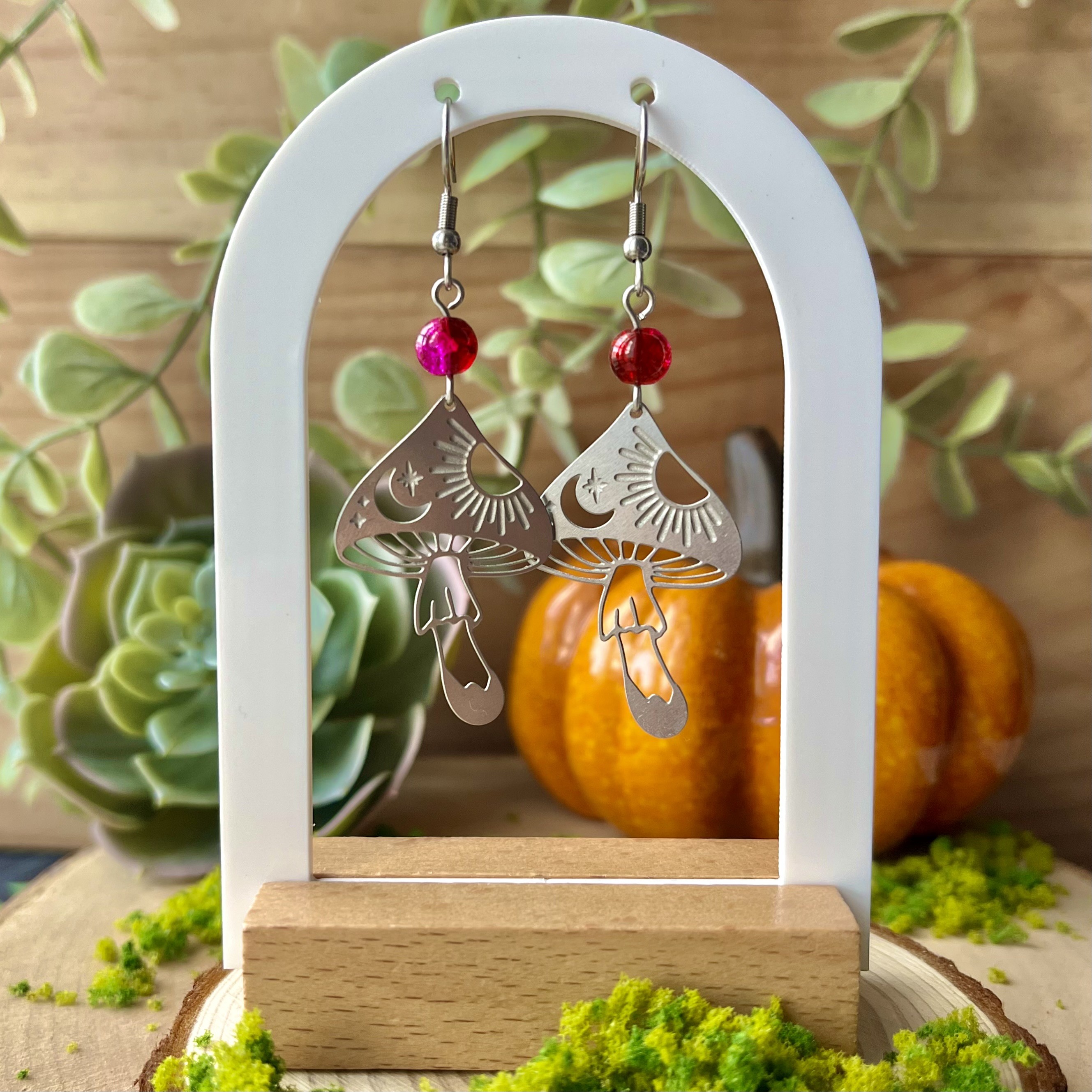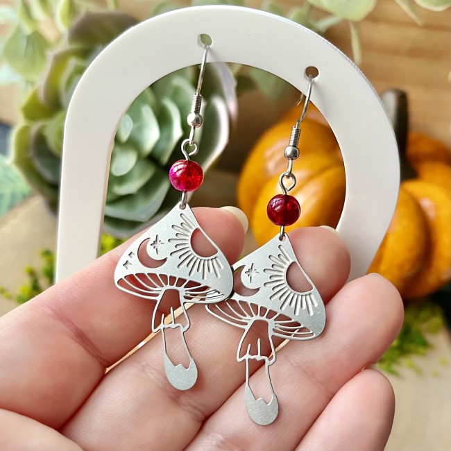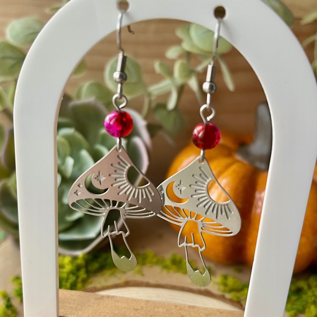 ✰ Paire de boucles d'oreilles champignons montée main, avec breloques en acier inoxydable et perles en verre.