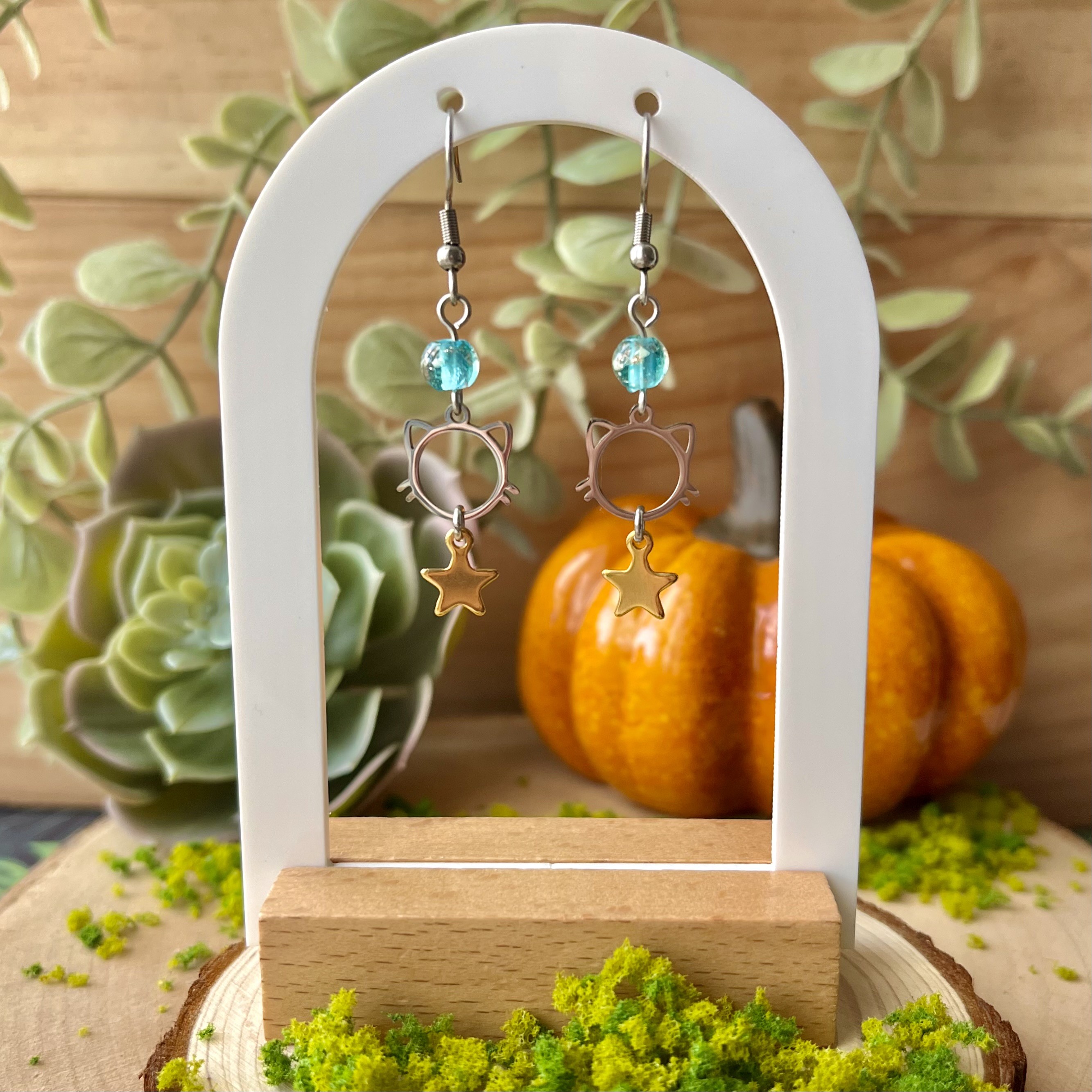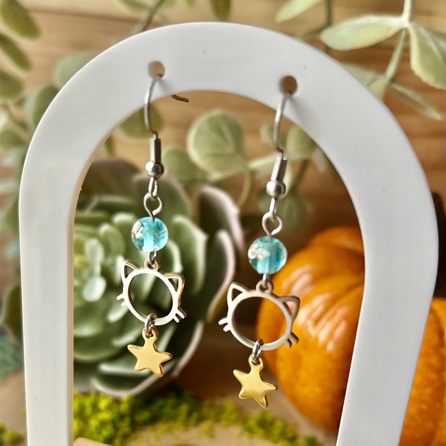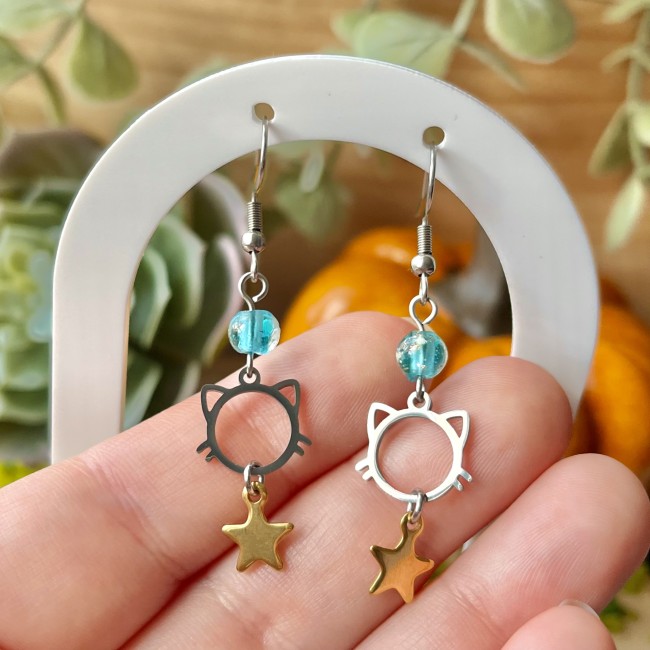 ✰ Paire de boucles d'oreilles chats montée main, avec breloques en acier inoxydable et perles en verre.
