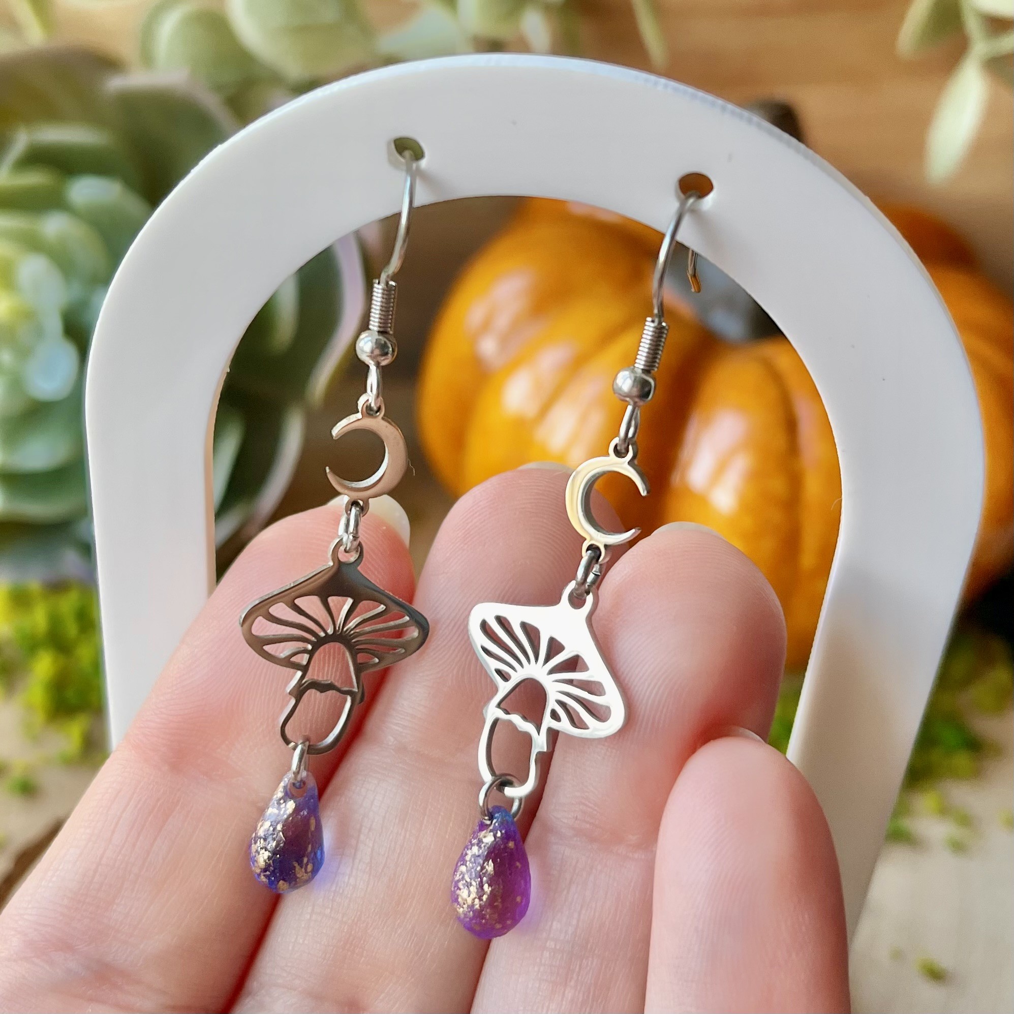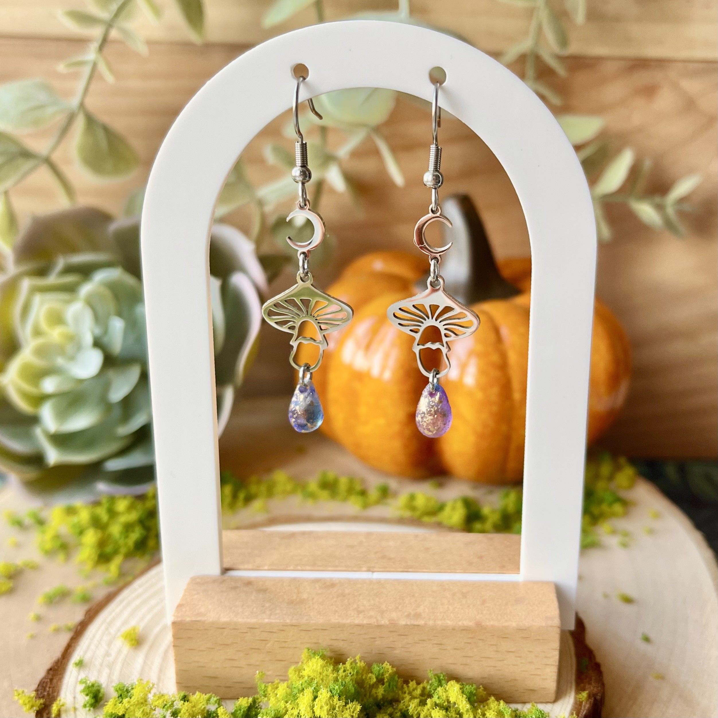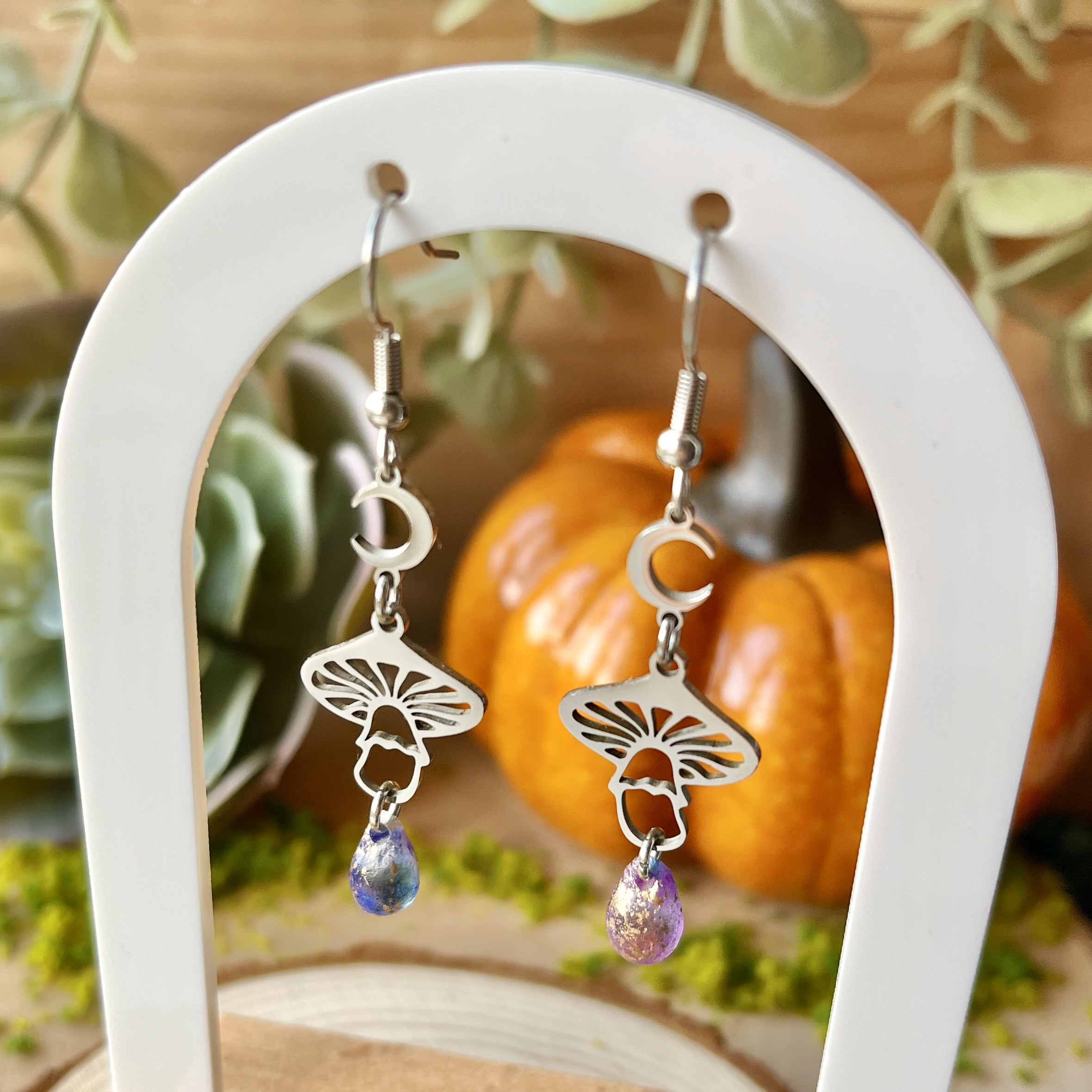 ✰ Paire de boucles d'oreilles ChampiLunes montée main, avec breloques en acier inoxydable et perles en verre