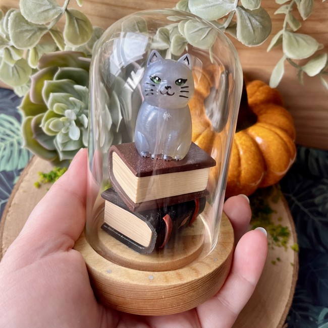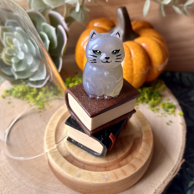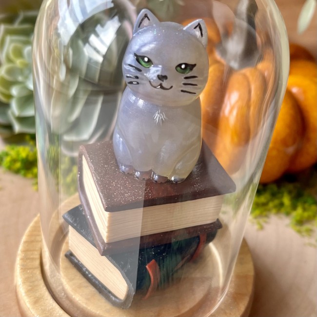✰ Figurine Chat faite main en résine epoxy, elle est collée sur 2 livres faits main en pâte polymère, les détails ont été peints à la main et la figurine a ensuite été entièrement vernie puis collée sur la base en bois de la cloche.