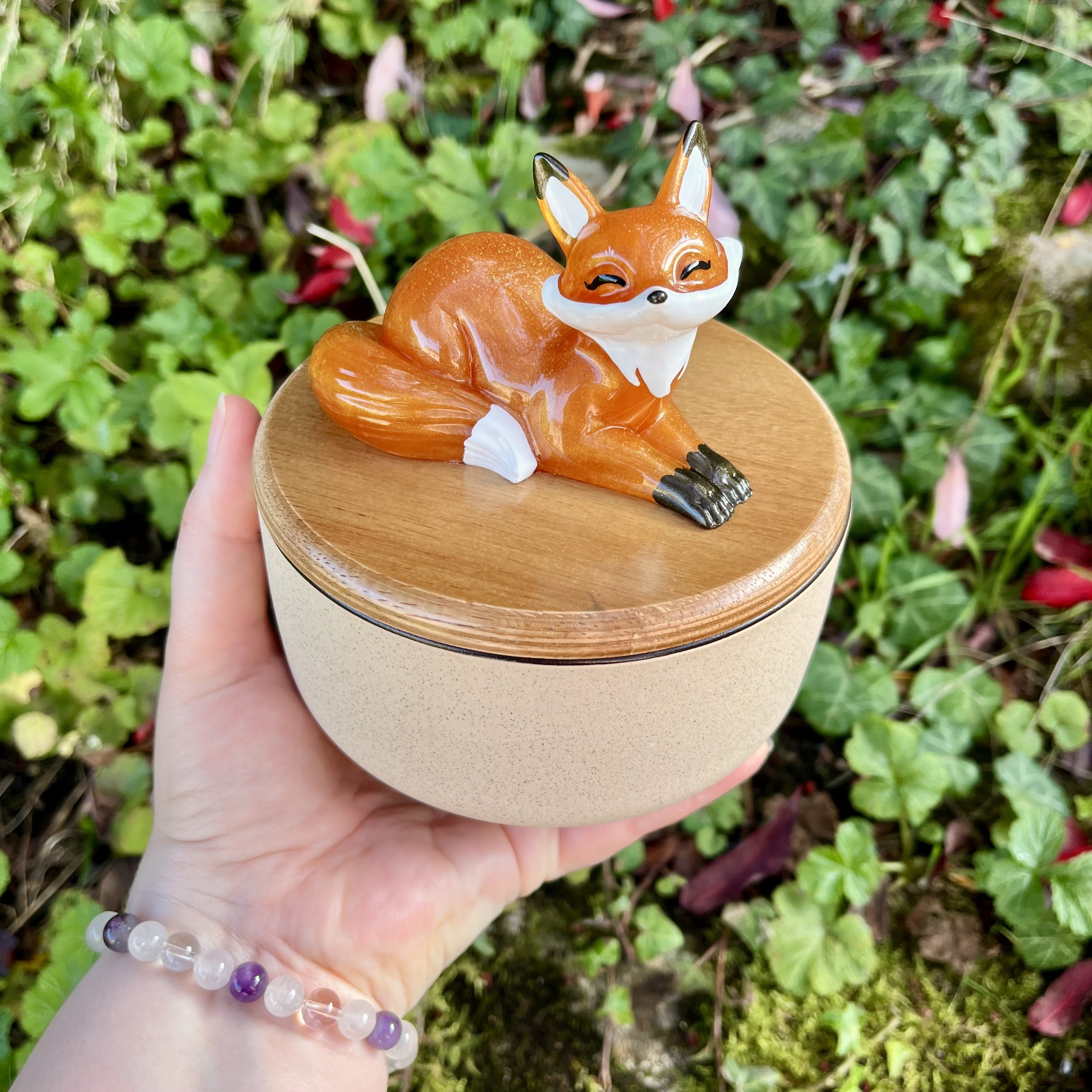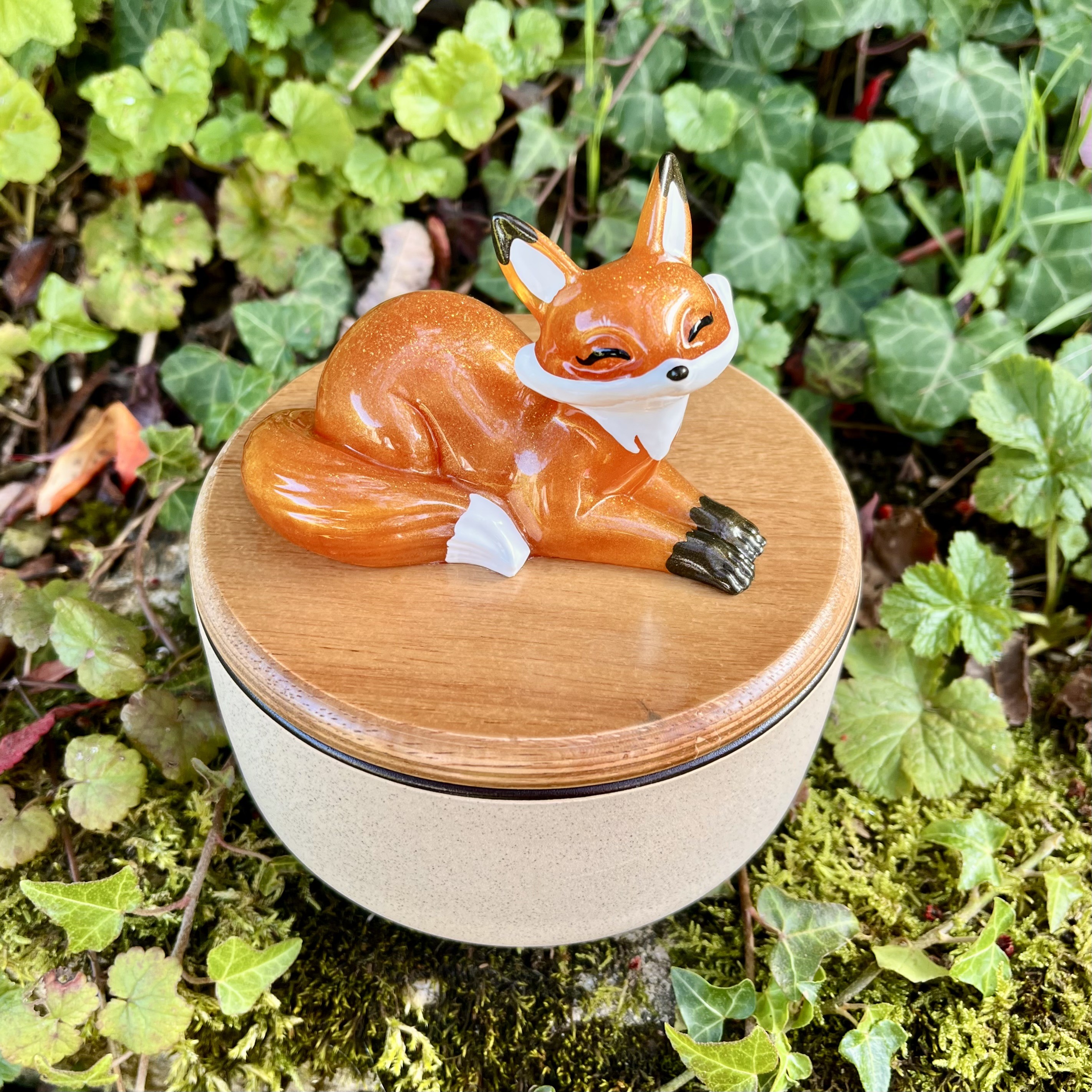Les détails ont été peints à la main puis le couvercle et le renard ont été vernis.