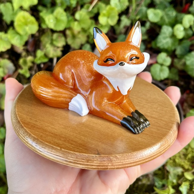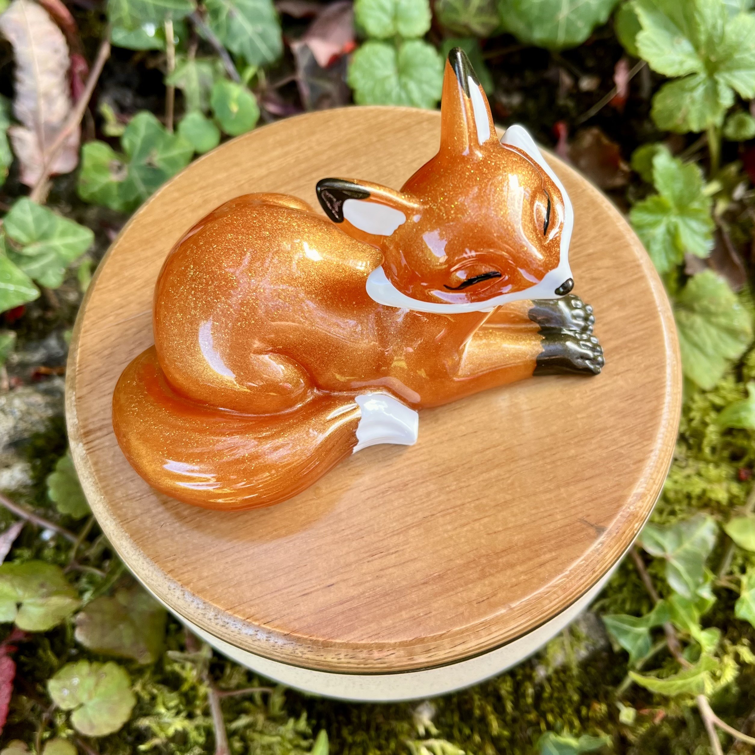 Décoré d'un joli renard fait main en résine époxy avec inclusions de fines paillettes holographiques.