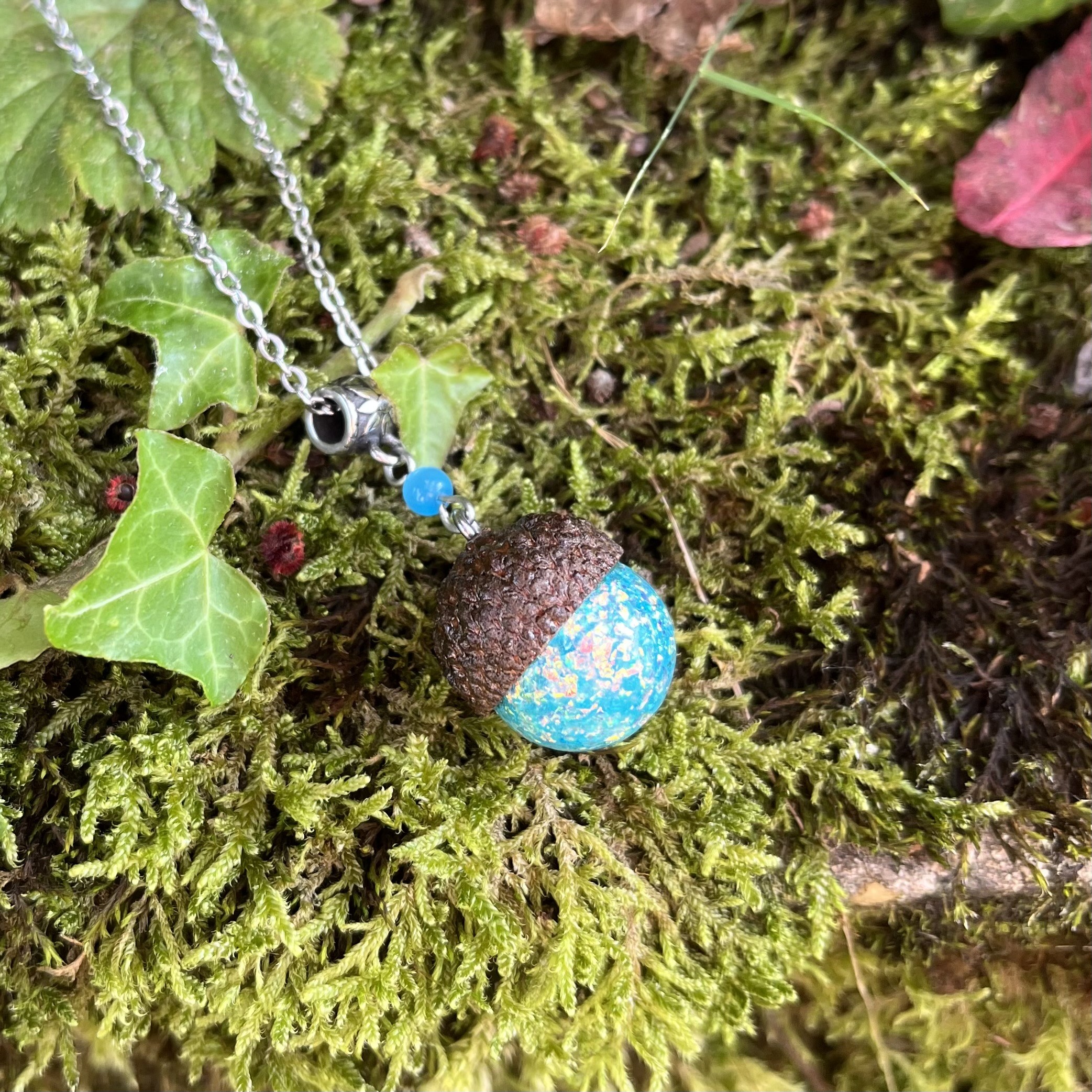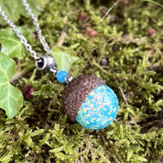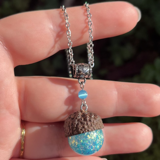 ✰ Collier gland avec cupule naturelle ramassée, séchée et vernie par mes soins, assemblée avec une sphère faite main en résine (inclusion de pigment irisé)