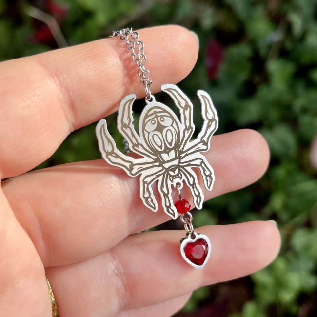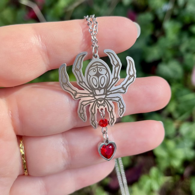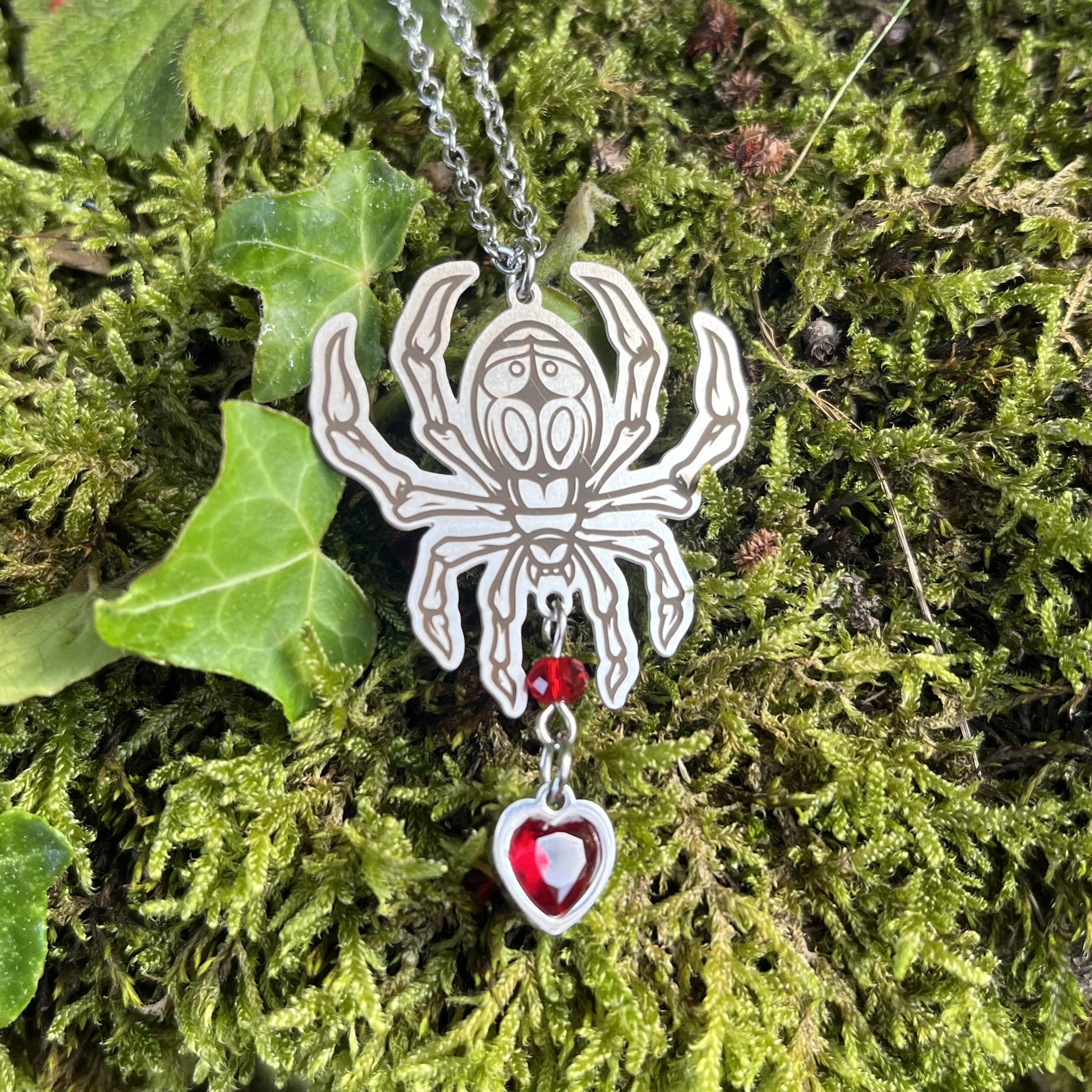 ✰ Collier araignée monté main avec pendentif en acier inoxydable, une jolie perle en verre rouge et un cœur en acier et verre rouge