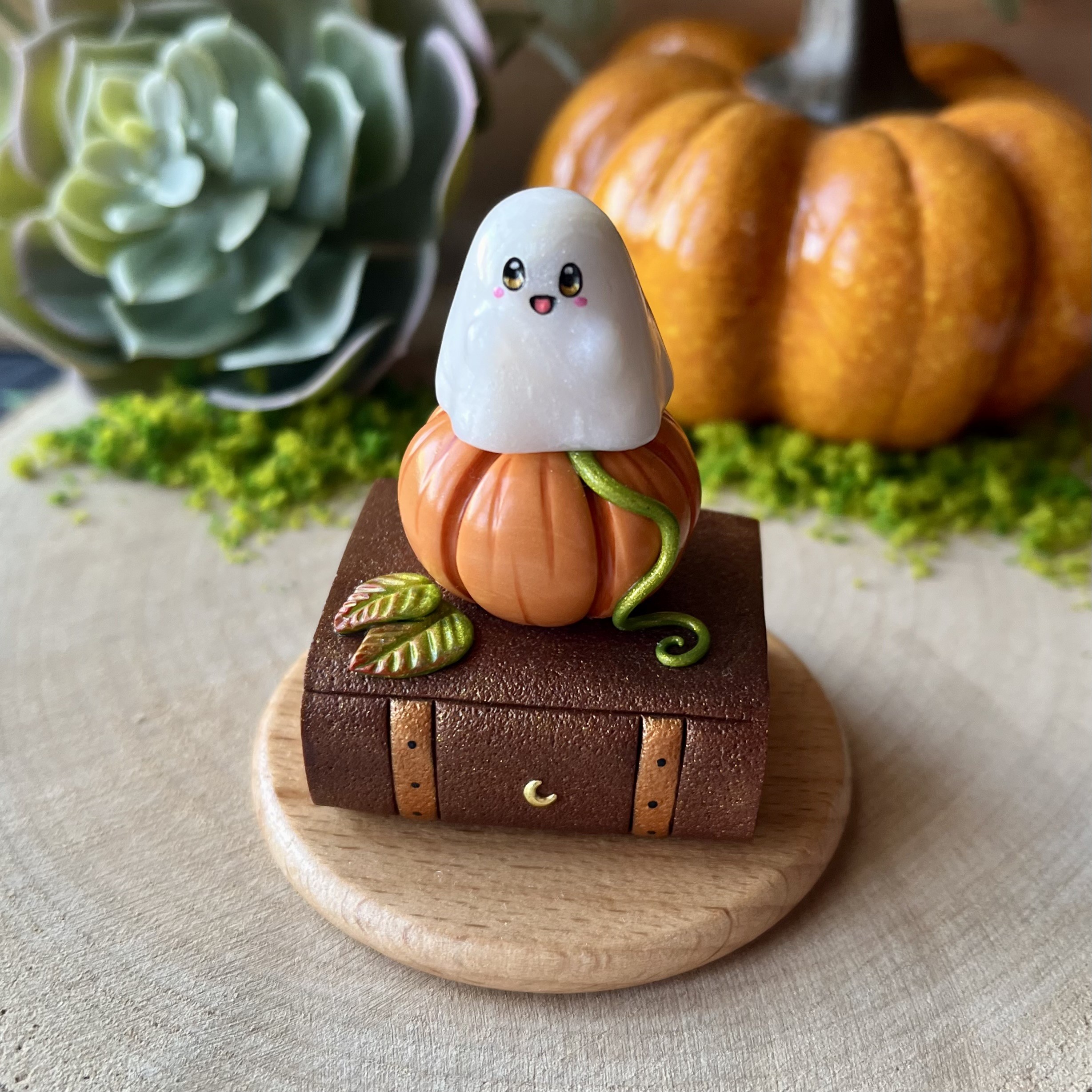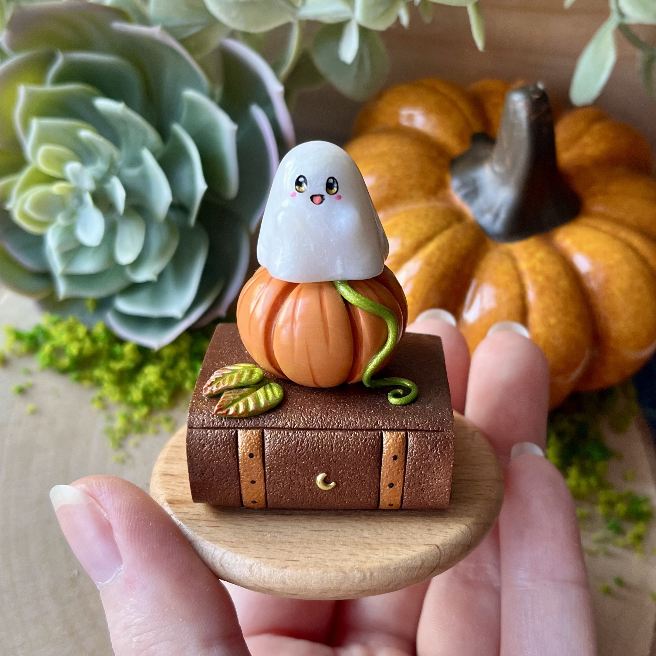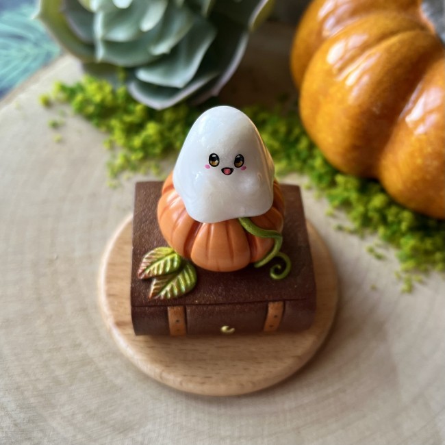 â° Figurine fantôme faite main en pâte polymère, les détails ont été peints à la main et la figurine a ensuite été entièrement vernie puis collée sur une base en bois.