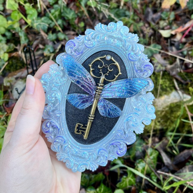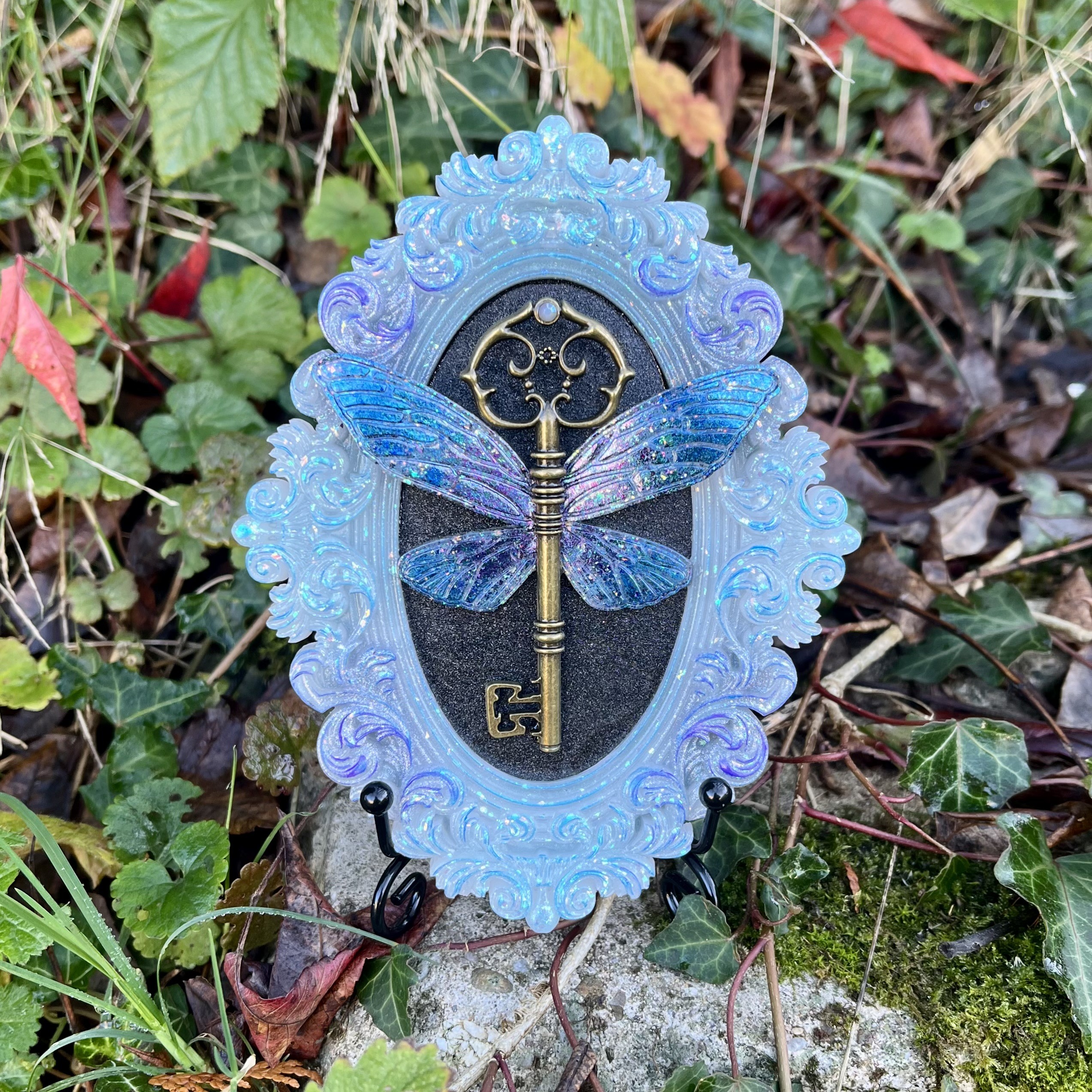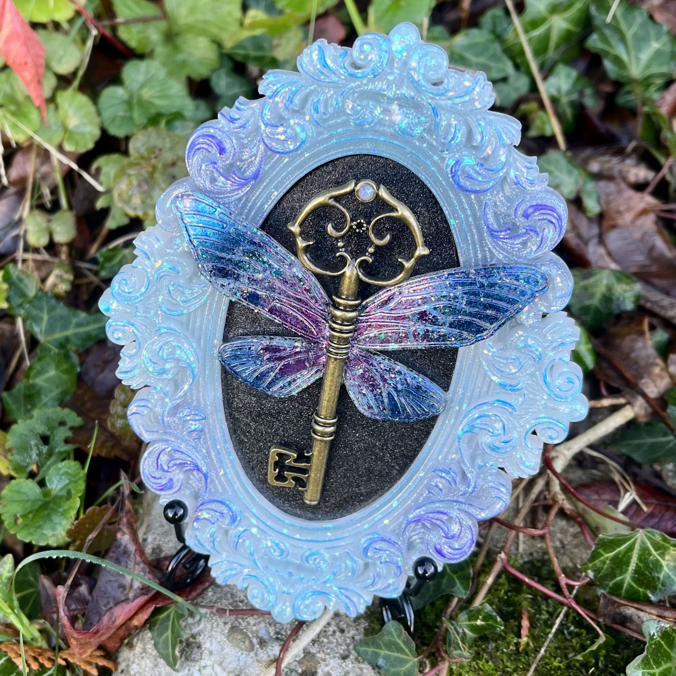 Clé en métal décorée d'ailes faites main en résine epoxy, avec pigments qui changent de couleur selon l'angle de vue.