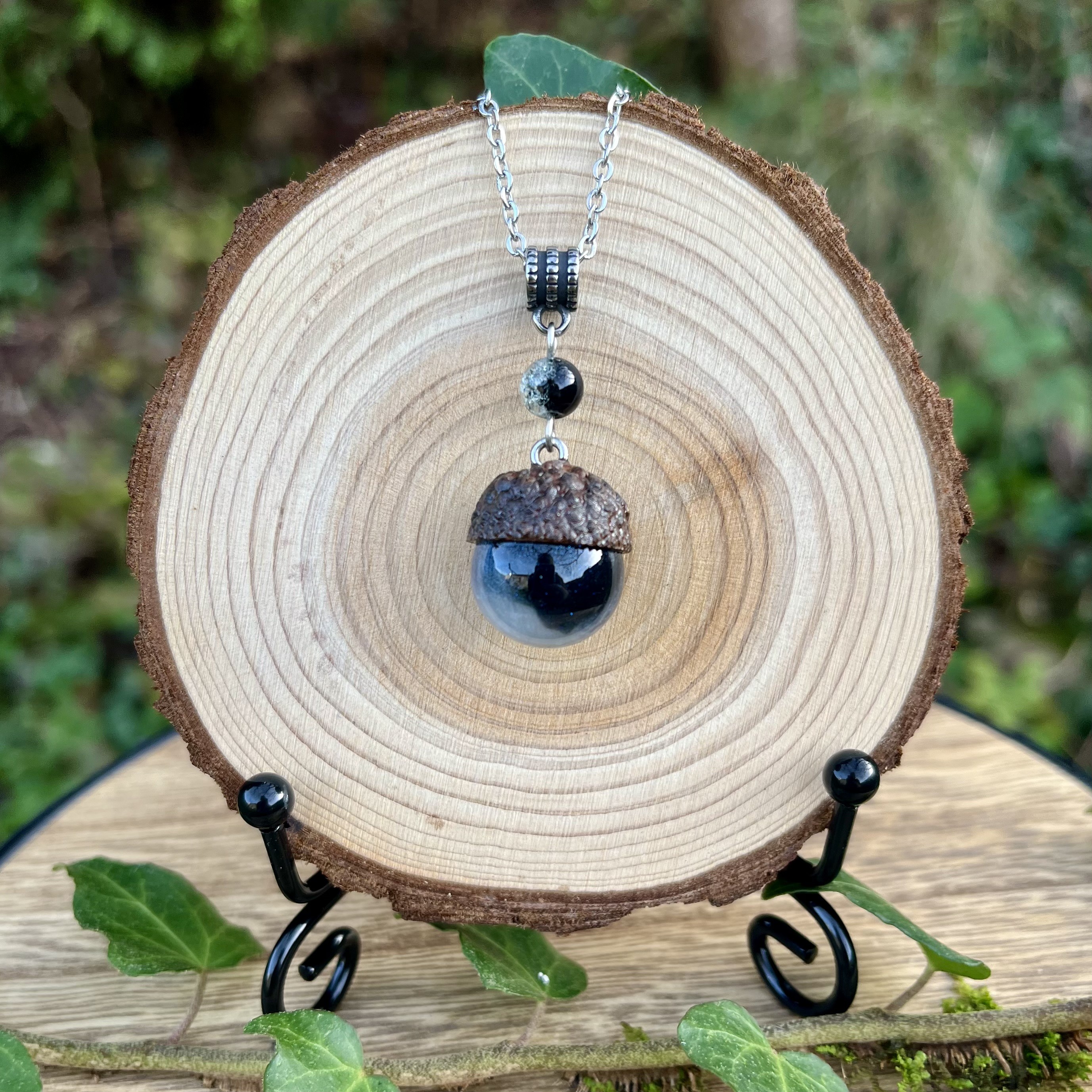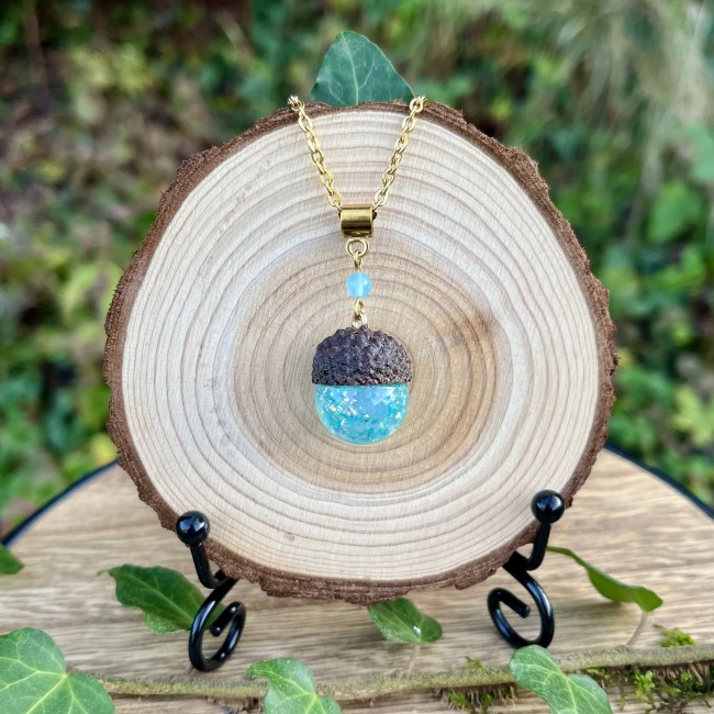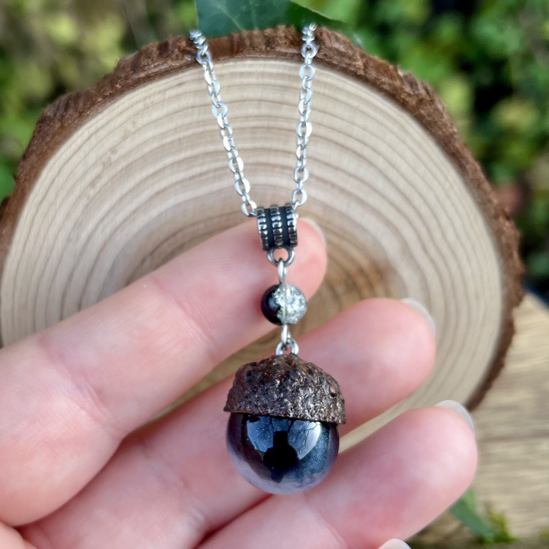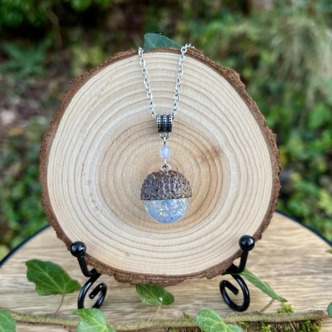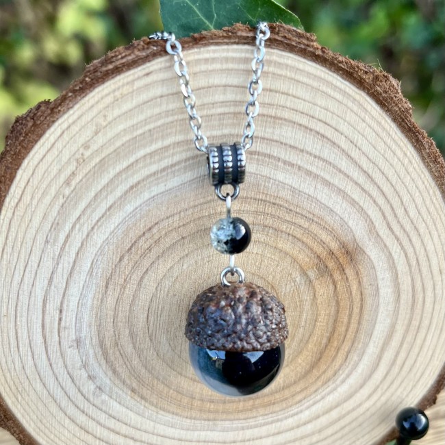 ✰ Collier gland avec cupule naturelle ramassée, séchée et vernie par mes soins, assemblée avec une sphère faite main en résine epoxy, inclusion de pigment irisé pour un rendu unique ✨