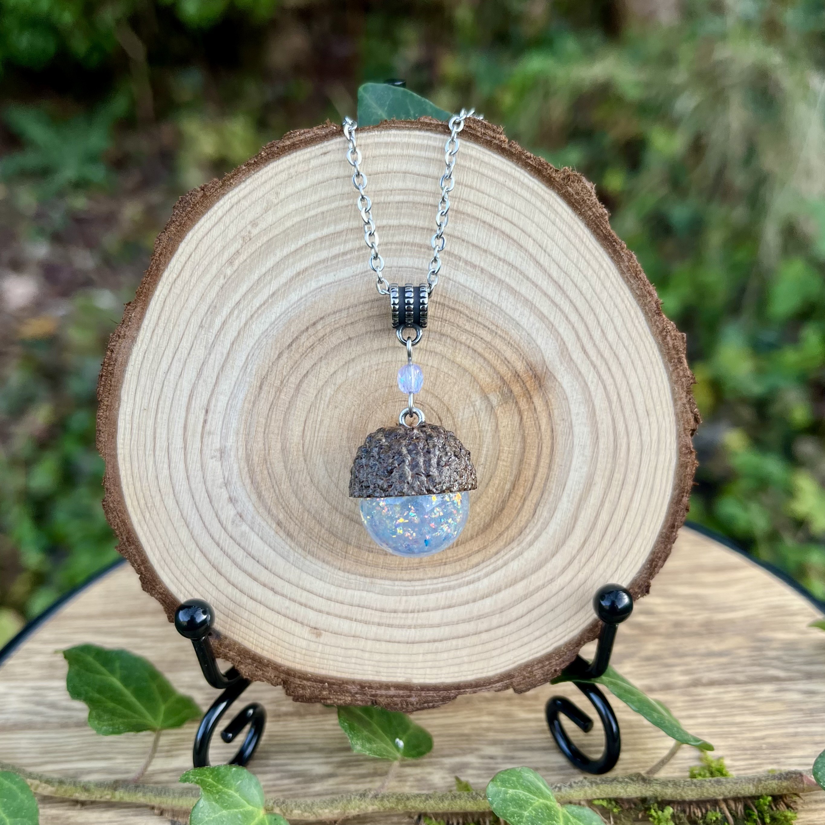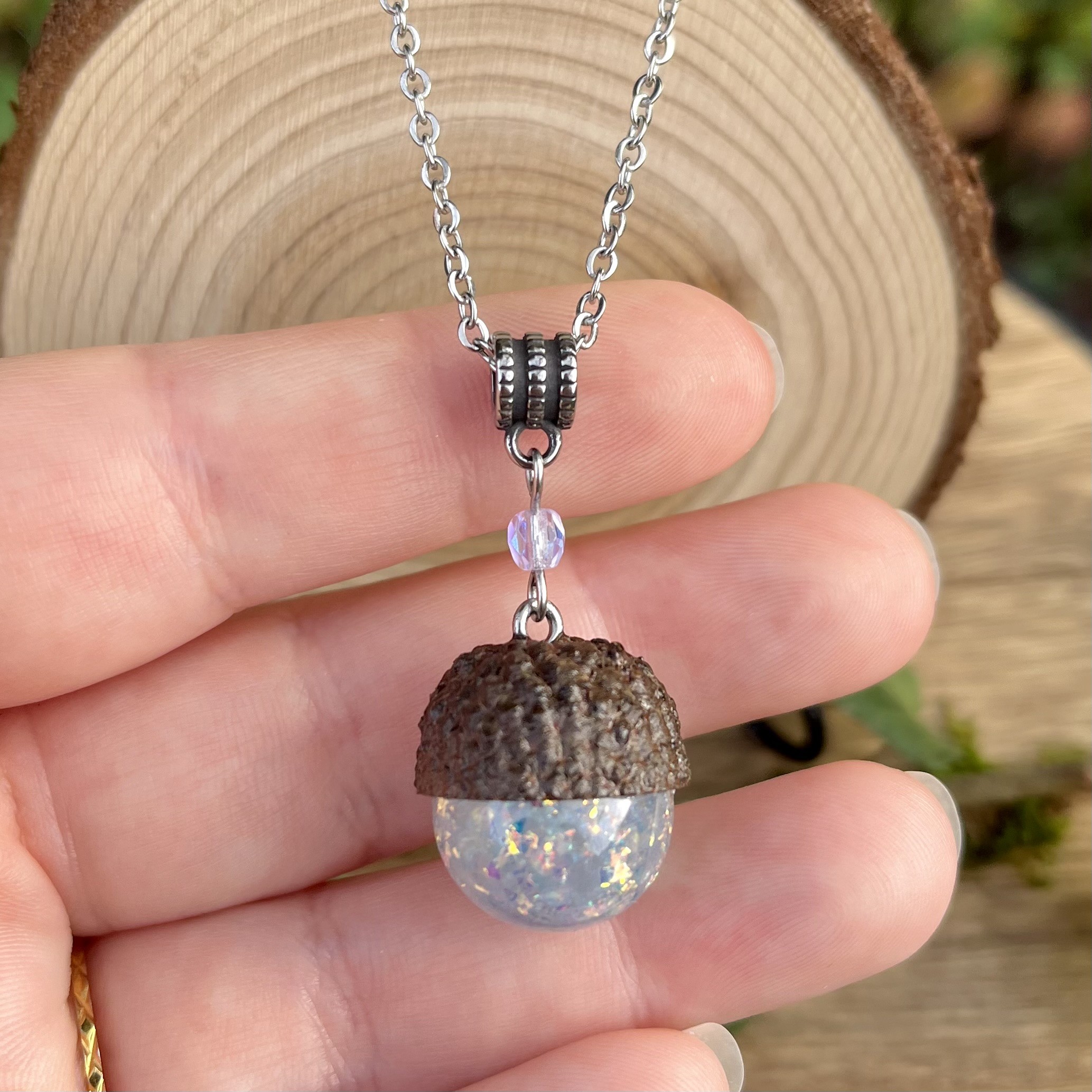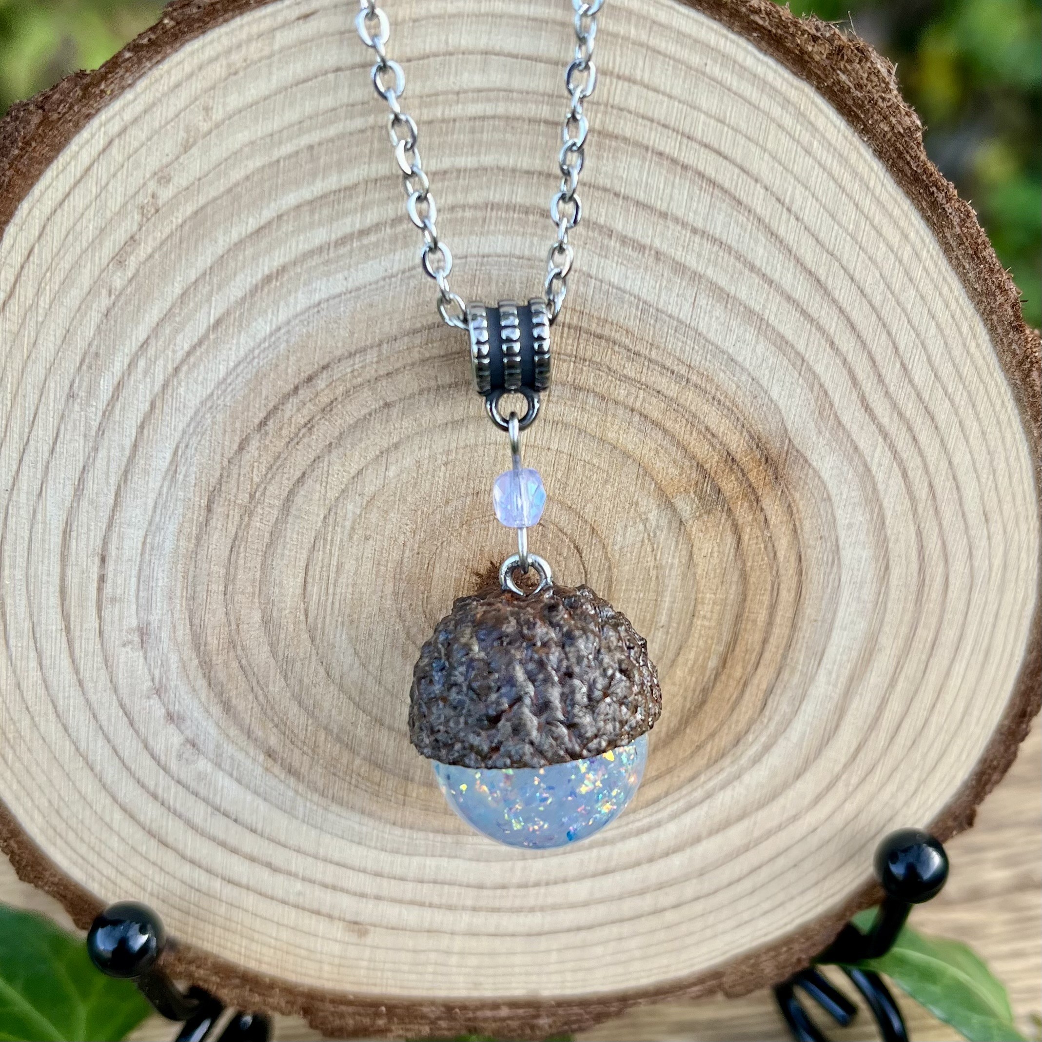 ✰ Collier gland avec cupule naturelle ramassée, séchée et vernie par mes soins, assemblée avec une sphère faite main en résine epoxy, inclusion de pigment irisé et paillettes pour un rendu unique ✨