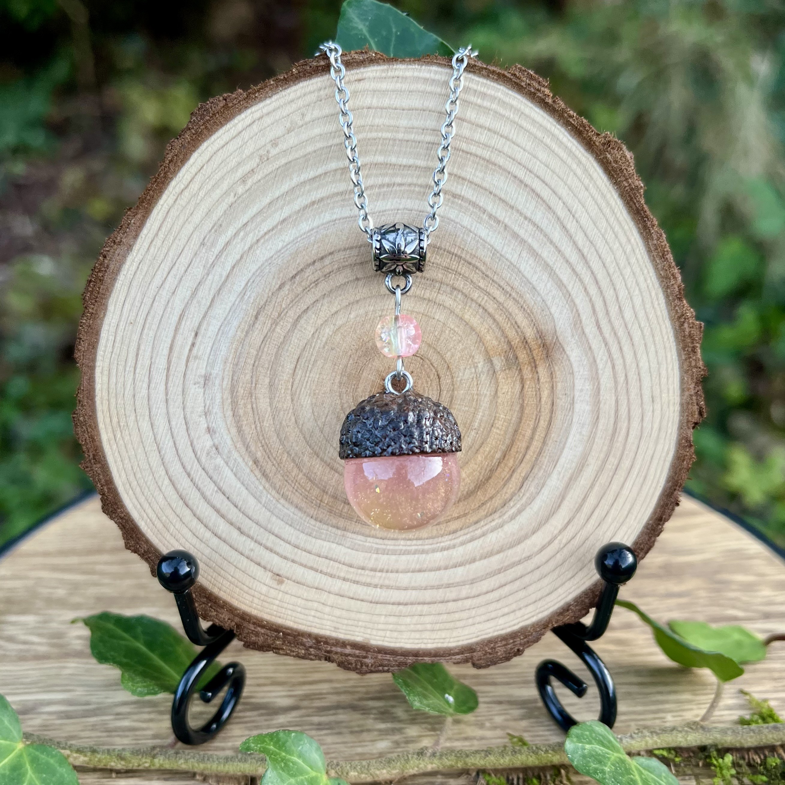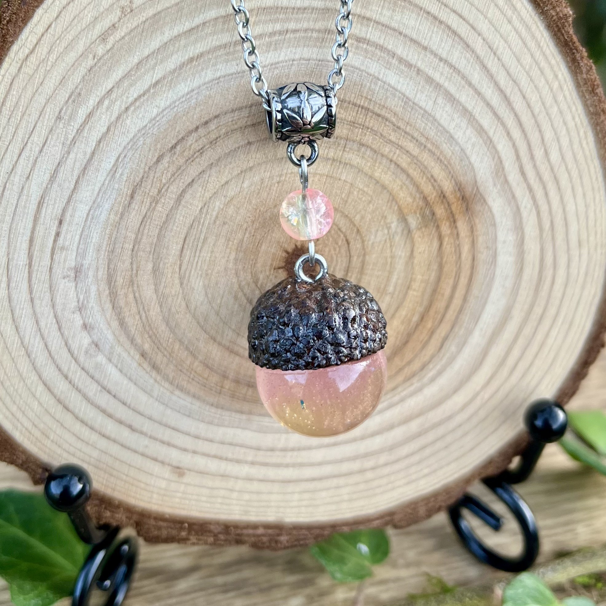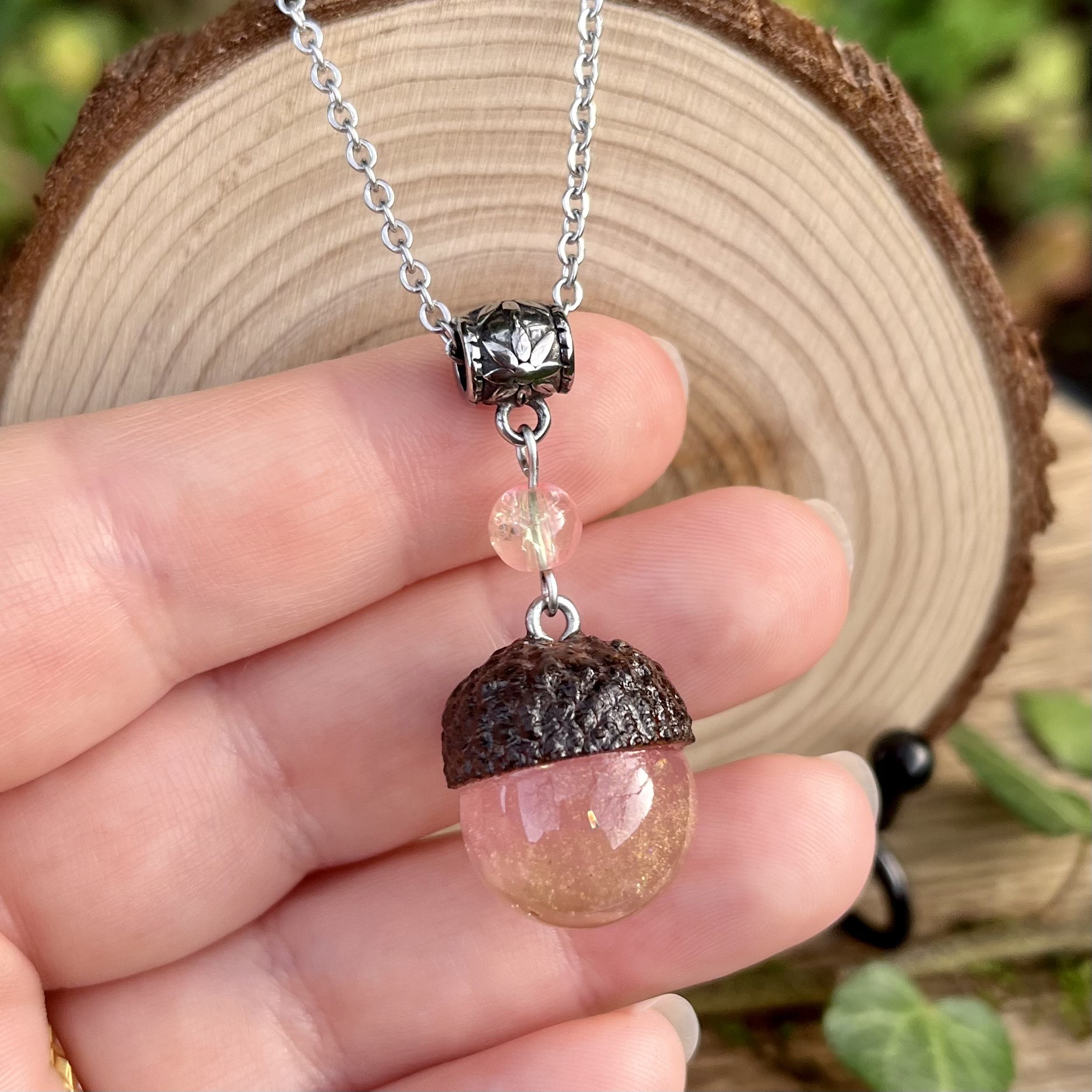 ✰ Collier gland avec cupule naturelle ramassée, séchée et vernie par mes soins, assemblée avec une sphère faite main en résine epoxy, inclusion de pigment irisé et paillettes pour un rendu unique ✨
