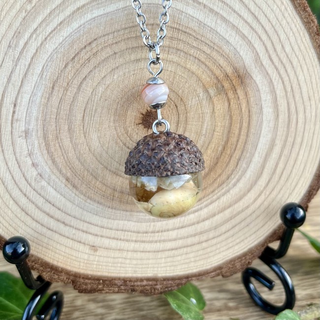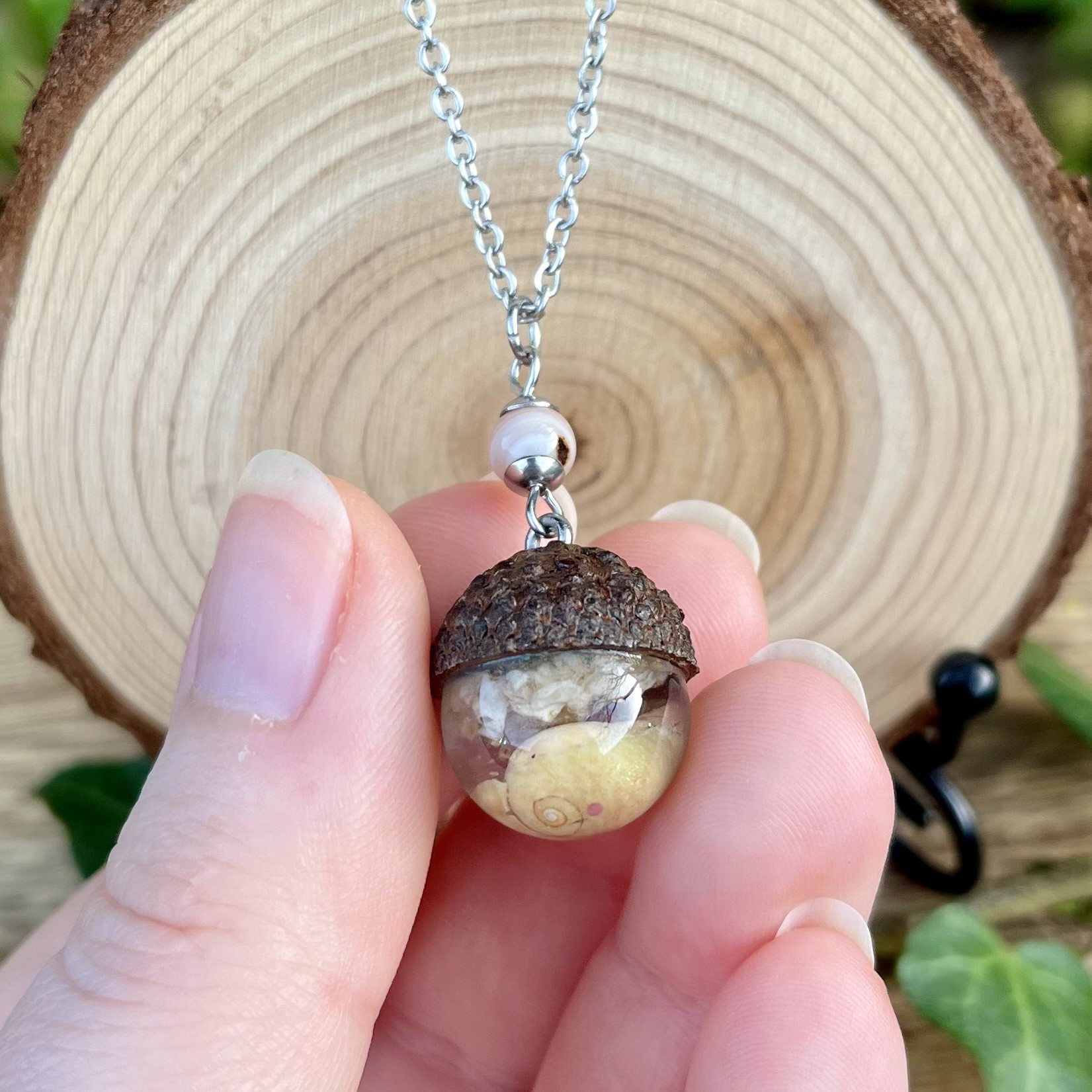 ✰ Collier gland avec cupule naturelle ramassée, séchée et vernie par mes soins, assemblée avec une sphère faite main en résine epoxy, inclusion de pigment irisé, de sable et d'un coquillage pour un rendu unique ✨
