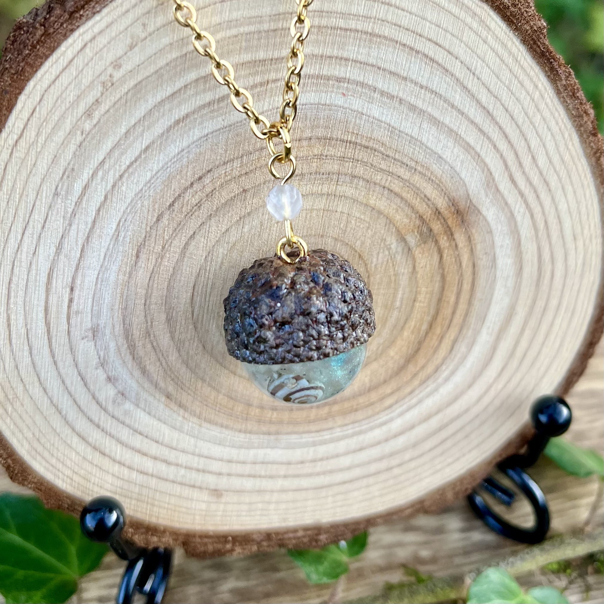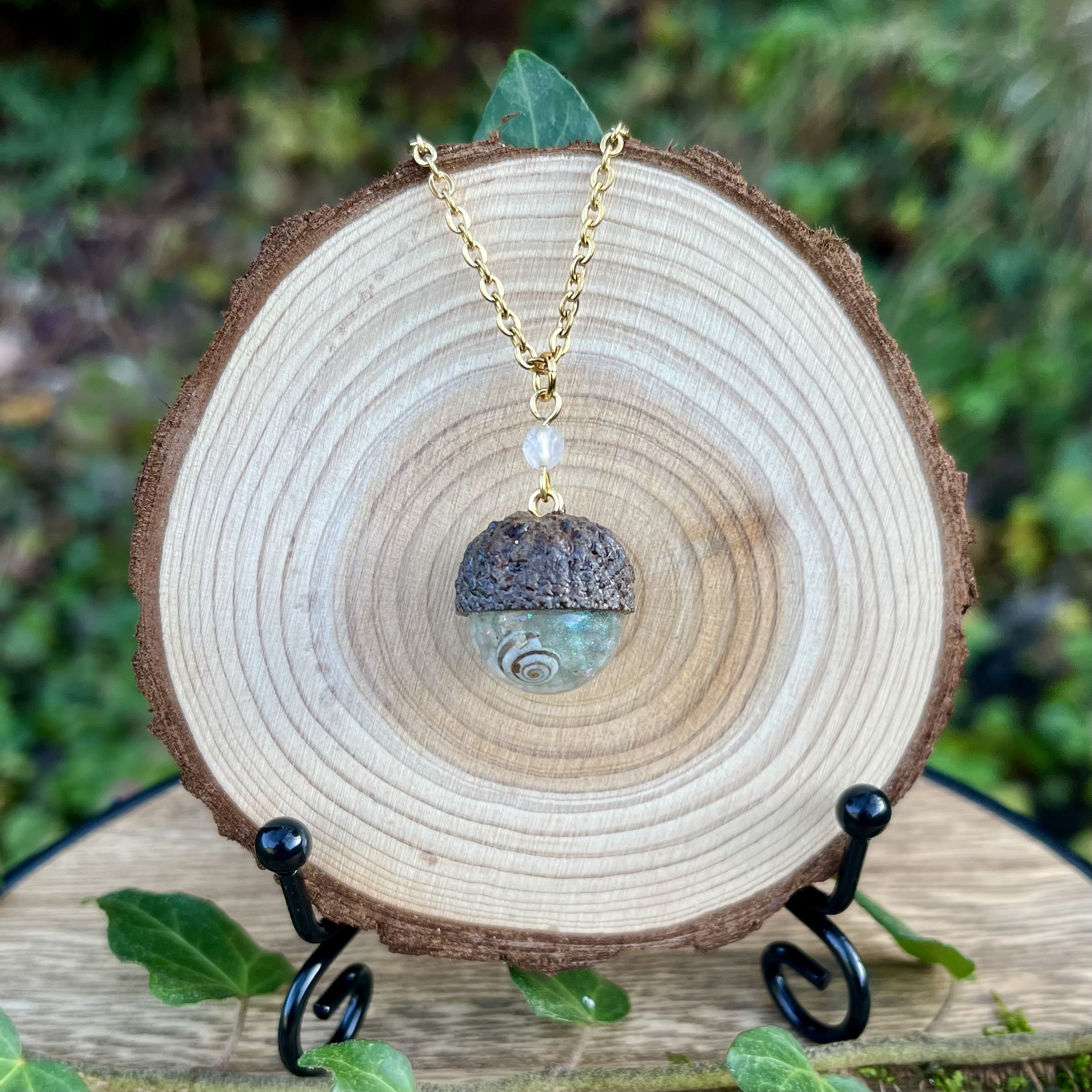 ✰ Collier gland avec cupule naturelle ramassée, séchée et vernie par mes soins, assemblée avec une sphère faite main en résine epoxy, inclusion de pigment irisé, de sable et d'un coquillage pour un rendu unique ✨