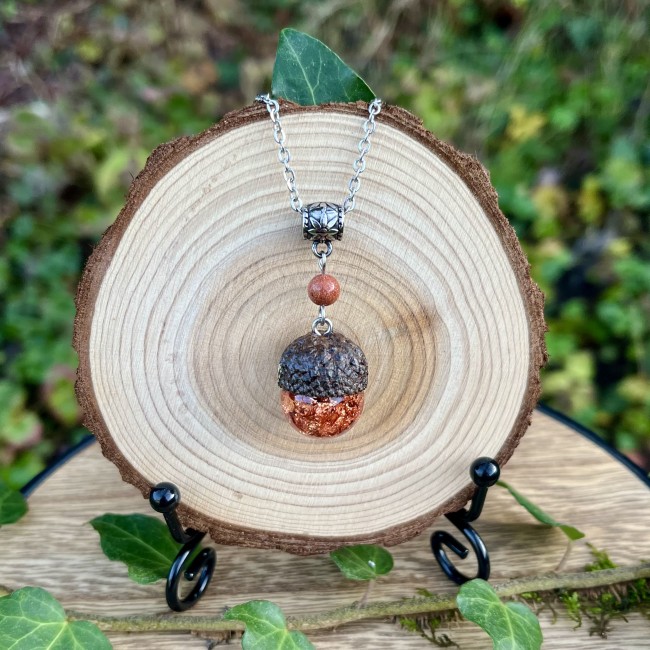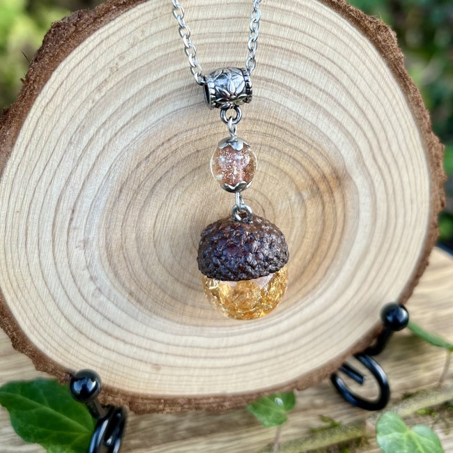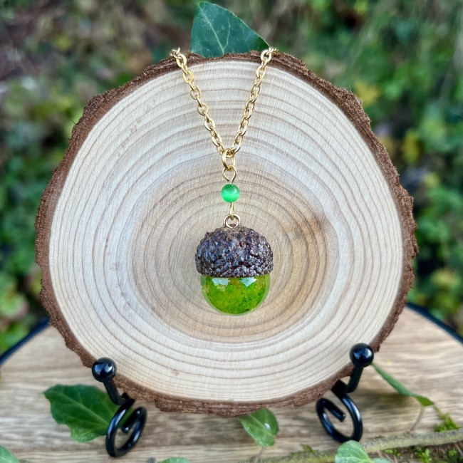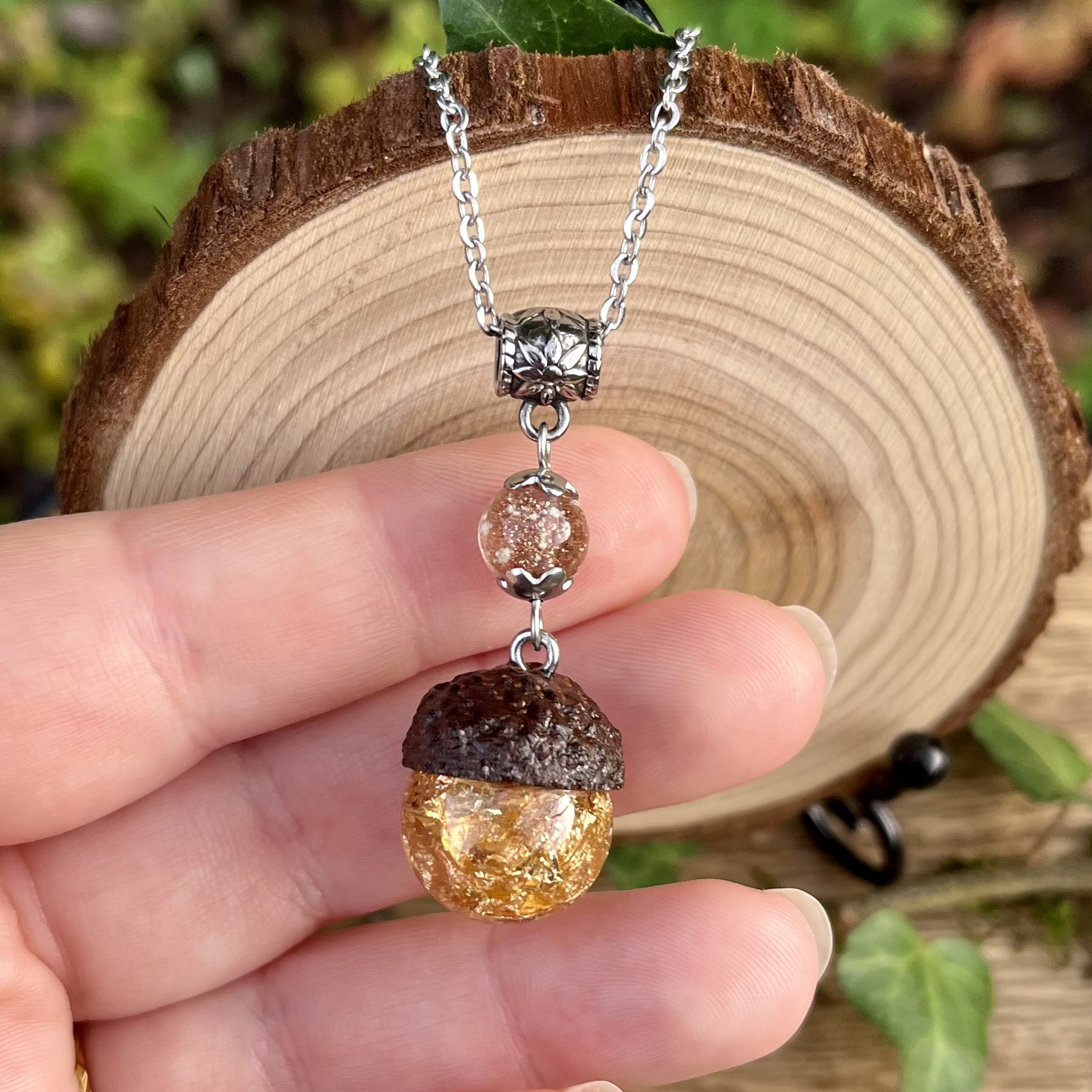 ✰ Collier gland avec cupule naturelle ramassée, séchée et vernie par mes soins, assemblée avec une sphère faite main en résine epoxy, inclusion de pigment irisé et feuille métallisée pour un rendu unique ✨