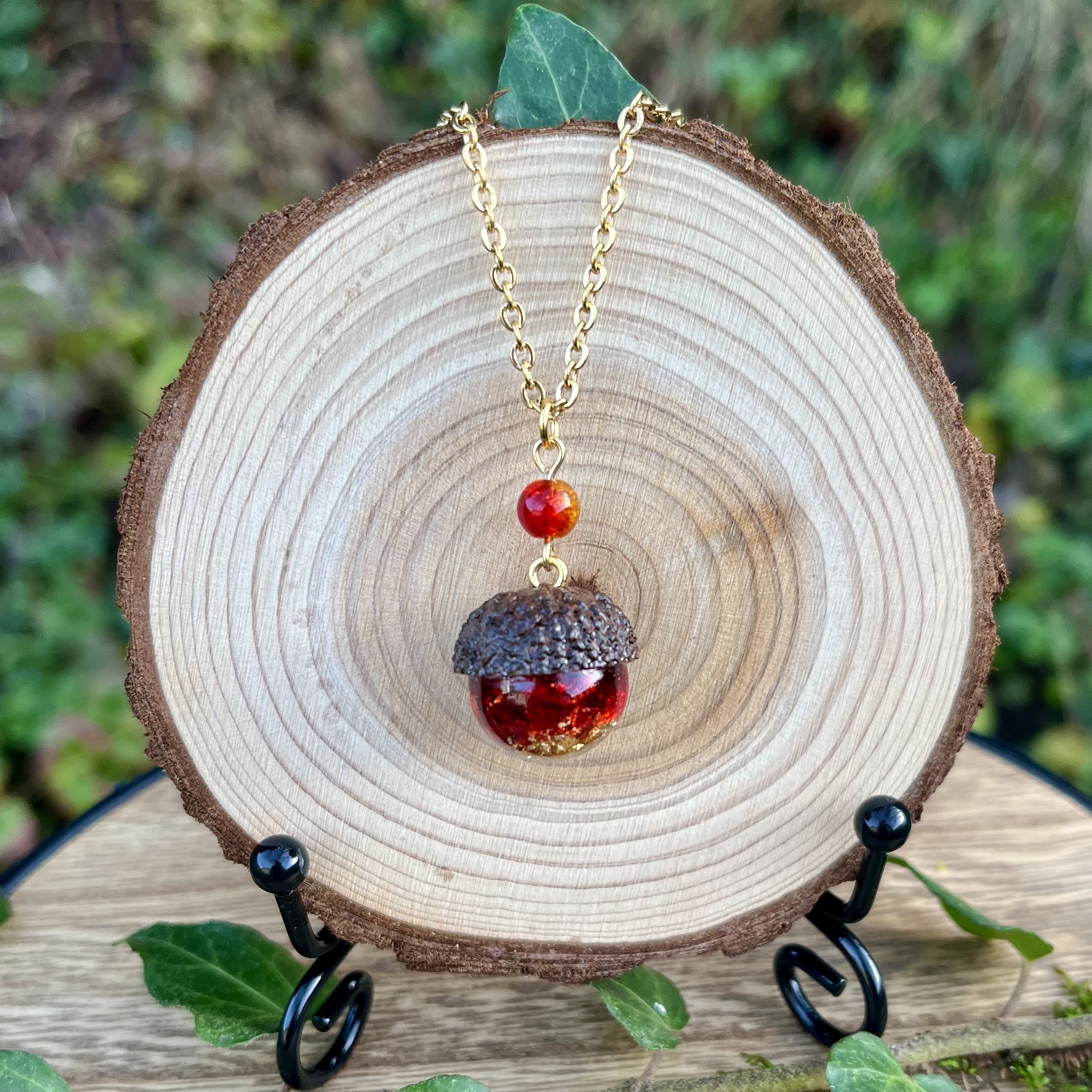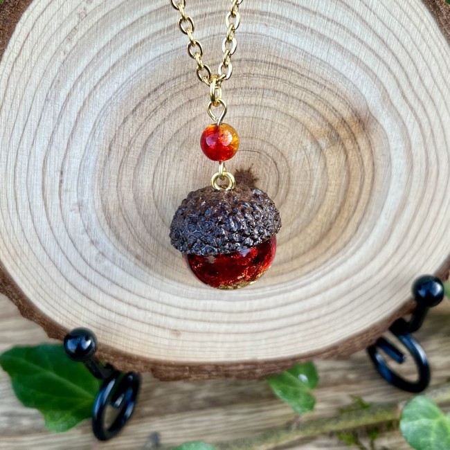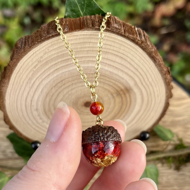 ✰ Collier gland avec cupule naturelle ramassée, séchée et vernie par mes soins, assemblée avec une sphère faite main en résine epoxy, inclusion de pigment irisé et feuille métallisée pour un rendu unique ✨