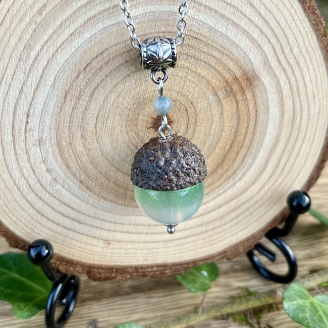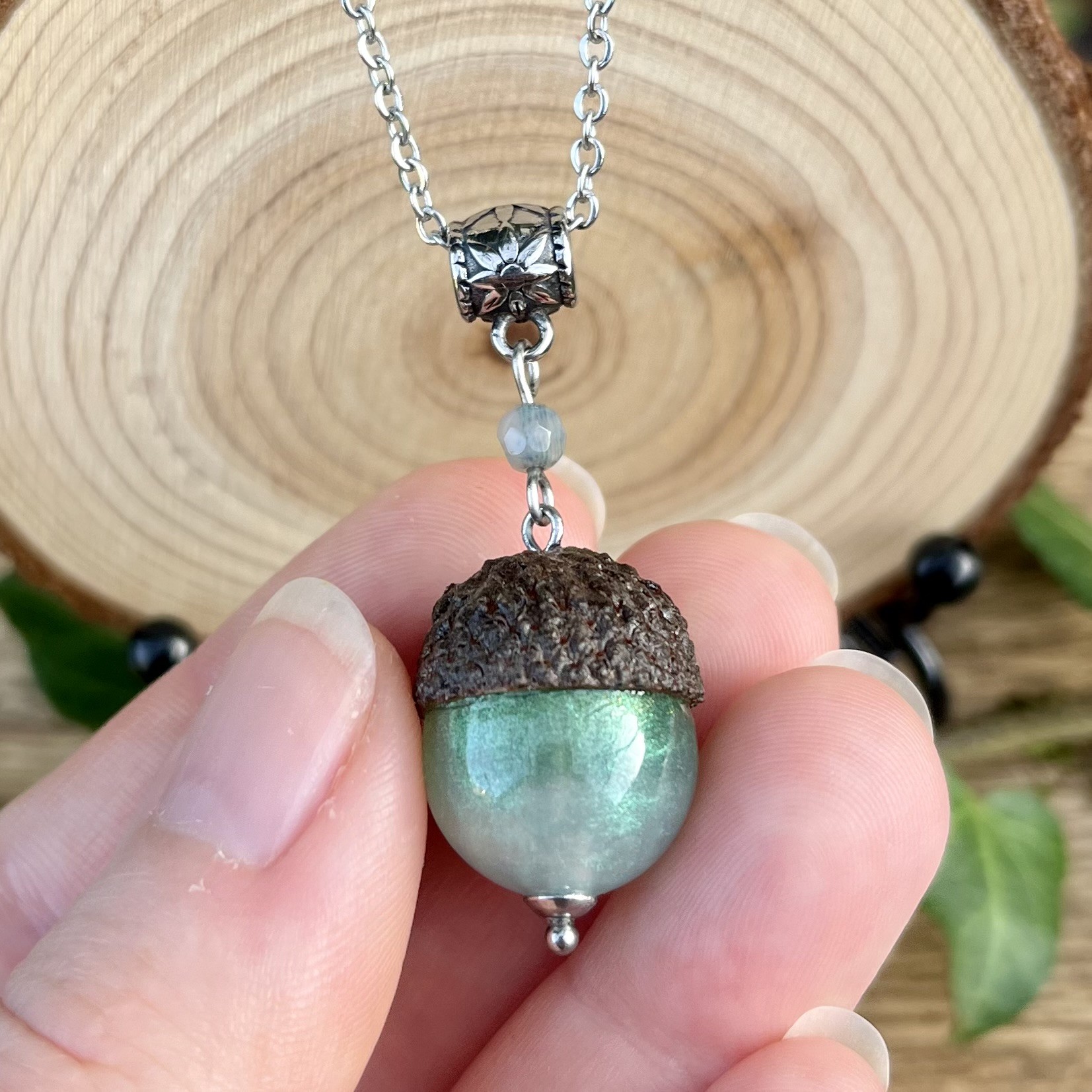 ✰ Collier gland avec cupule naturelle ramassée, séchée et vernie par mes soins, assemblée avec une perle faite main en résine epoxy, inclusion de pigment irisé pour un rendu unique ✨