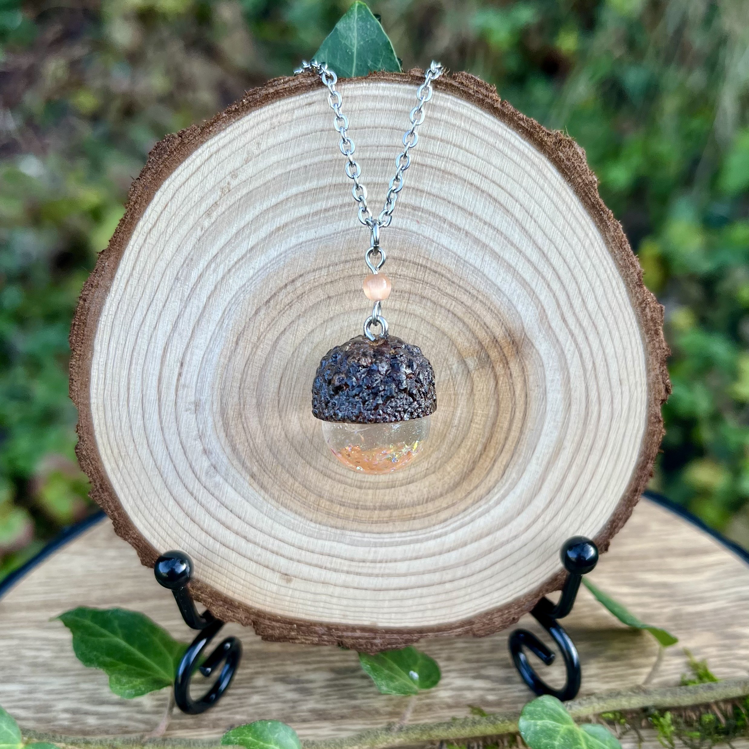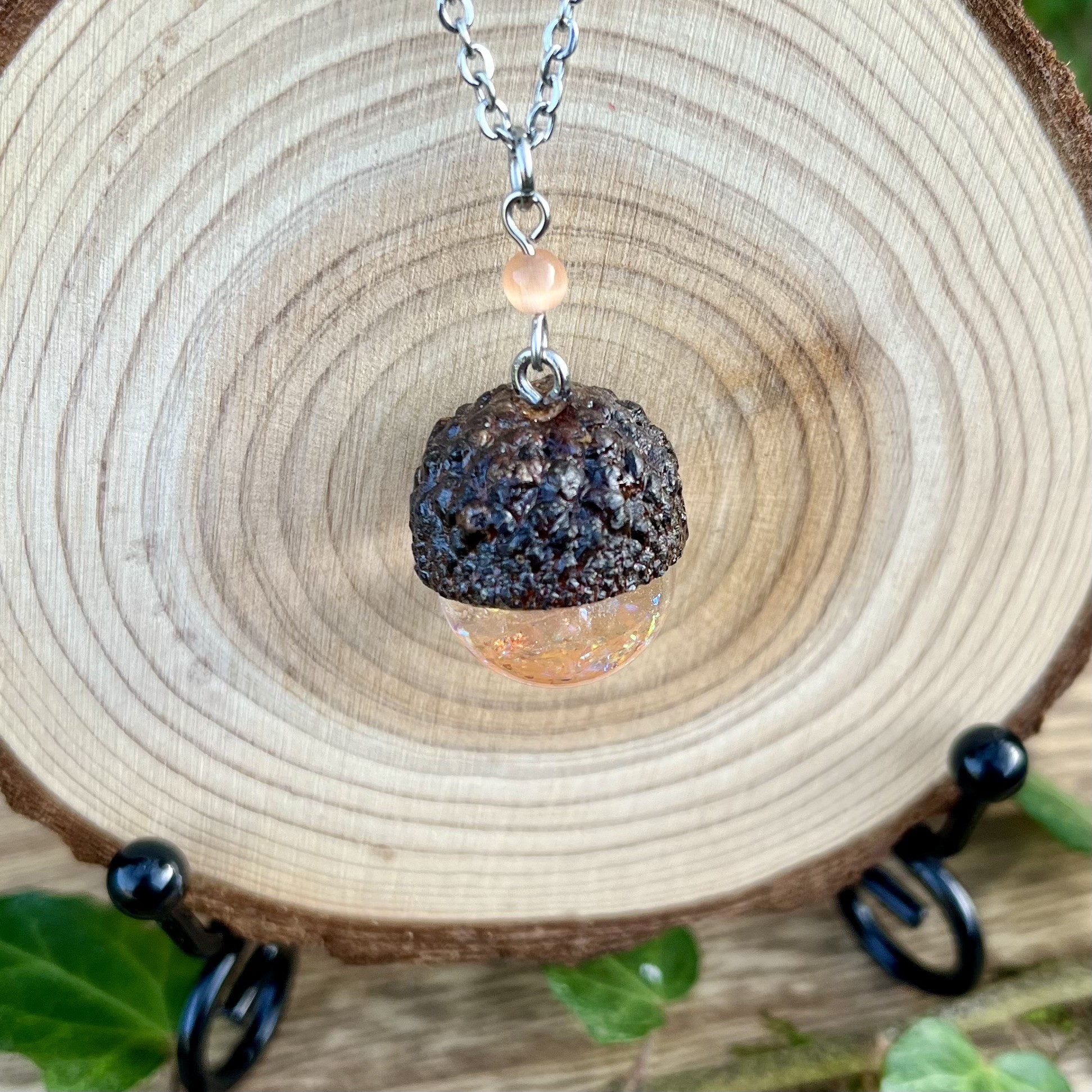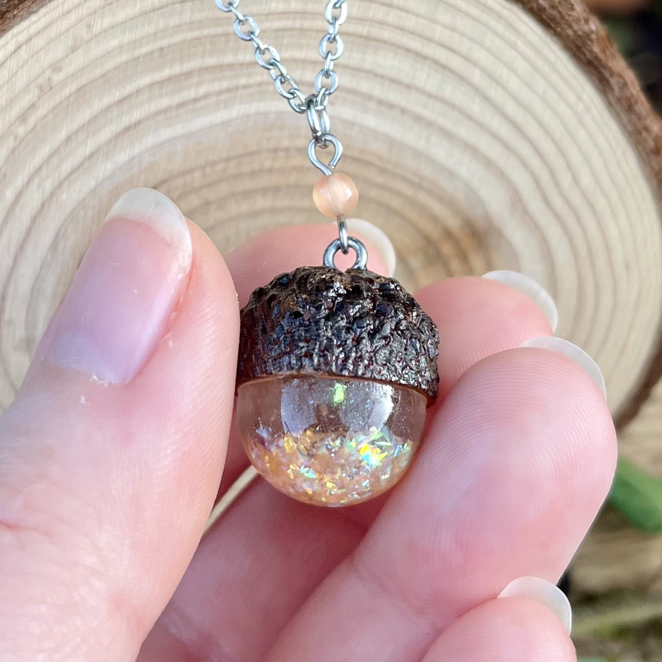 ✰ Collier gland avec cupule naturelle ramassée, séchée et vernie par mes soins, assemblée avec une sphère faite main en résine epoxy, inclusion de pigment irisé et paillettes pour un rendu unique ✨