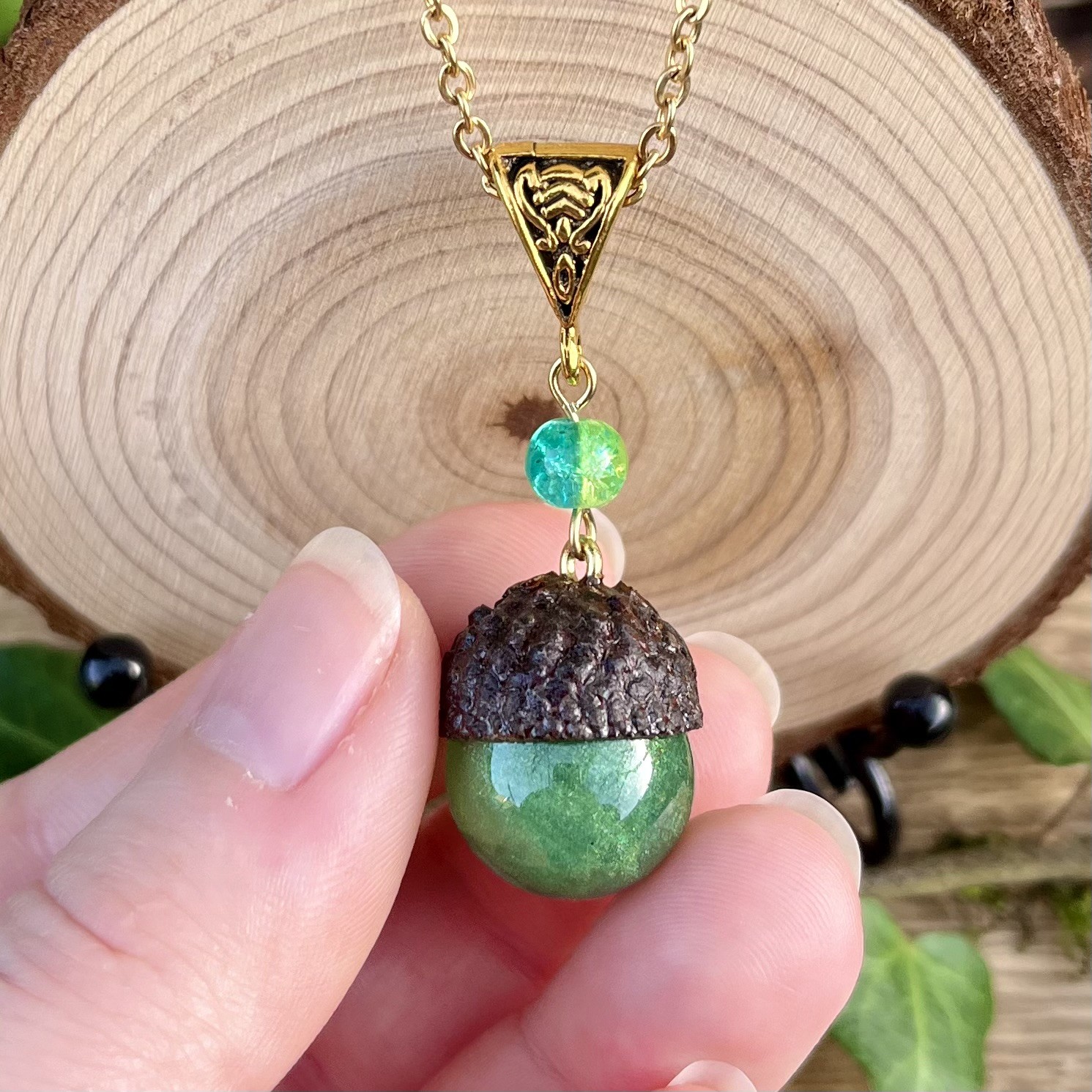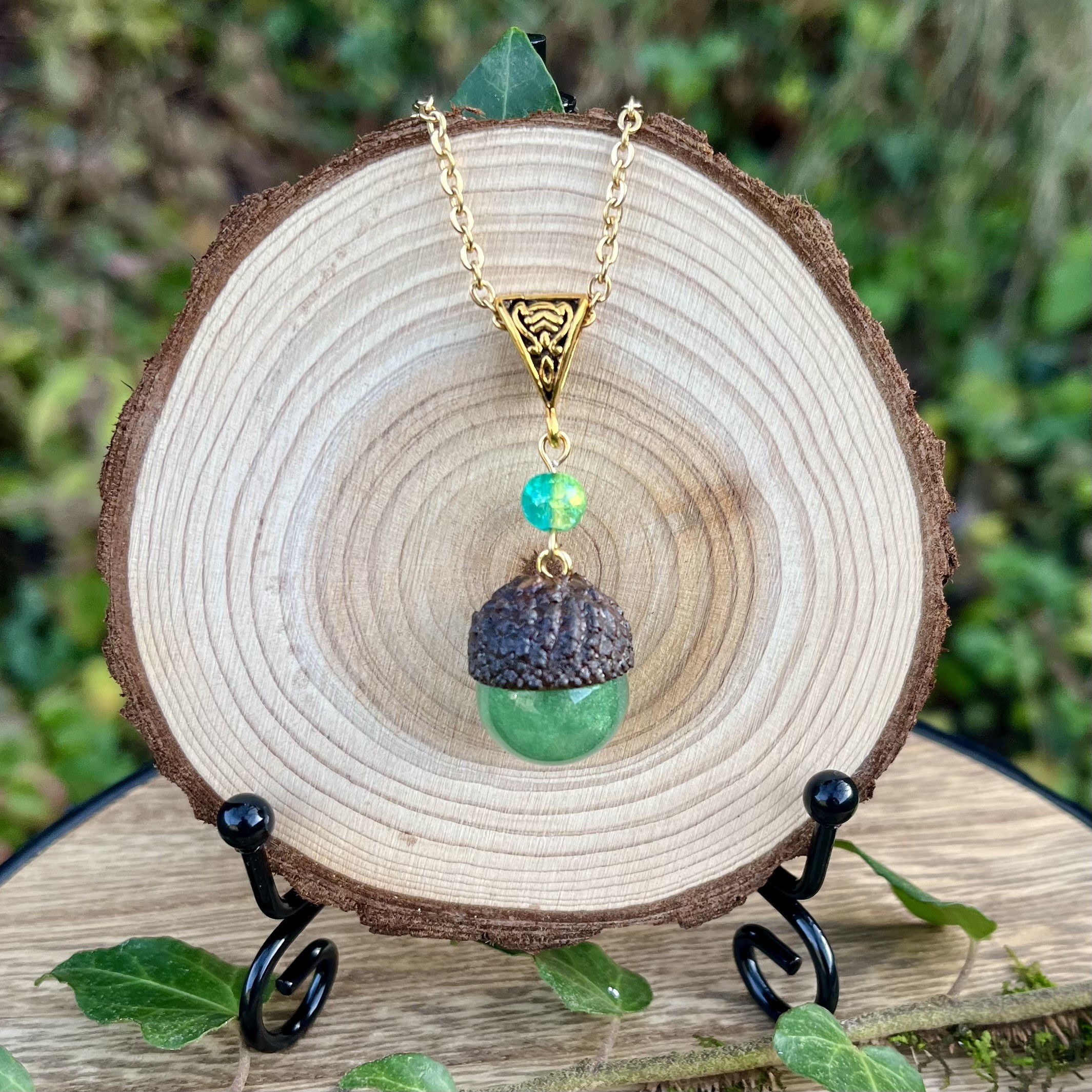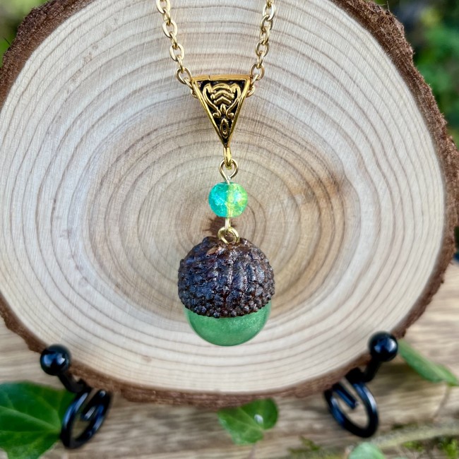✰ Collier gland avec cupule naturelle ramassée, séchée et vernie par mes soins, assemblée avec une sphère faite main en résine epoxy, inclusion de pigment irisé pour un rendu unique ✨