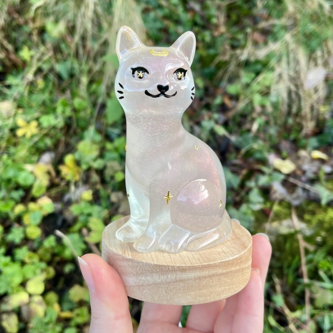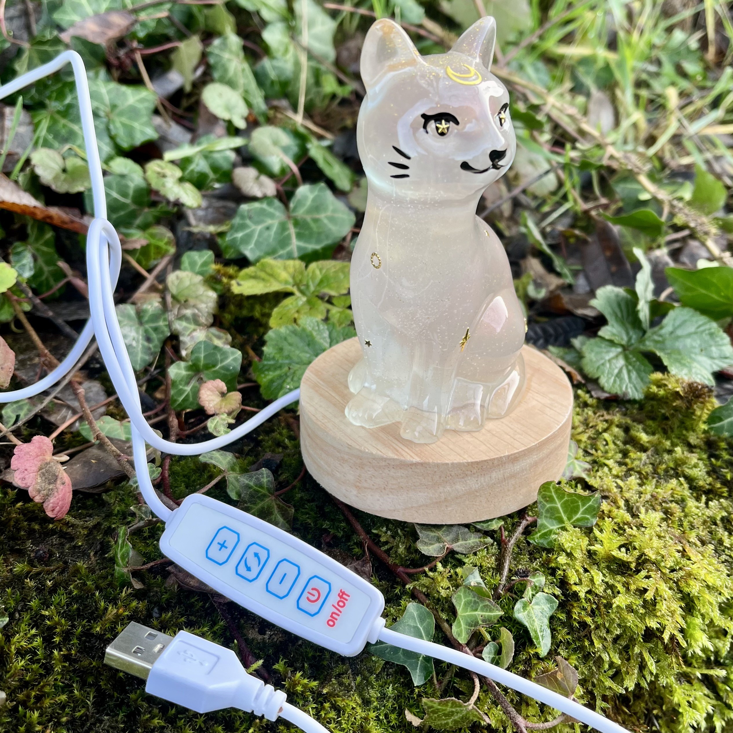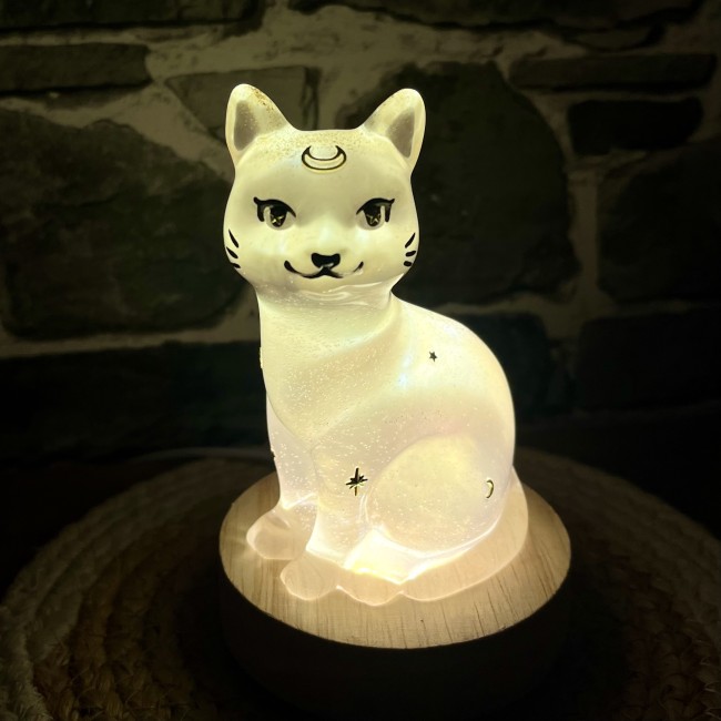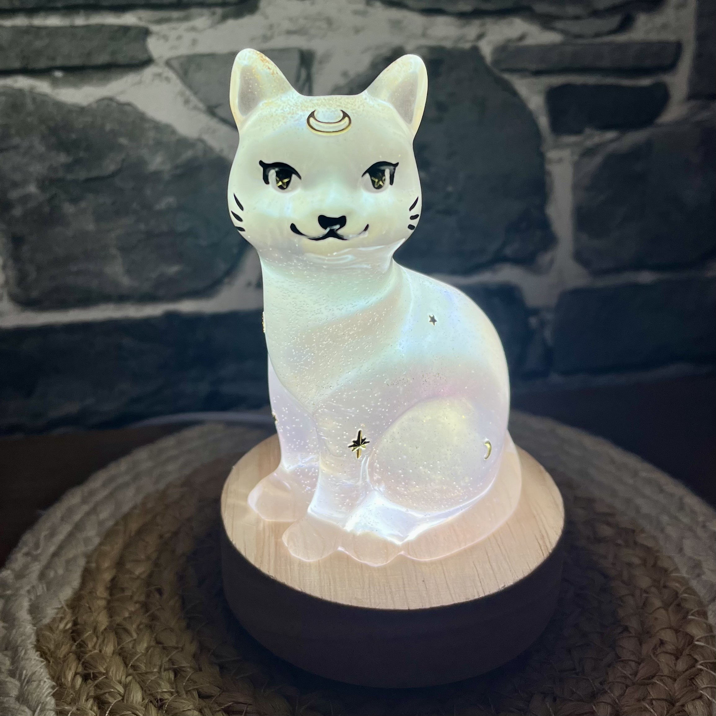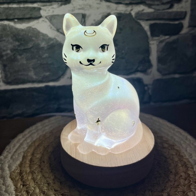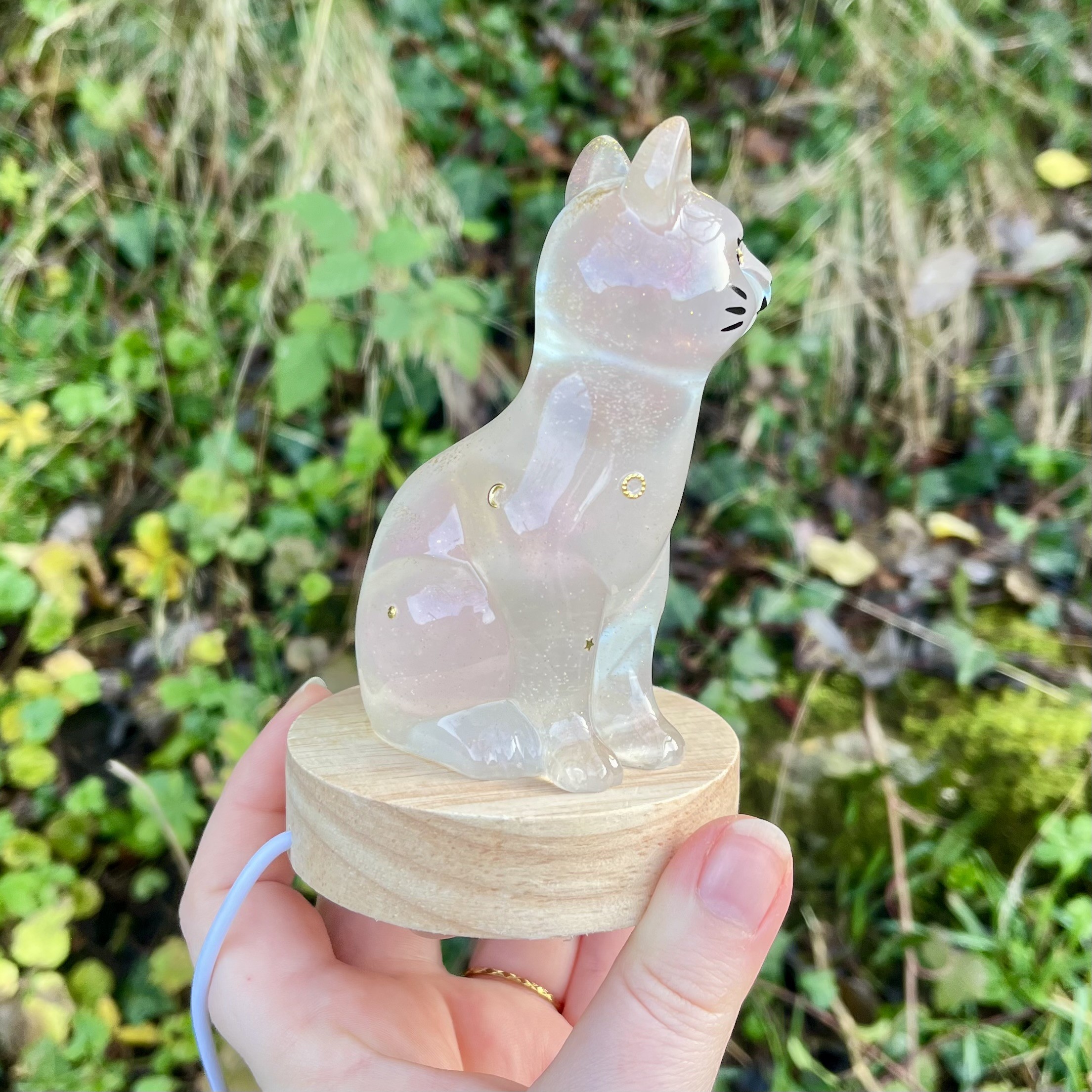 ✰ Lampe Chat, faite main en résine epoxy avec inclusion de fines paillettes.
