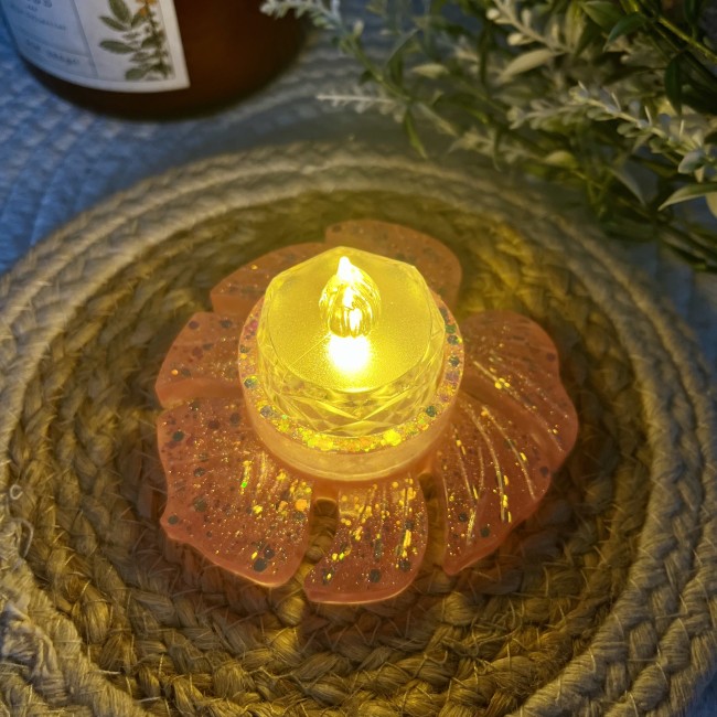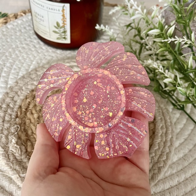 ✰ Photophore feuille de monstera rose fait à la main en résine epoxy, avec inclusion de paillettes ✨