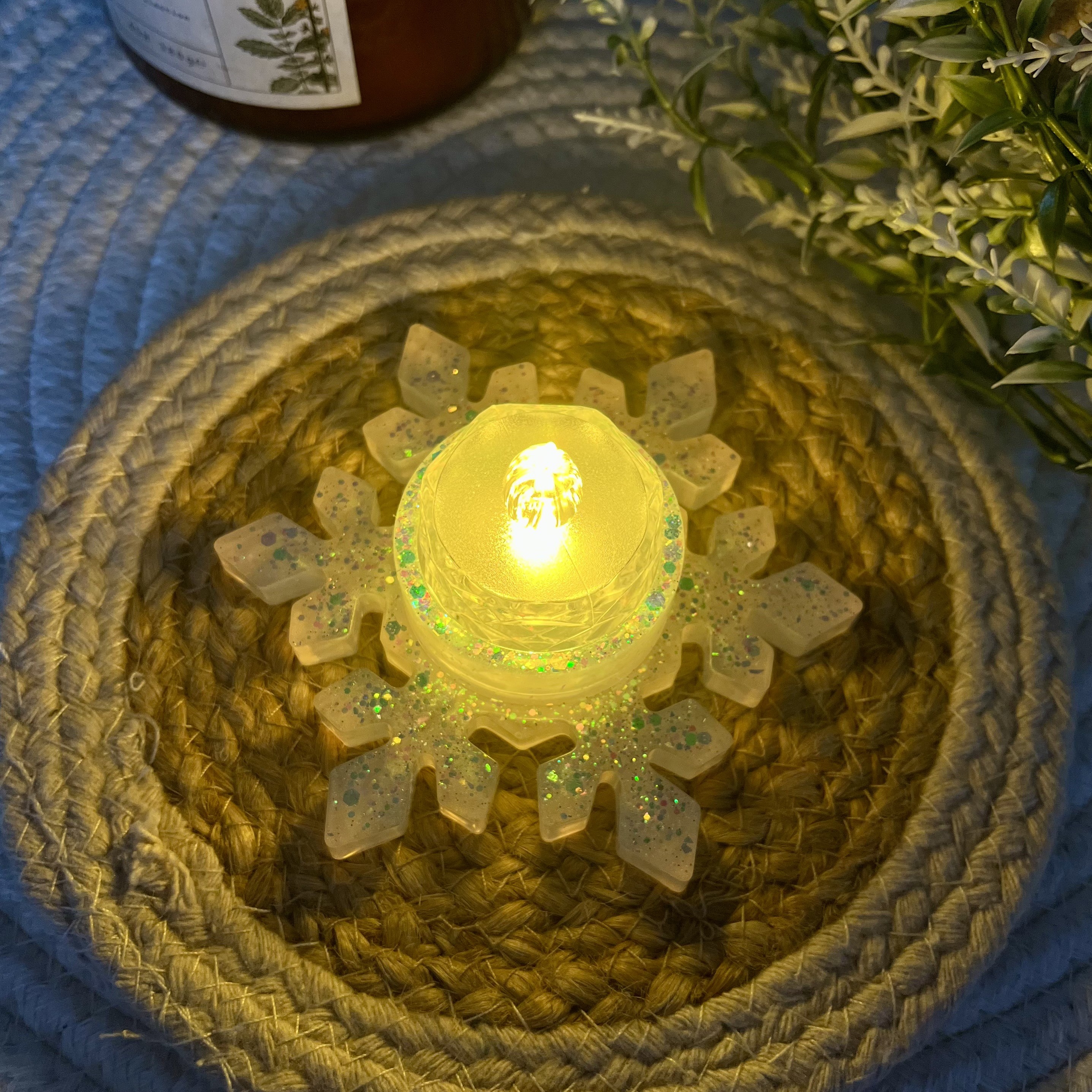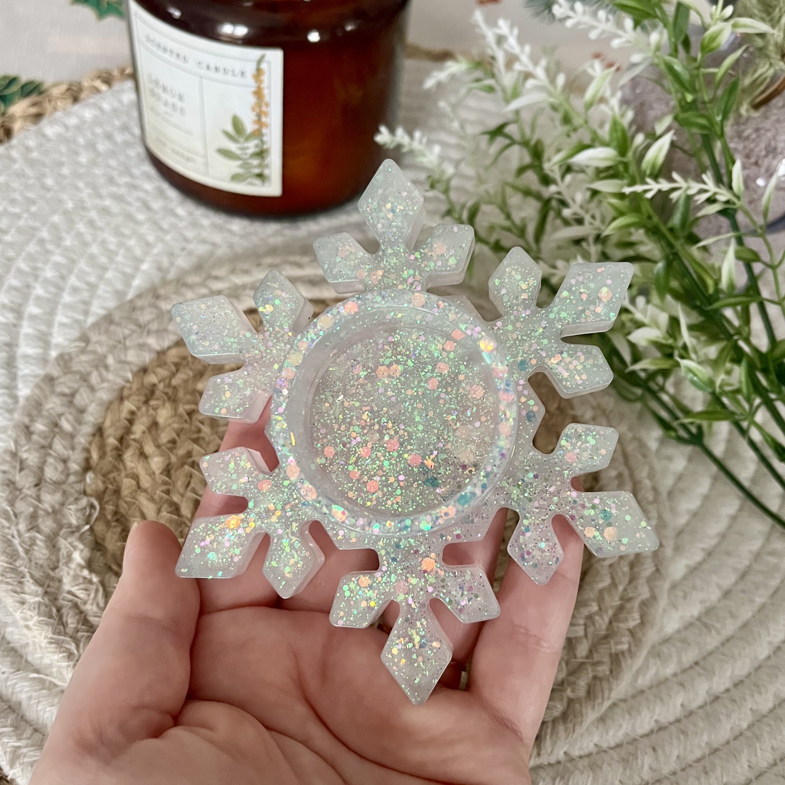 ✰ Photophore flocon de neige fait à la main en résine epoxy, avec inclusion de paillettes ✨