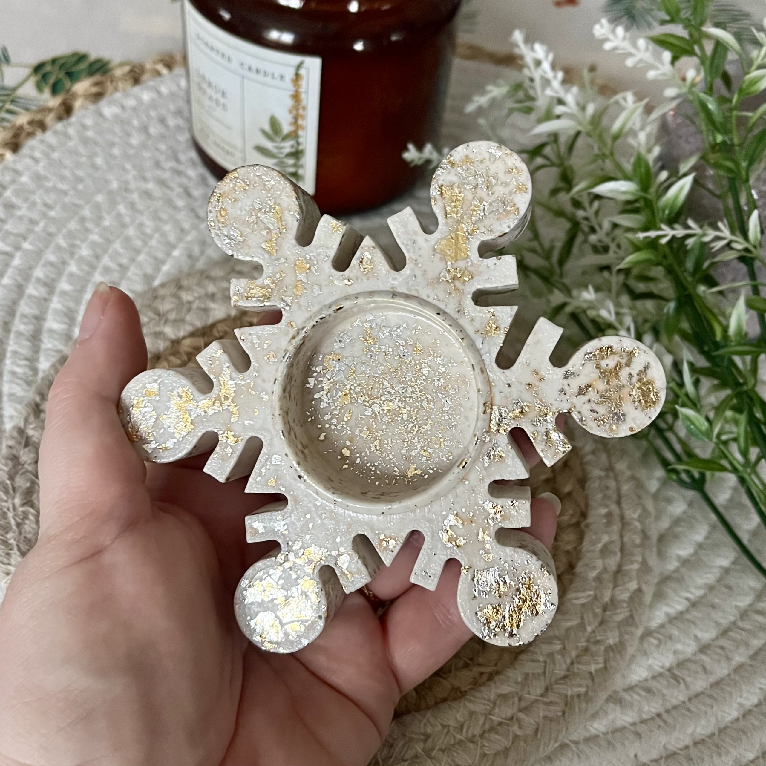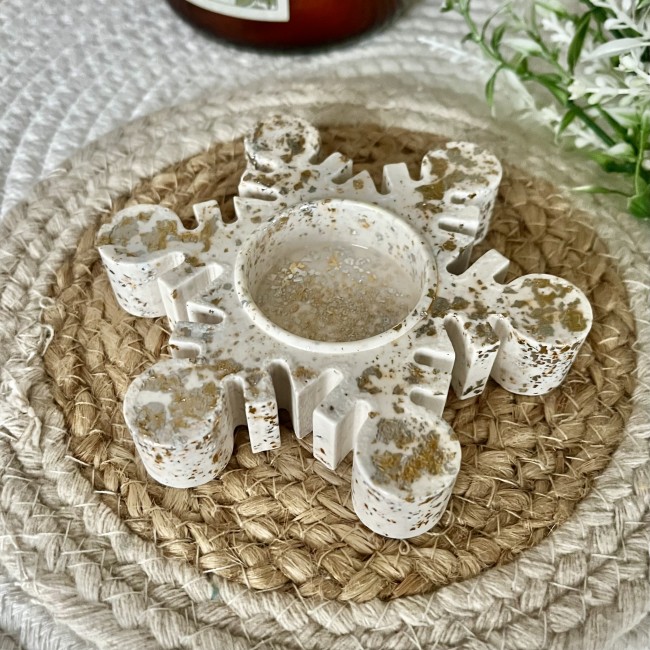 ✰ Photophore flocon de neige fait à la main en résine minérale, décoré de feuille métallisée dorée et argentée.