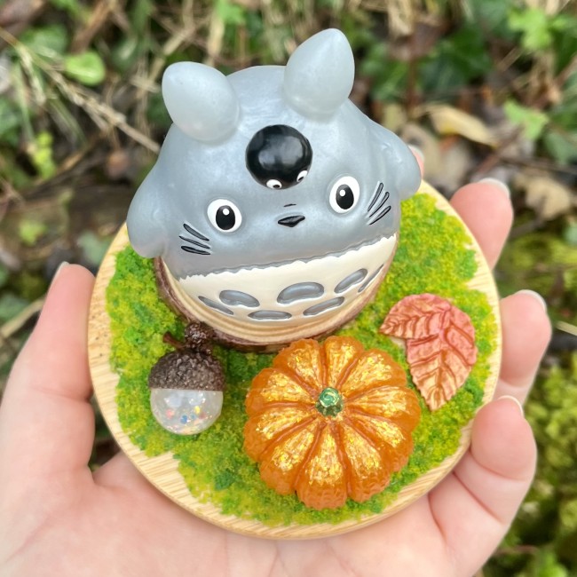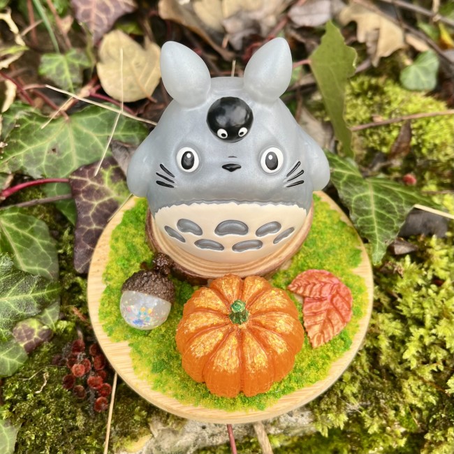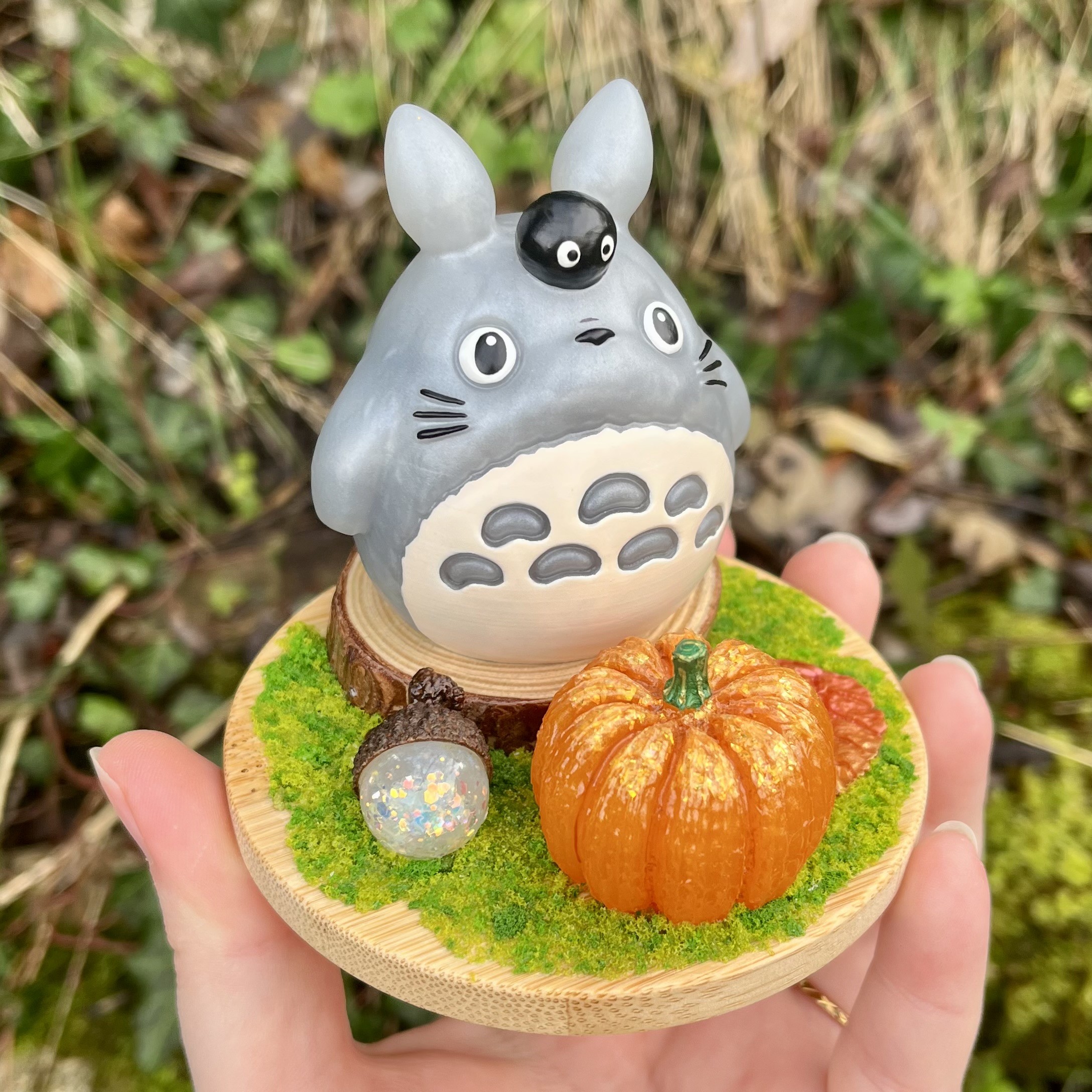 âś° Composition Totoro d'automne, composée de divers éléments fait main : un gland en résine, une citrouille en résine, des feuilles en pâte polymère et un Totoro en résine.