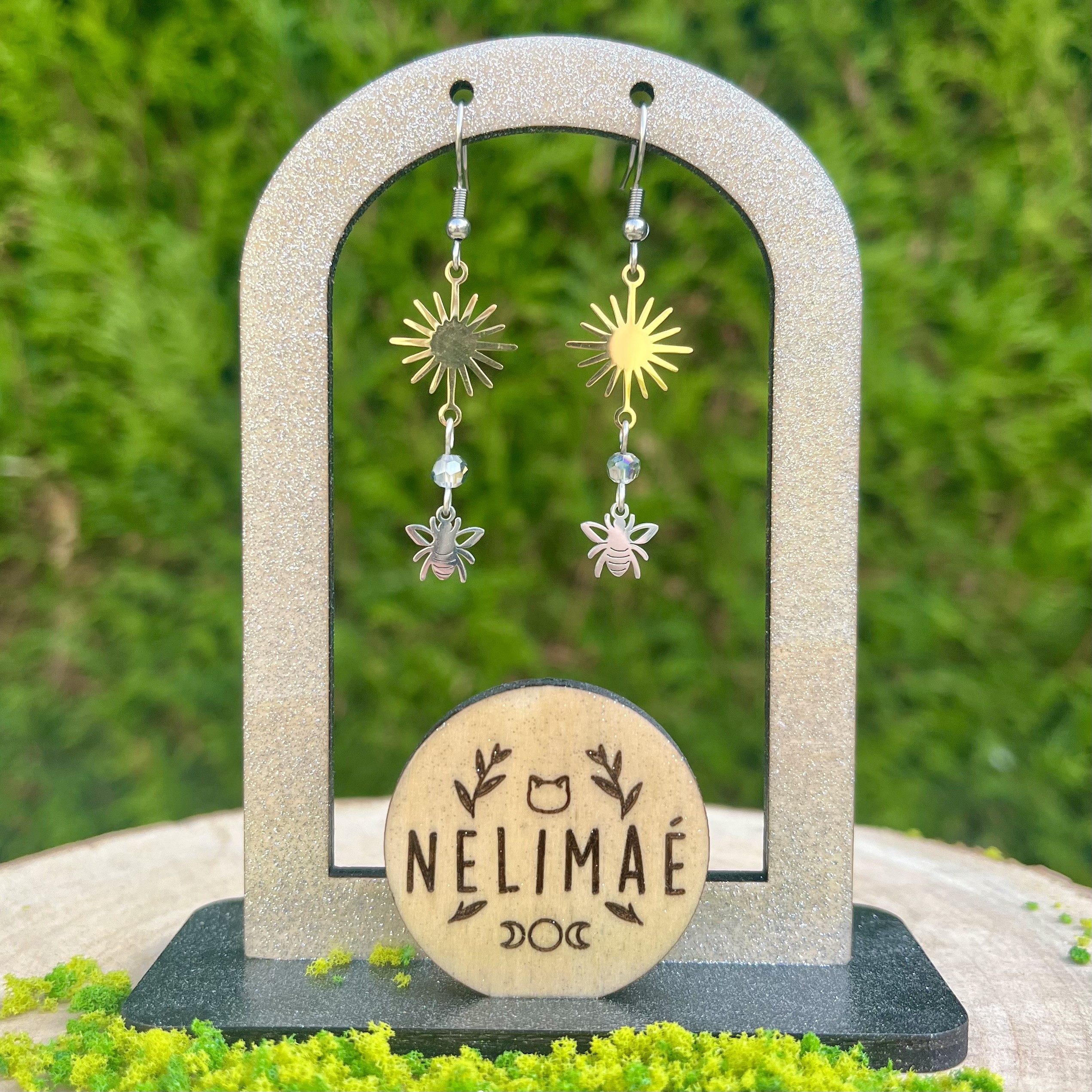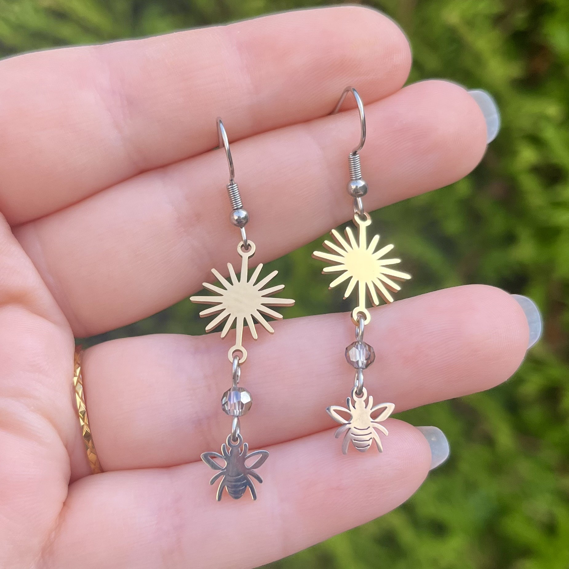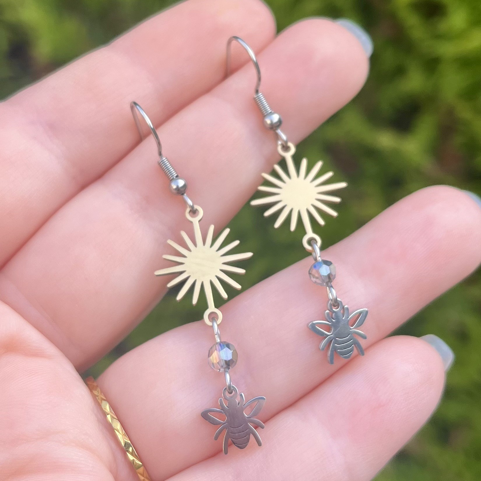 ✰ Paire de boucles d'oreilles soleils et abeilles montée main, avec breloques en acier inoxydable et perles en verre.