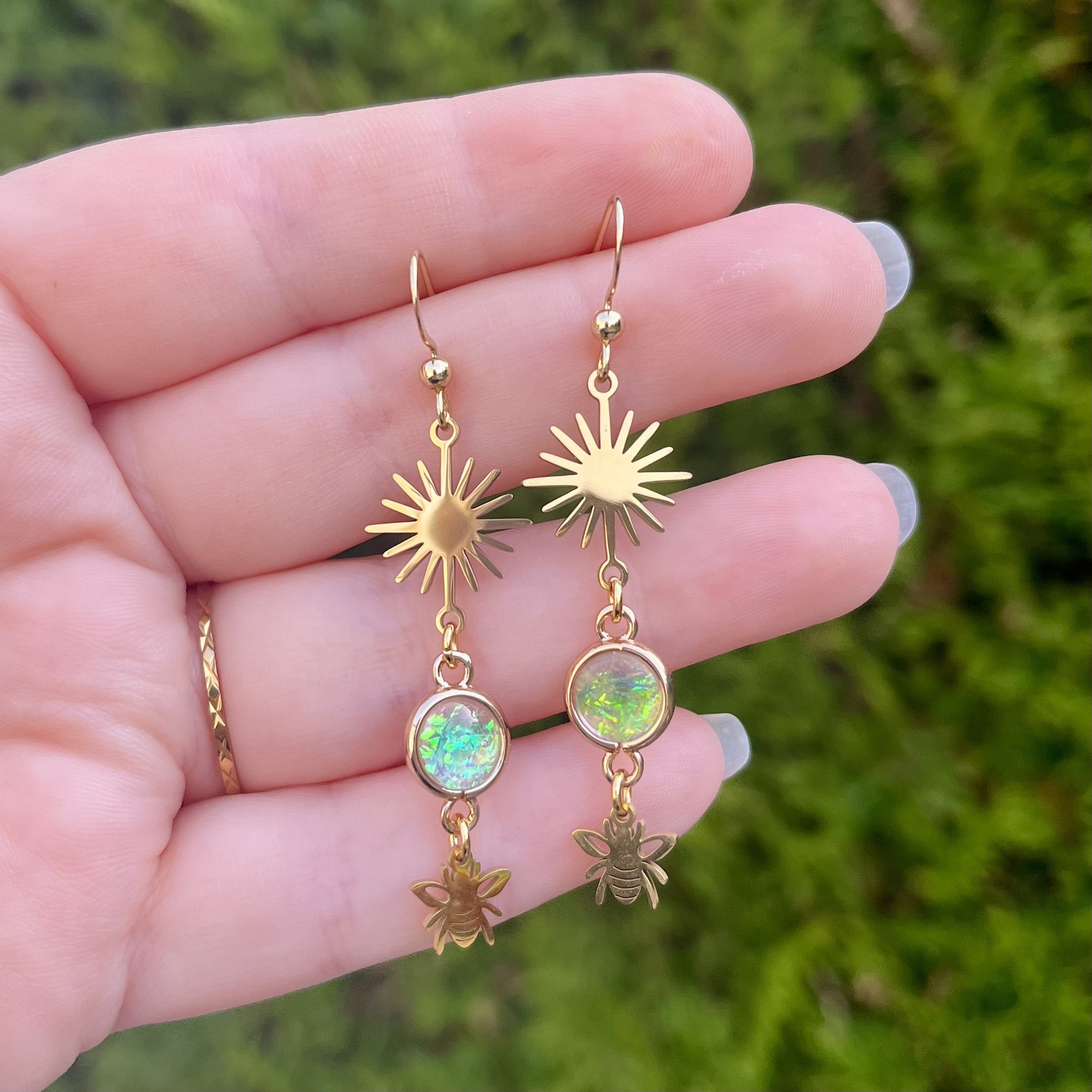 ✰ Paire de boucles d'oreilles soleils et abeilles montée main, avec breloques en acier inoxydable et connecteurs en métal doré et résine irisée.