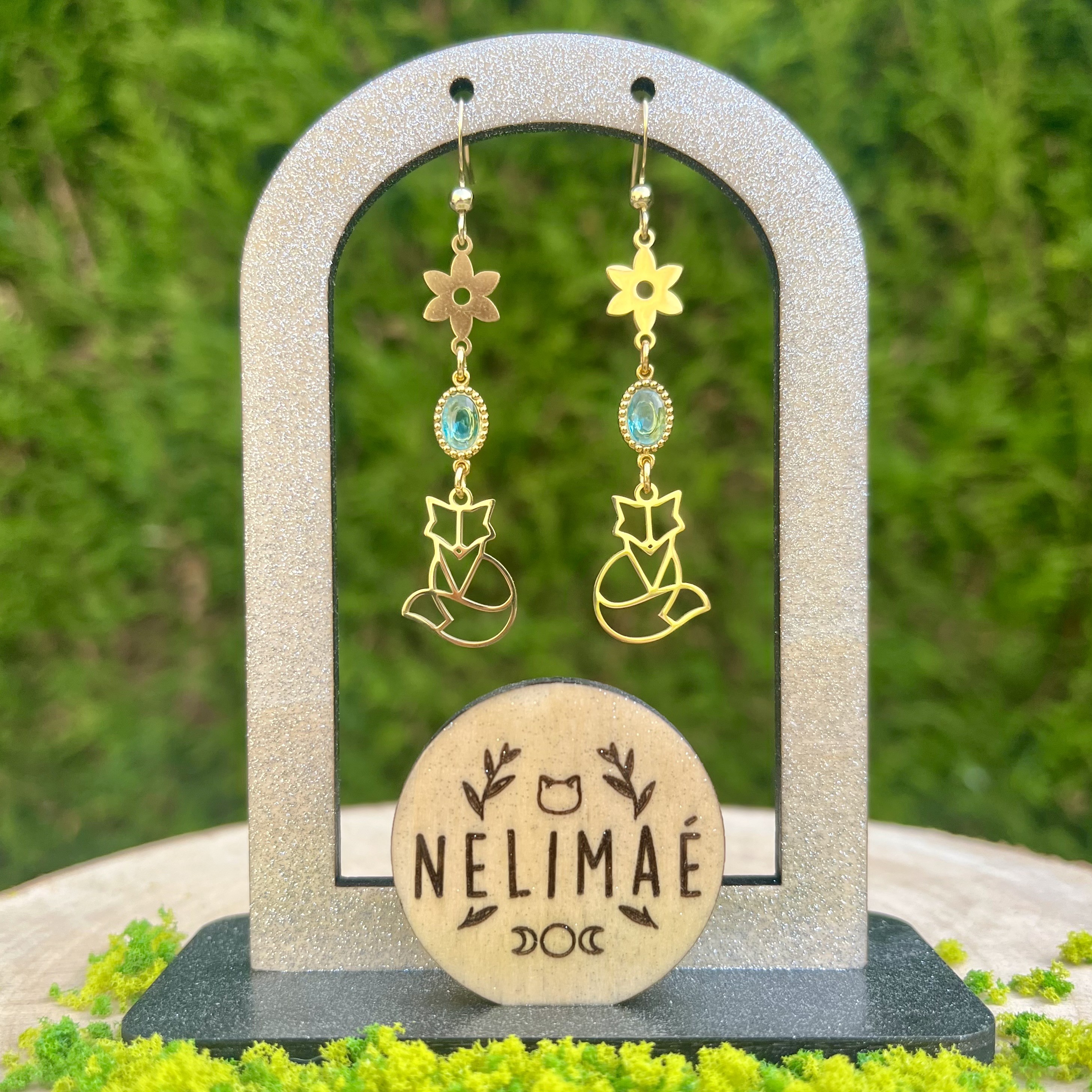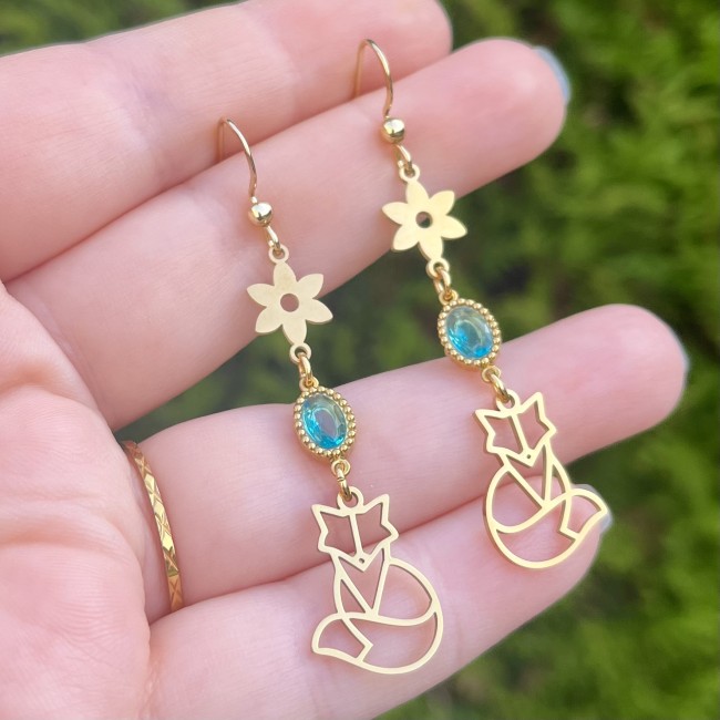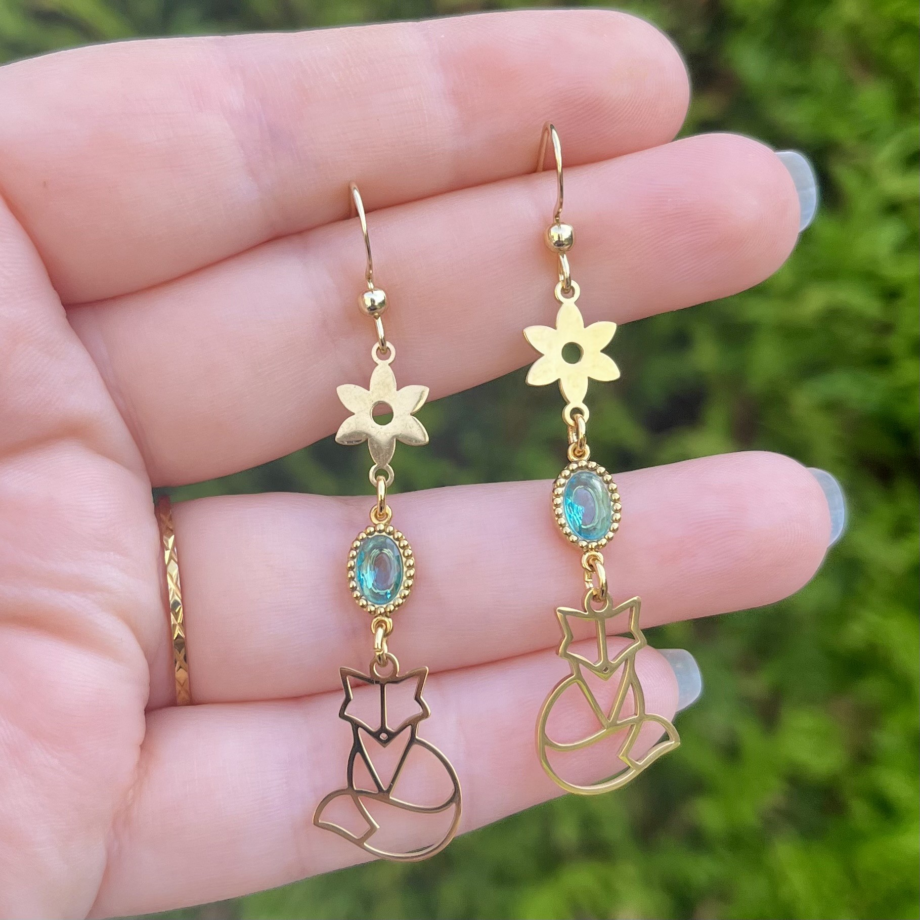 ✰ Paire de boucles d'oreilles fleurs et renards montée main, avec breloques en acier inoxydable et connecteur en métal doré et perle en verre bleutée.