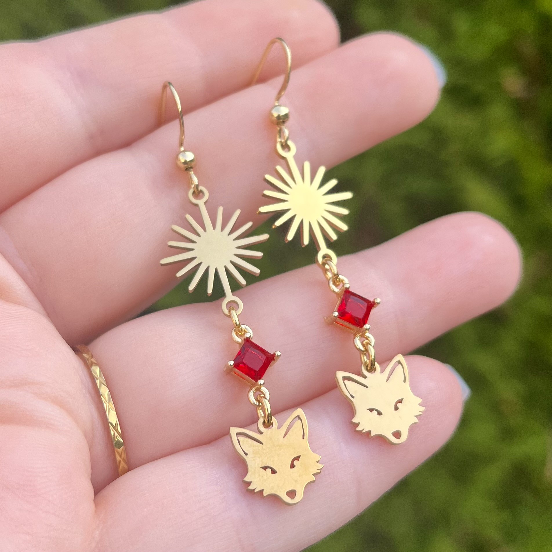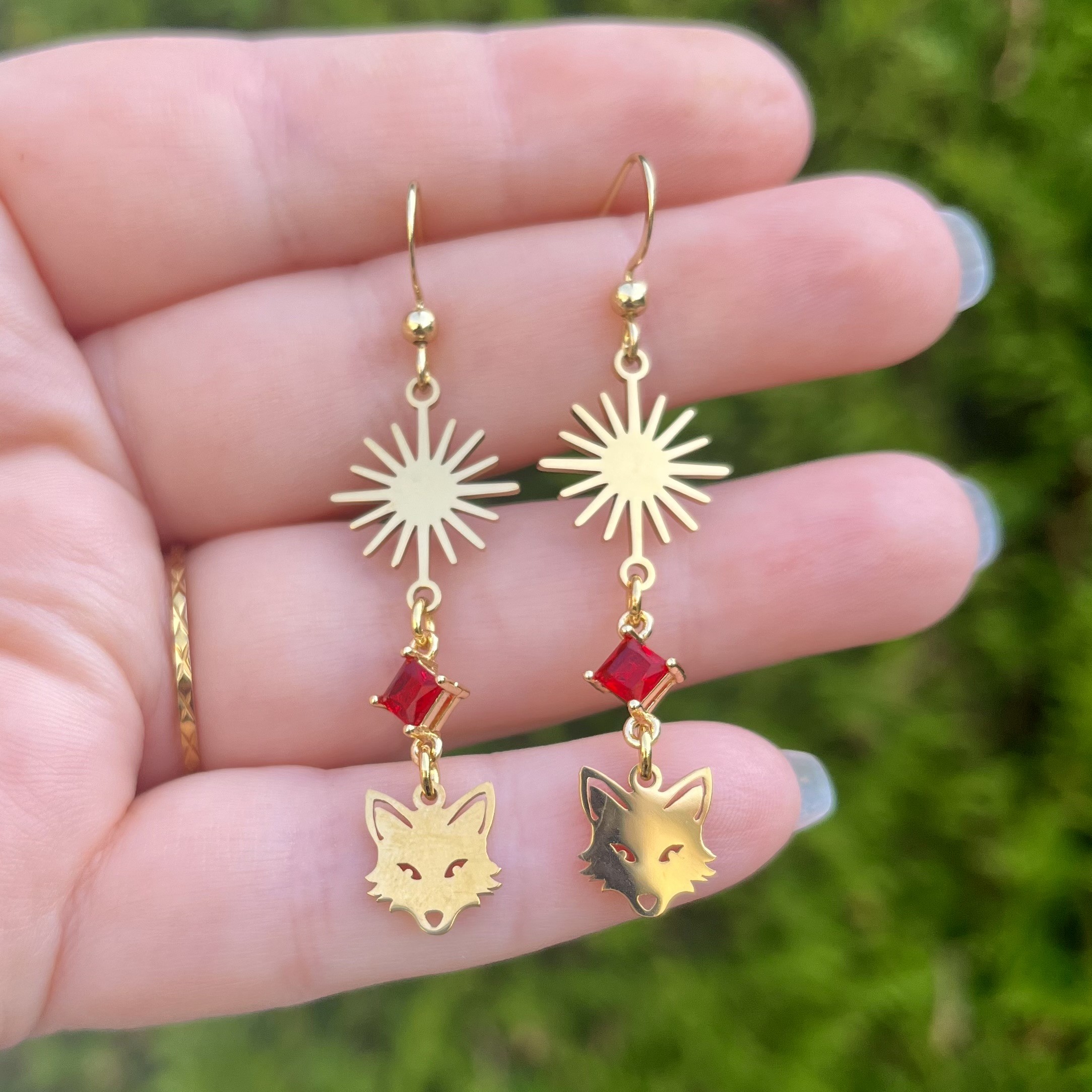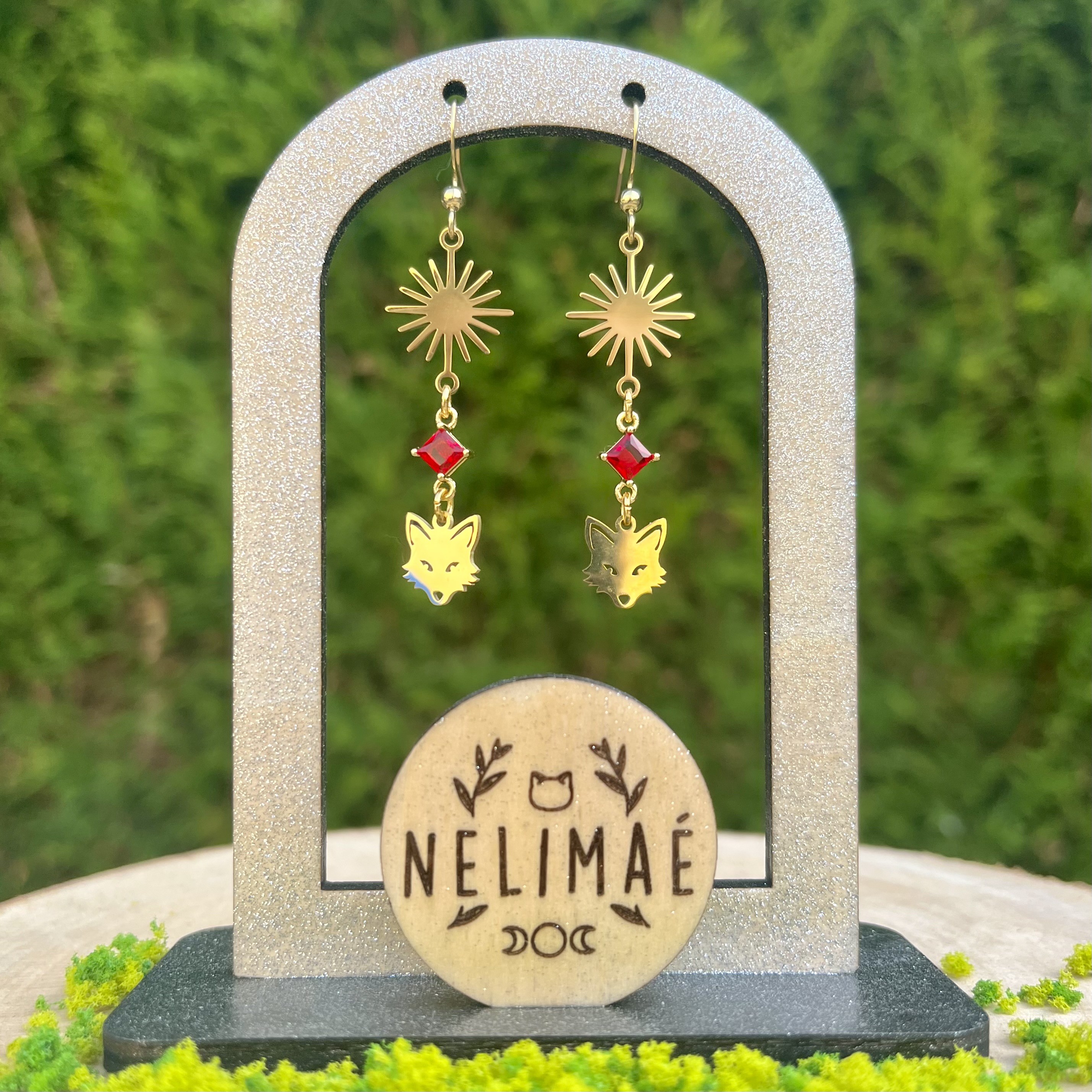 ✰ Paire de boucles d'oreilles soleils et renards montée main, avec breloques en acier inoxydable et connecteur en métal doré et perle en verre rouge.