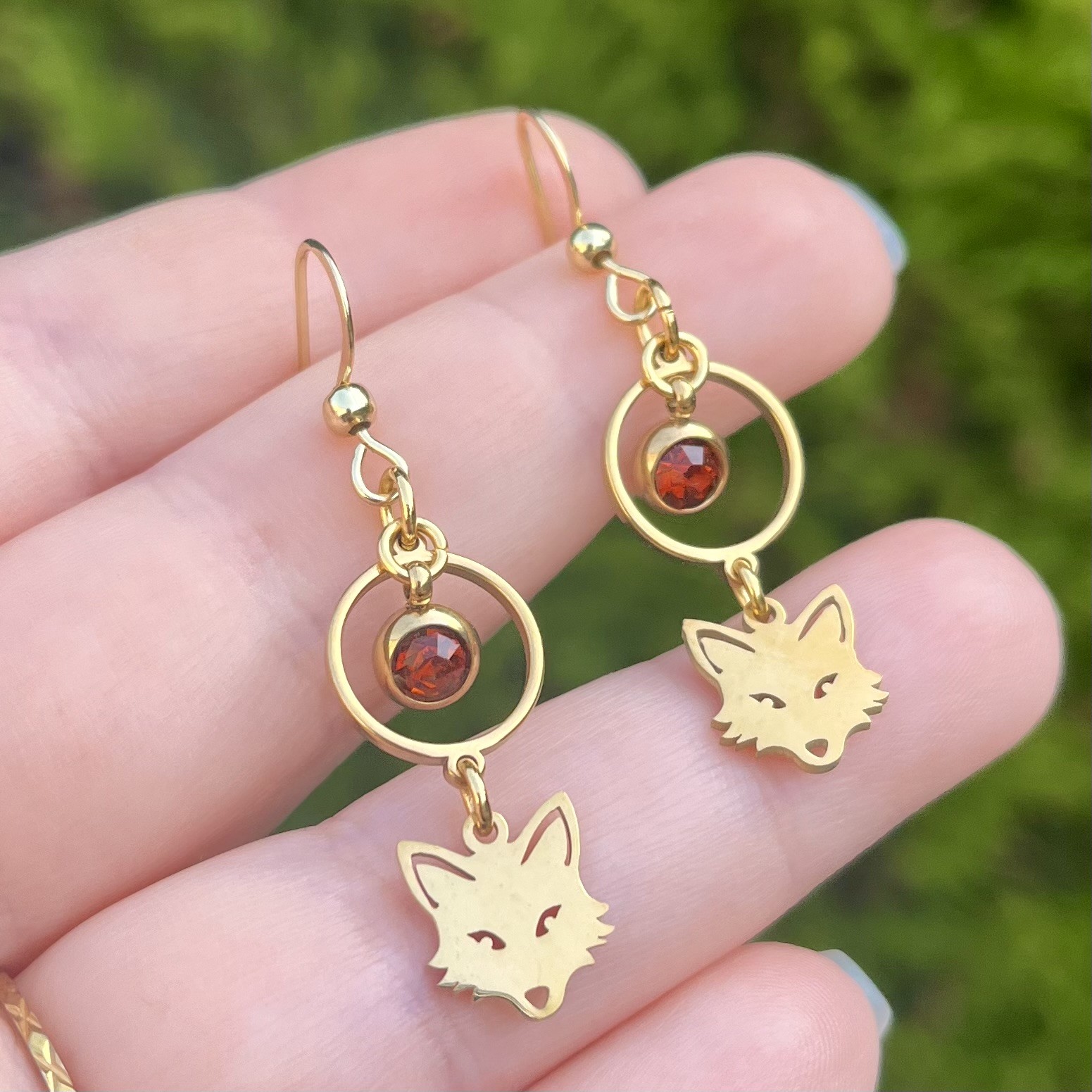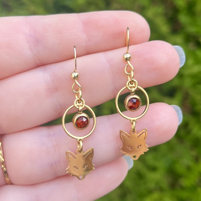 ✰ Paire de boucles d'oreilles renards montée main, avec breloques en acier inoxydable et perle en métal doré avec strass orangé