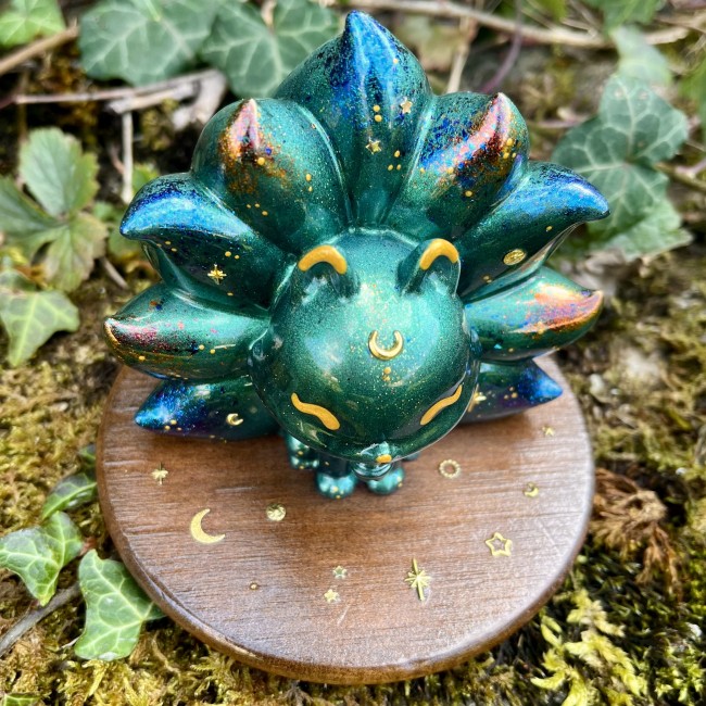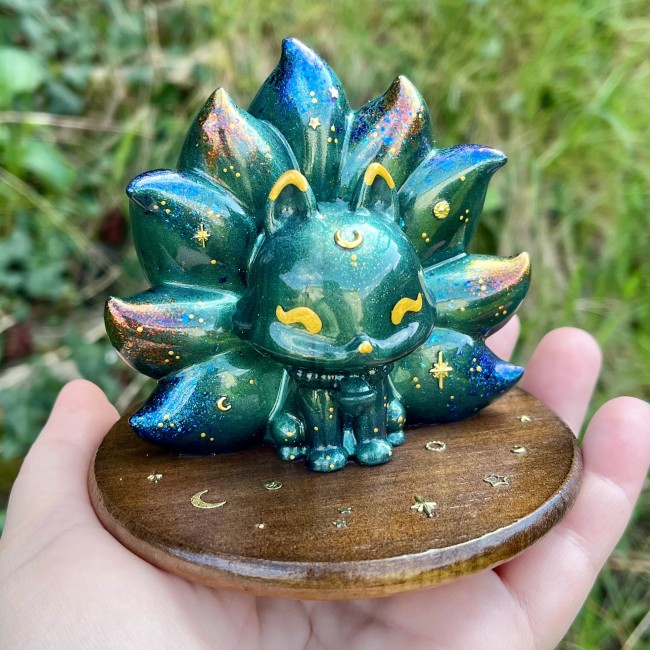 âś° Figurine Kitsune, faite main en résine epoxy avec inclusion de paillettes et pigments irisés.