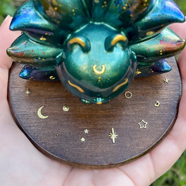 Les détails ont été peints à la main en doré, de petites lunes et étoiles en métal doré ont été collées sur la figurine et la base en bois, puis elle ont été entièrement vernies.