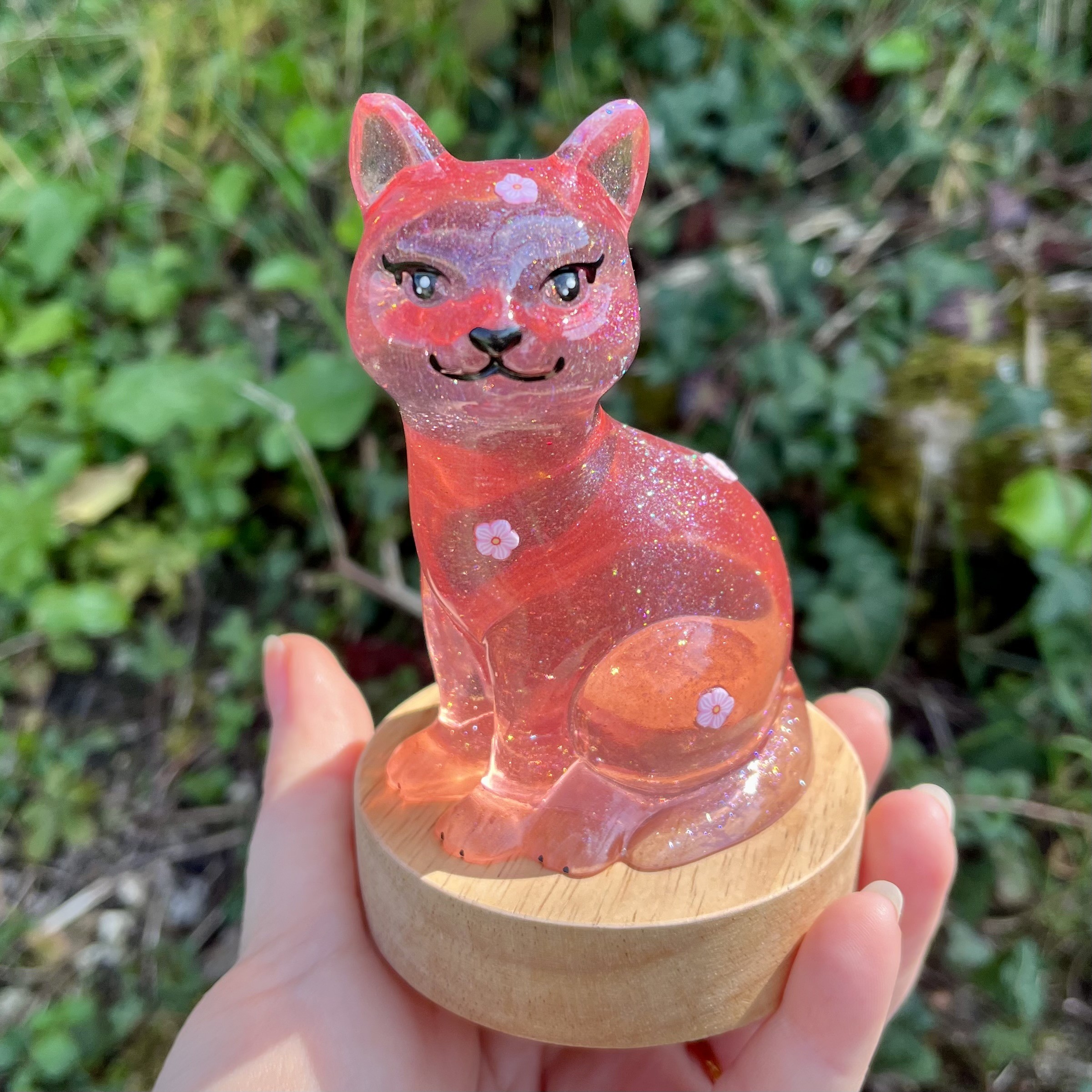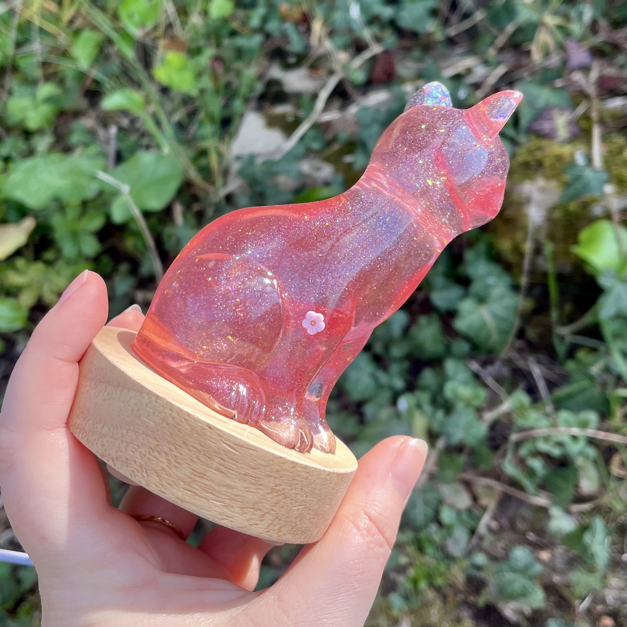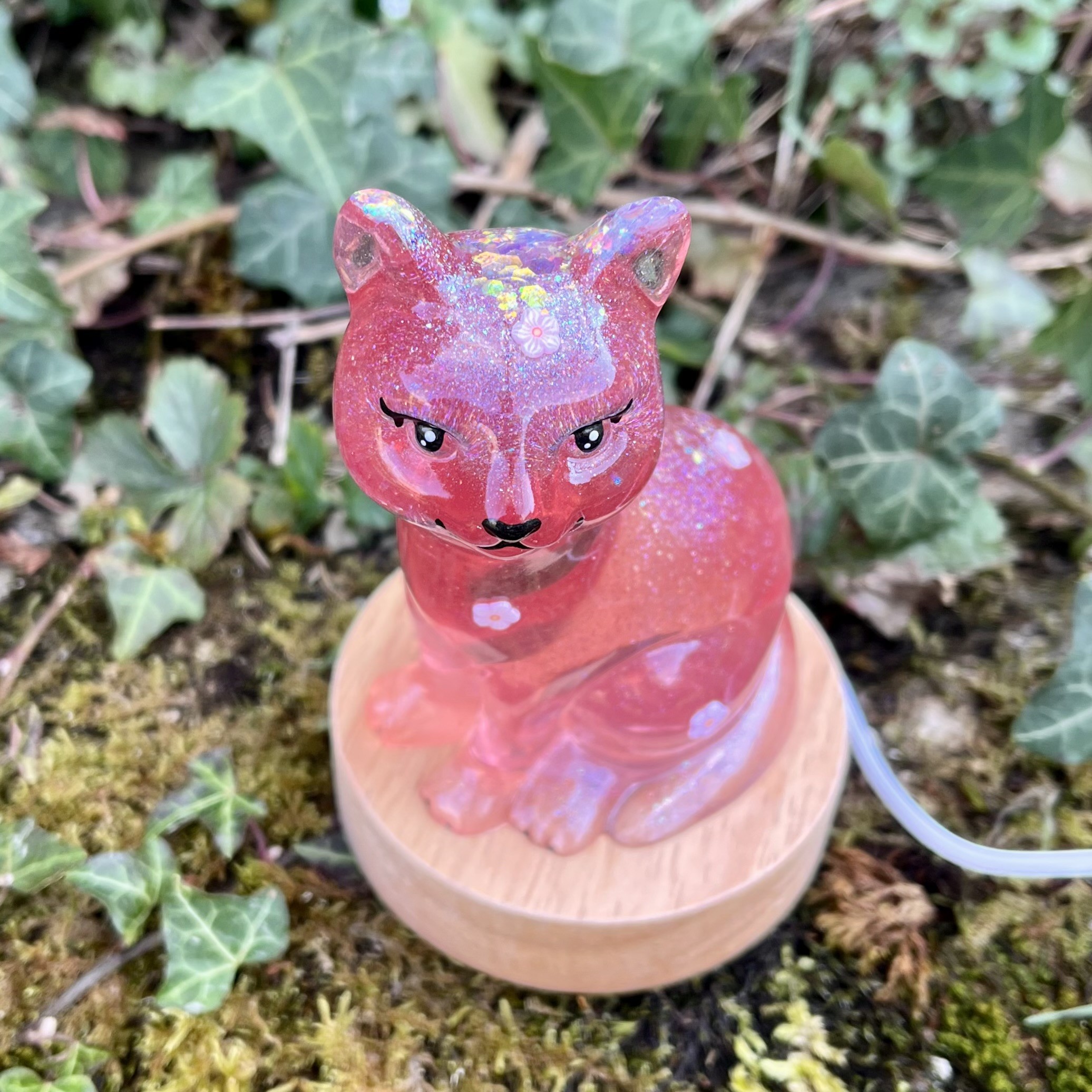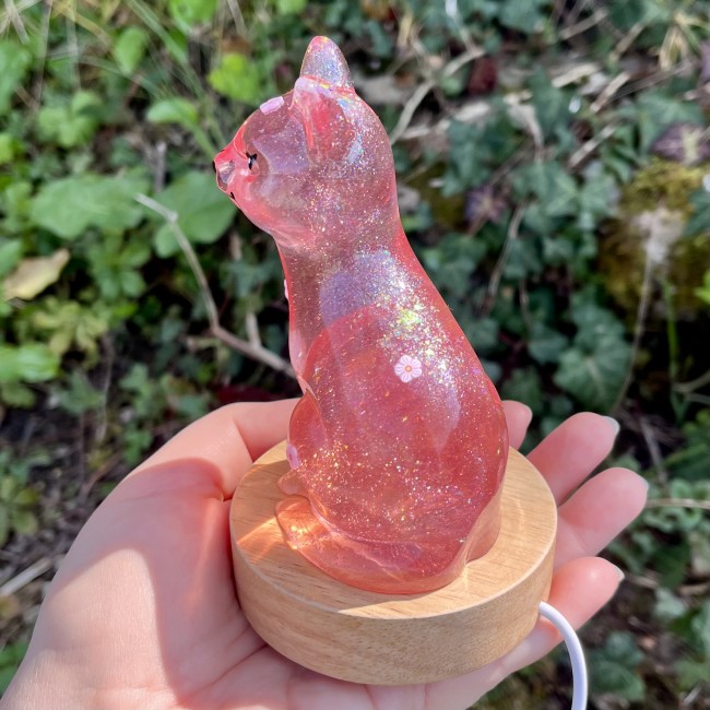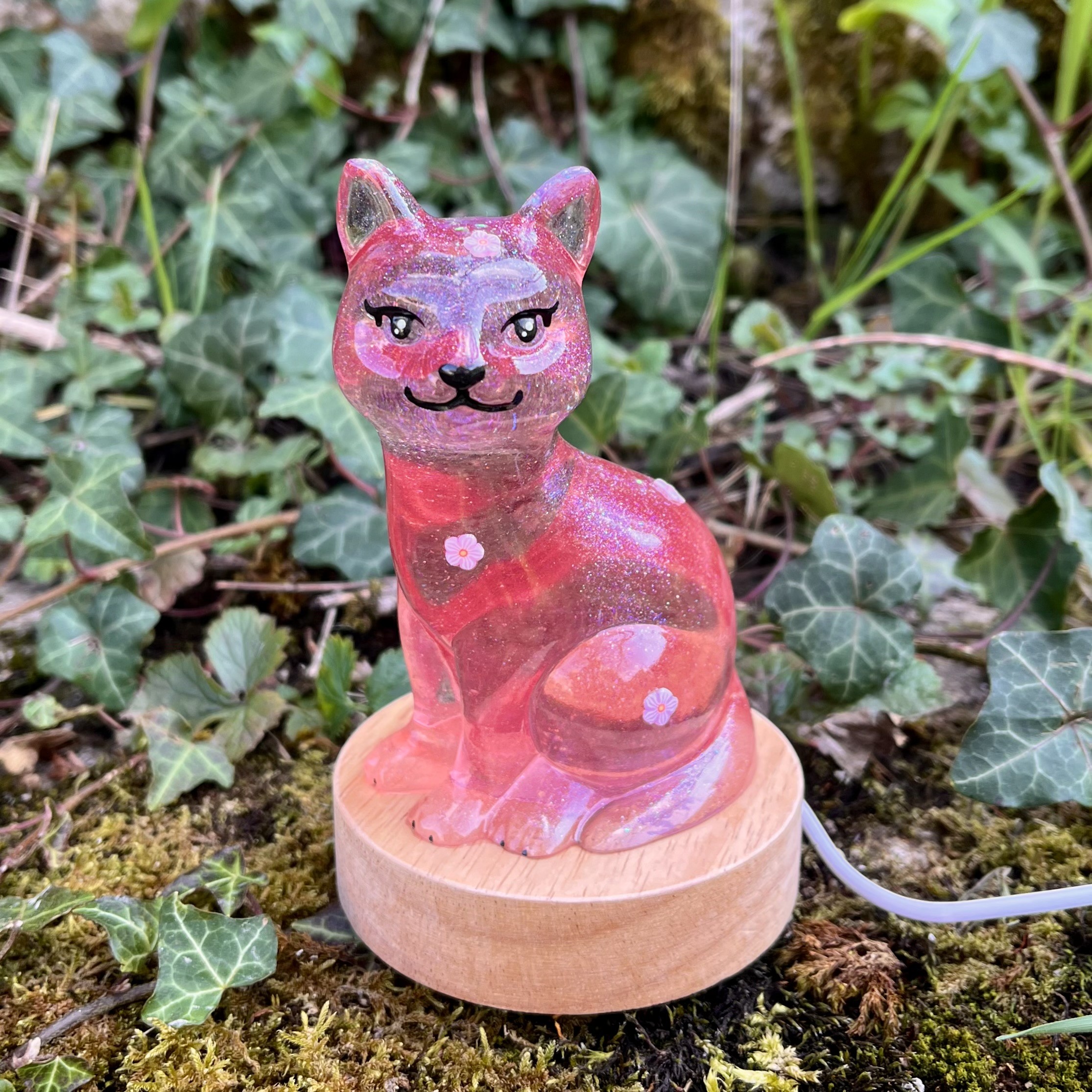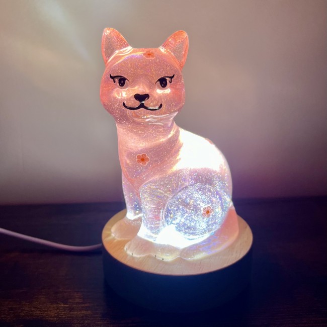✰ Lampe Chat, faite main en résine epoxy avec inclusion de fines paillettes.