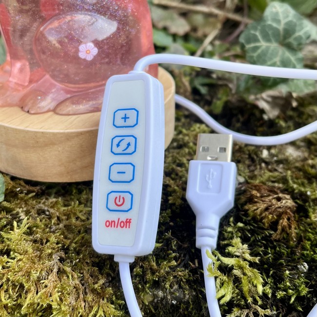 Prise USB avec câble d'1,5 mètre et interrupteur marche/arrêt et bouton permettant de passer par 3 modes d'éclairage : neutre, chaud (teinte jaune), froid (teinte bleutée).