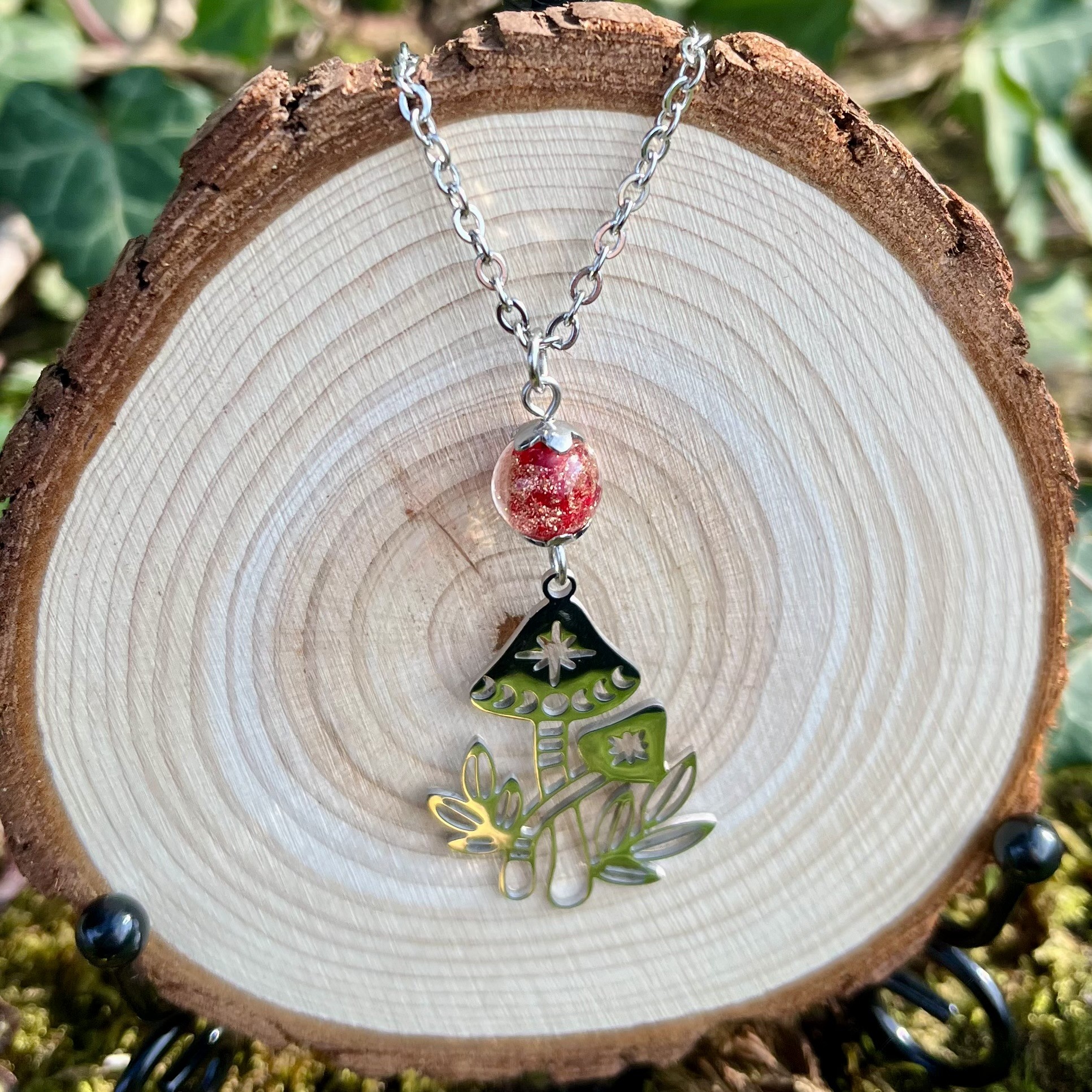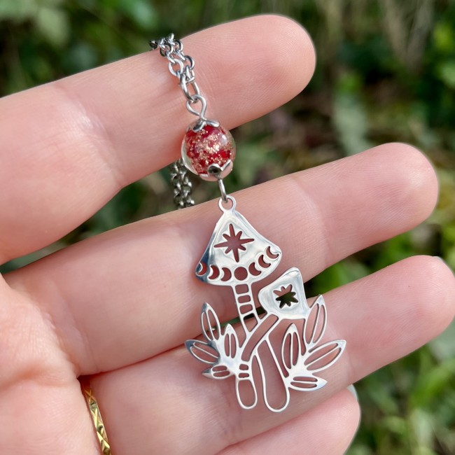 ✰ Collier champignons monté main avec pendentif en acier et une magnifique perle rouge en verre.