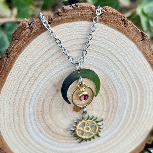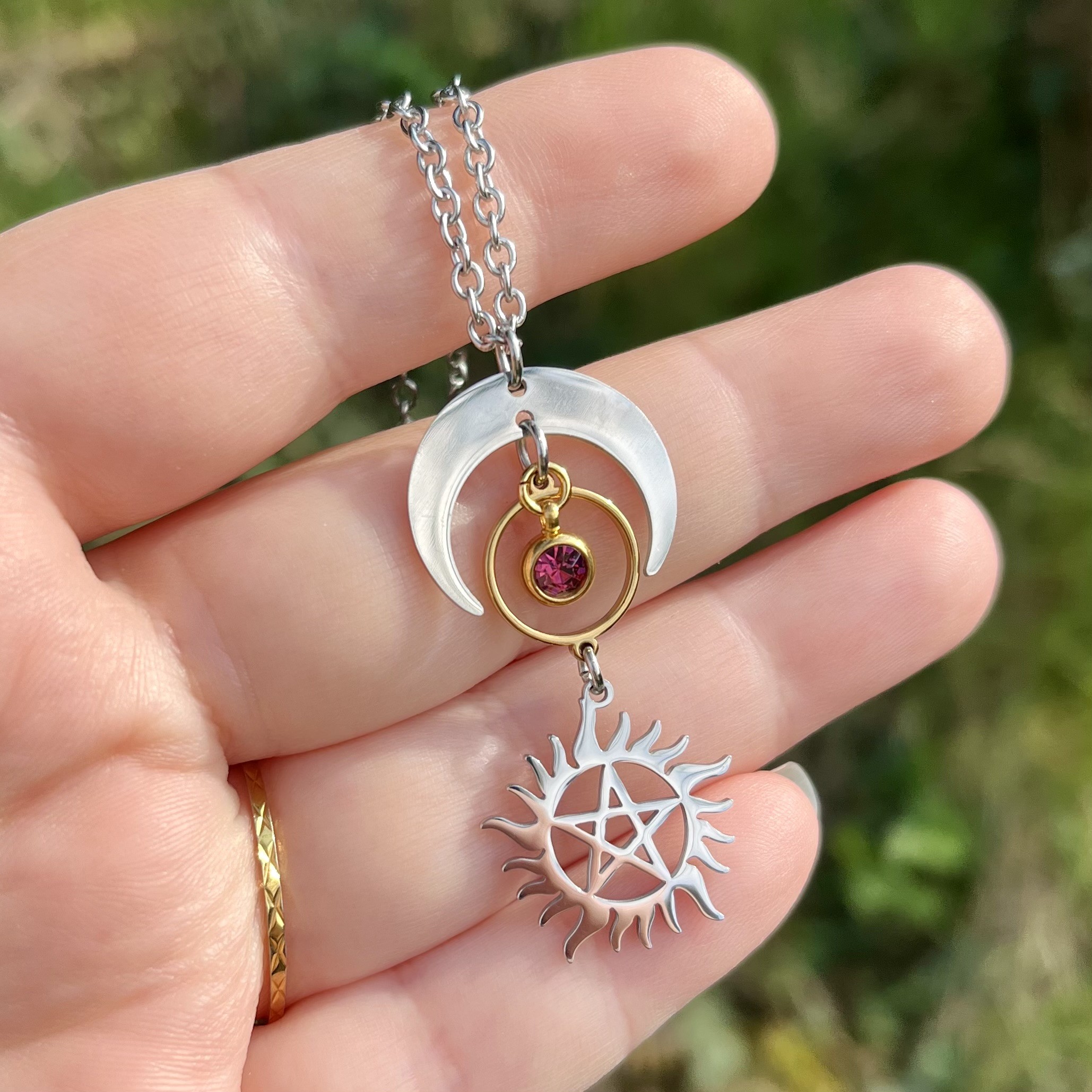 ✰ Collier Supernatural doré et argenté monté main avec pendentifs en acier inoxydable et une perle strass rosé.