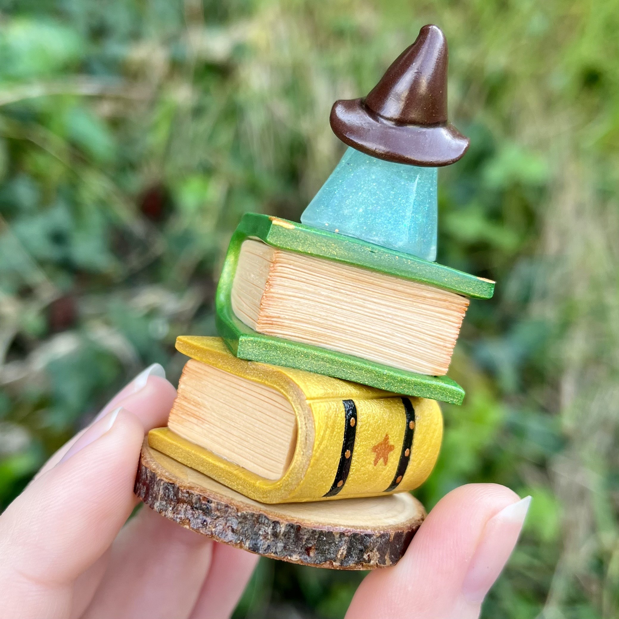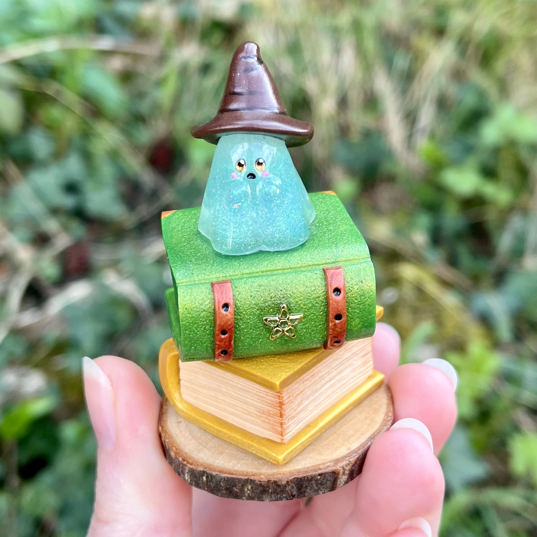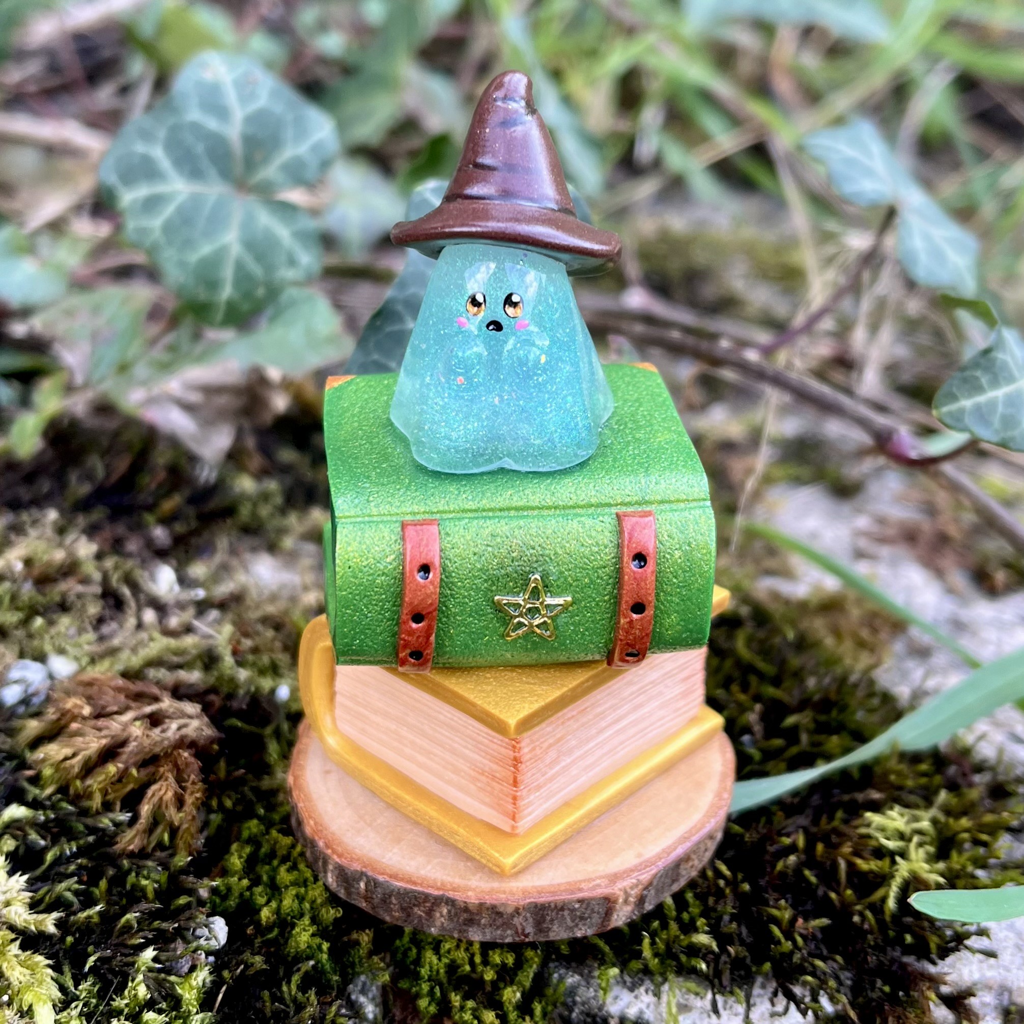 ✰ Figurine fantôme sorcier en résine, avec chapeau et livres en pâte fimo.