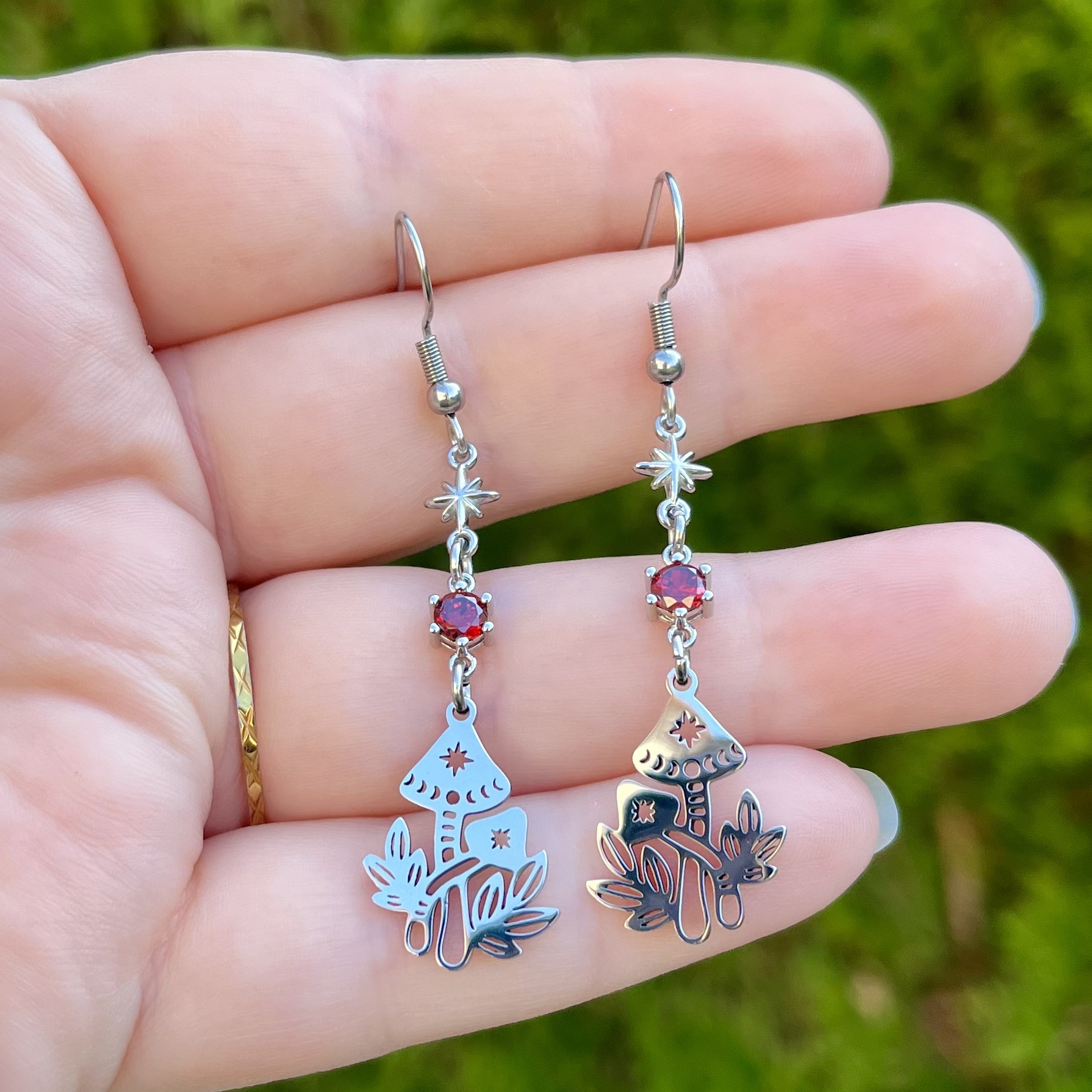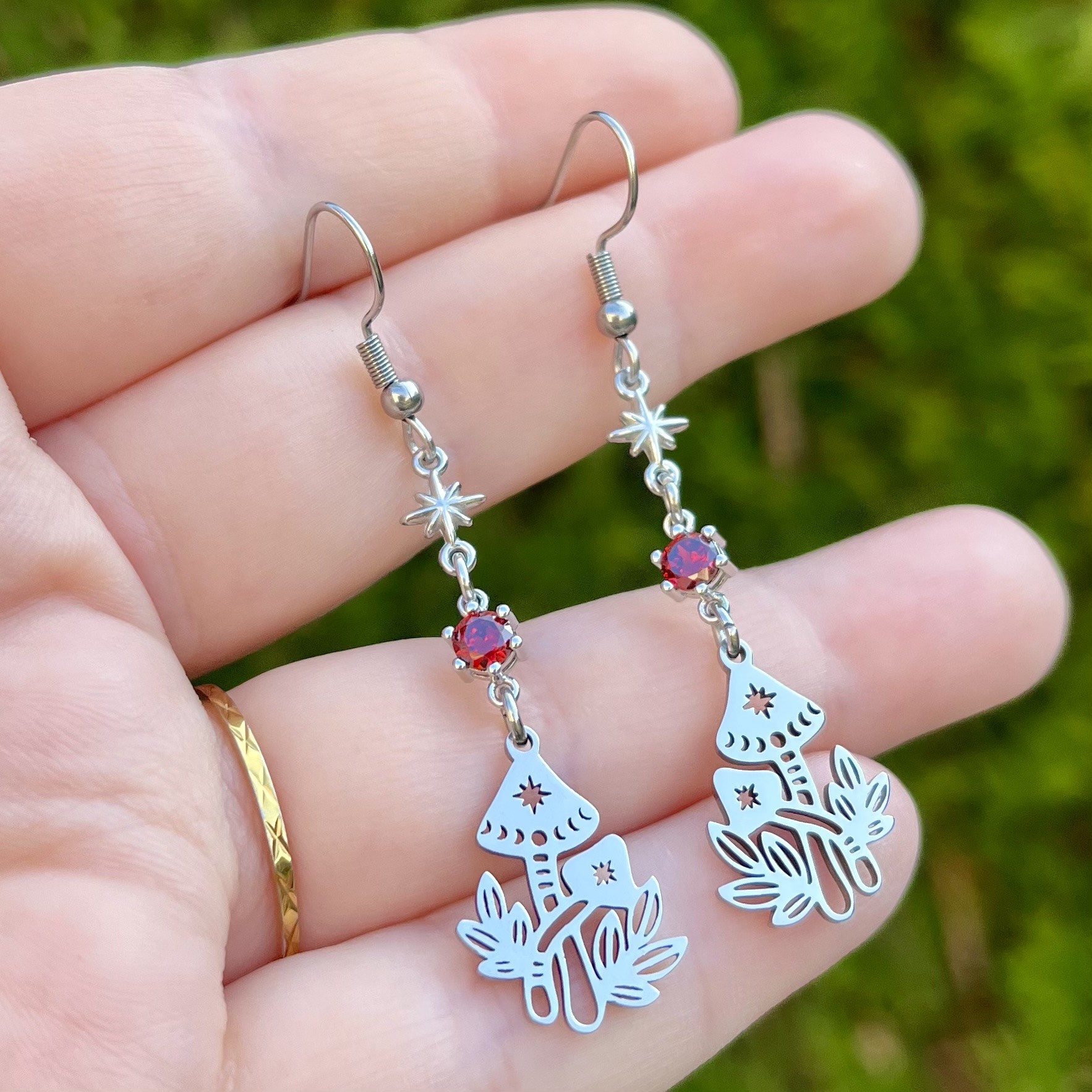 ✰ Paire de boucles d'oreilles champignons montée main, avec breloques en acier inoxydable et connecteurs rouges.