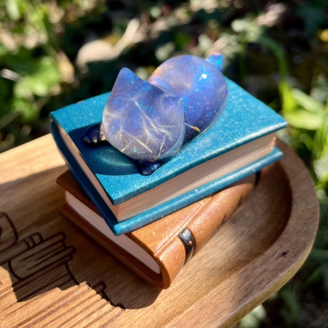 Chat réalisé en résine epoxy avec inclusions de graines de pissenlit et paillettes irisées.