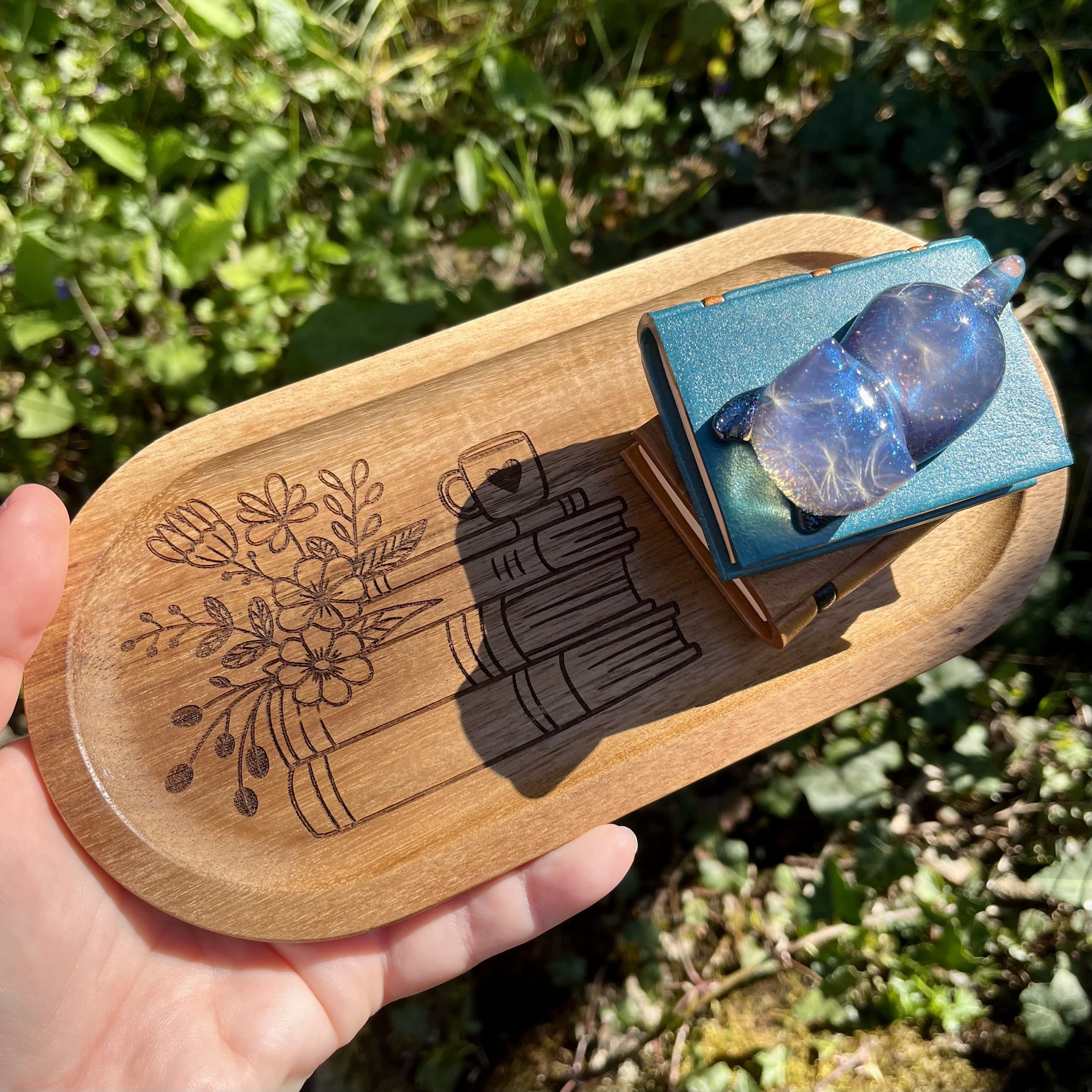 ✰ Coupelle en bois (acacia), poncée, gravée et vernie, décorée d'une figurine Chat et livres.